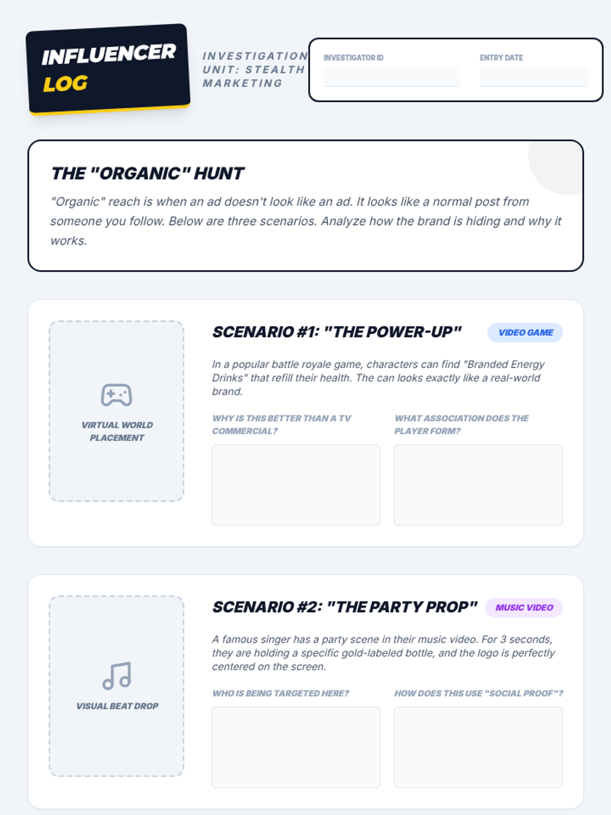 Students investigate subtle marketing in video games, music videos, and influencer posts, discussing why 'organic' reach is effective on youth.