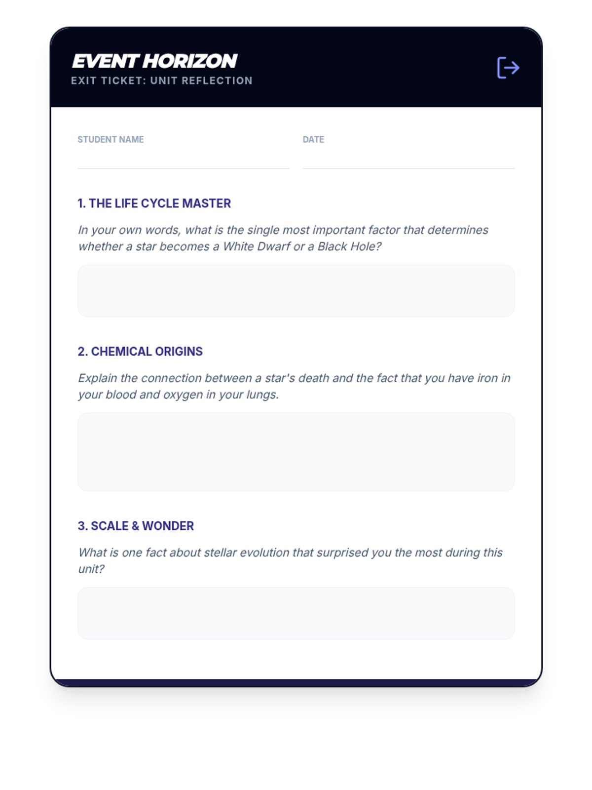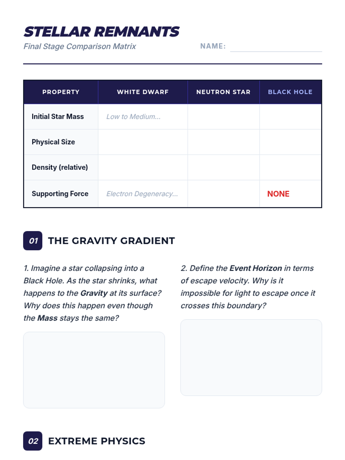 The final lesson investigates the extreme physics of stellar remnants, exploring density, escape velocity, and event horizons. Students compare white dwarfs, neutron stars, and black holes.