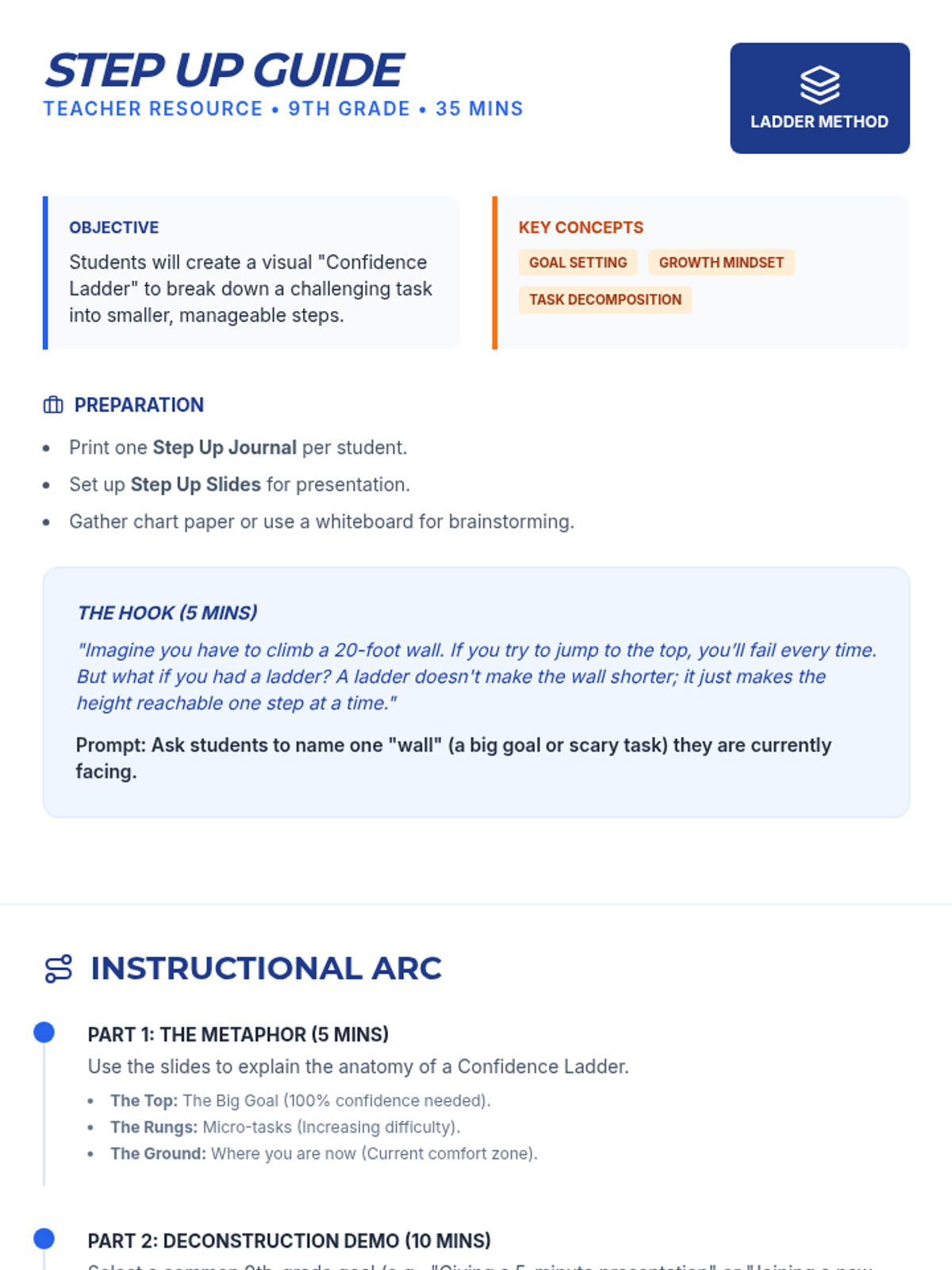 A 35-minute workshop for 9th graders to master task decomposition using the 'Confidence Ladder' metaphor, fostering a growth mindset and actionable goal setting.