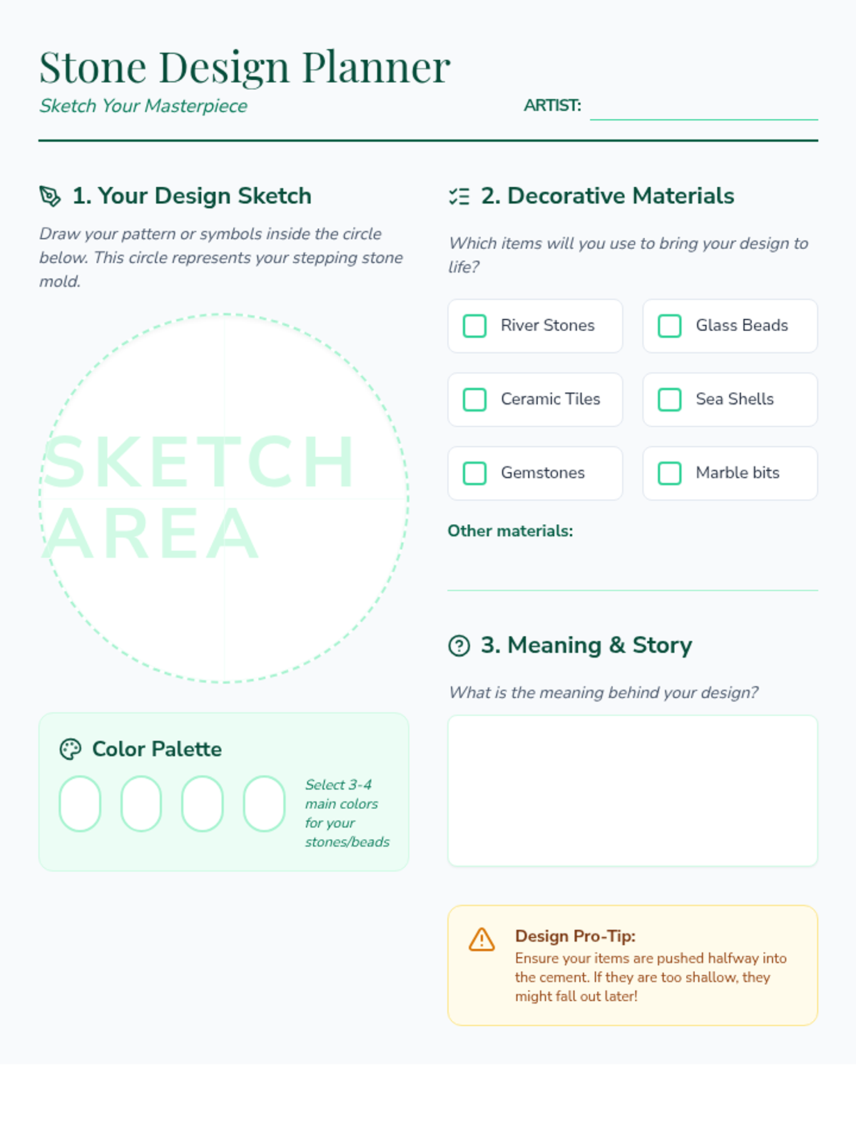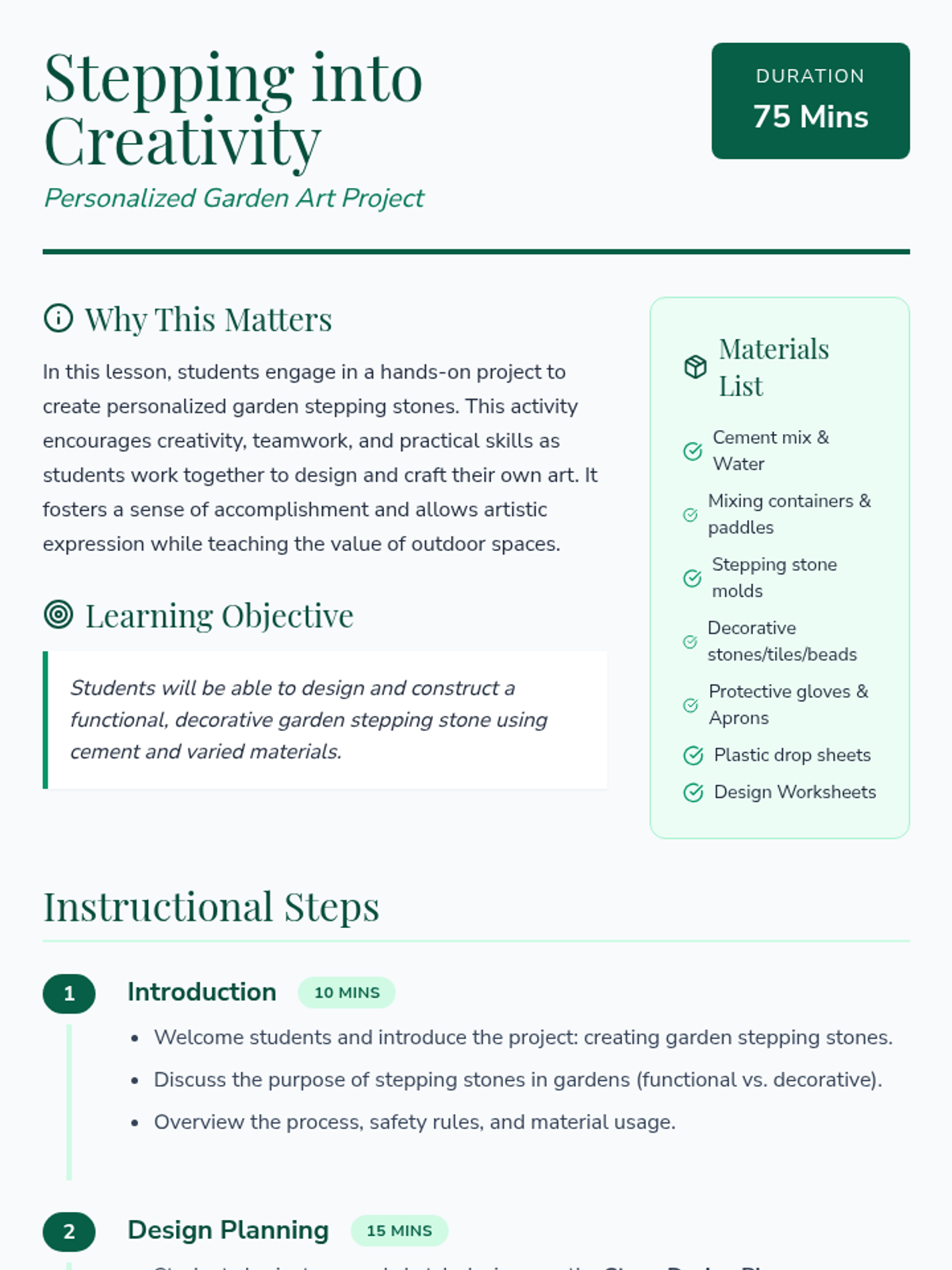 A hands-on art and gardening lesson where students design and create their own personalized cement stepping stones, fostering creativity and teamwork.