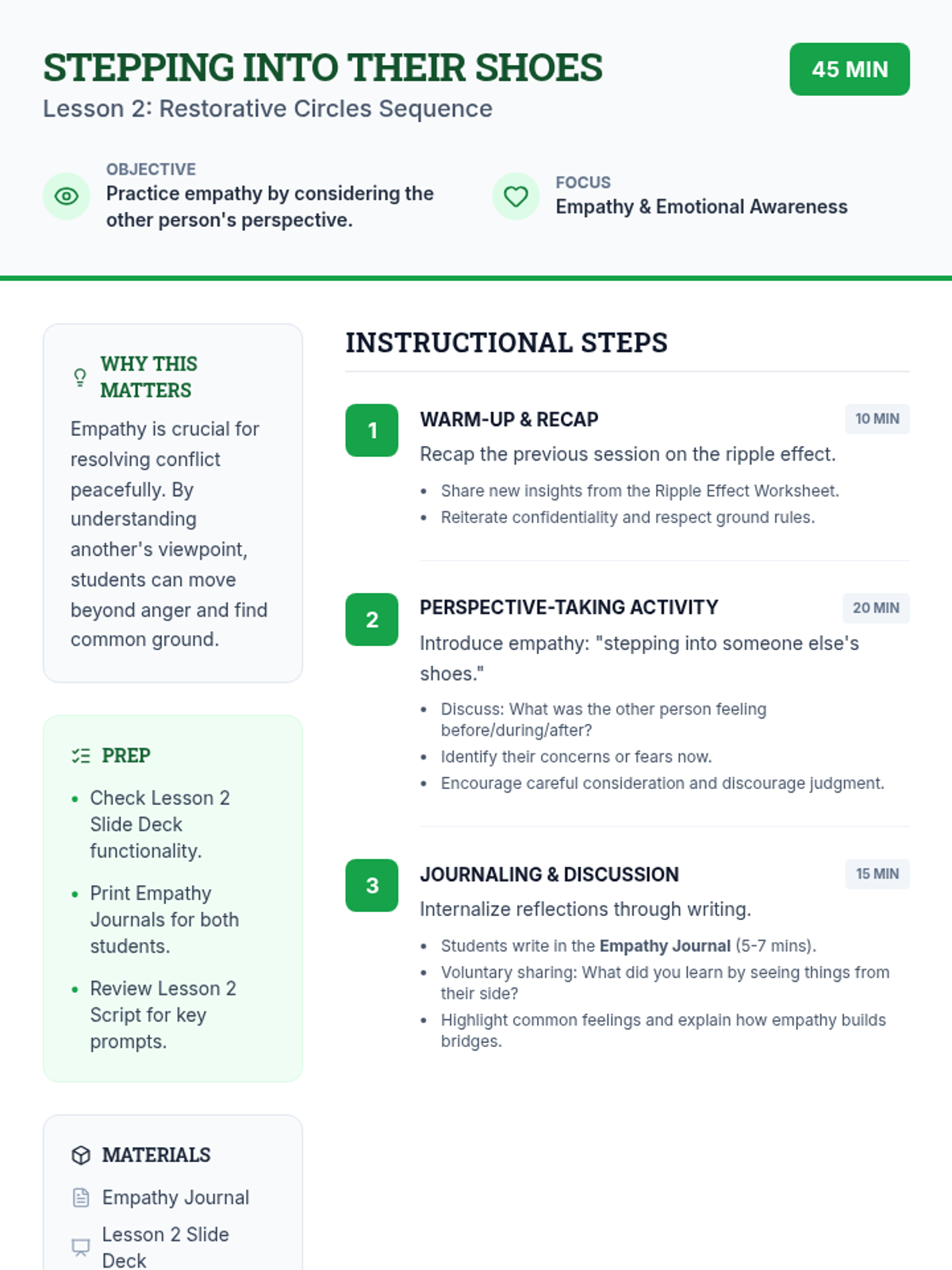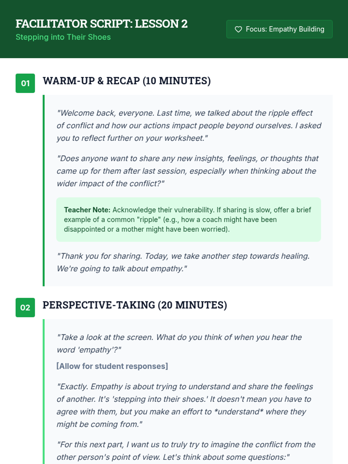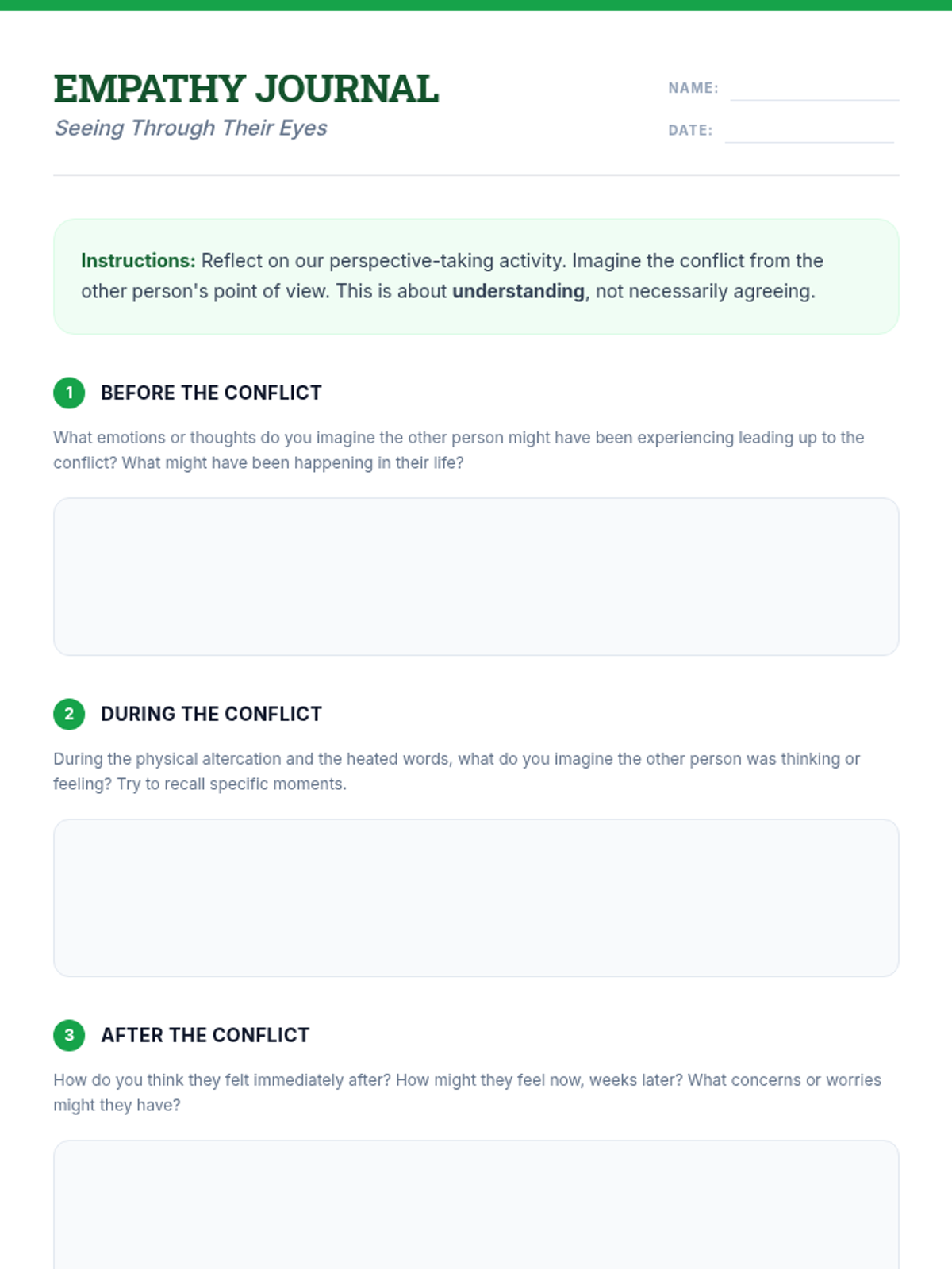 Focuses on perspective-taking and empathy, encouraging students to consider the thoughts and feelings of the other person involved in the conflict.