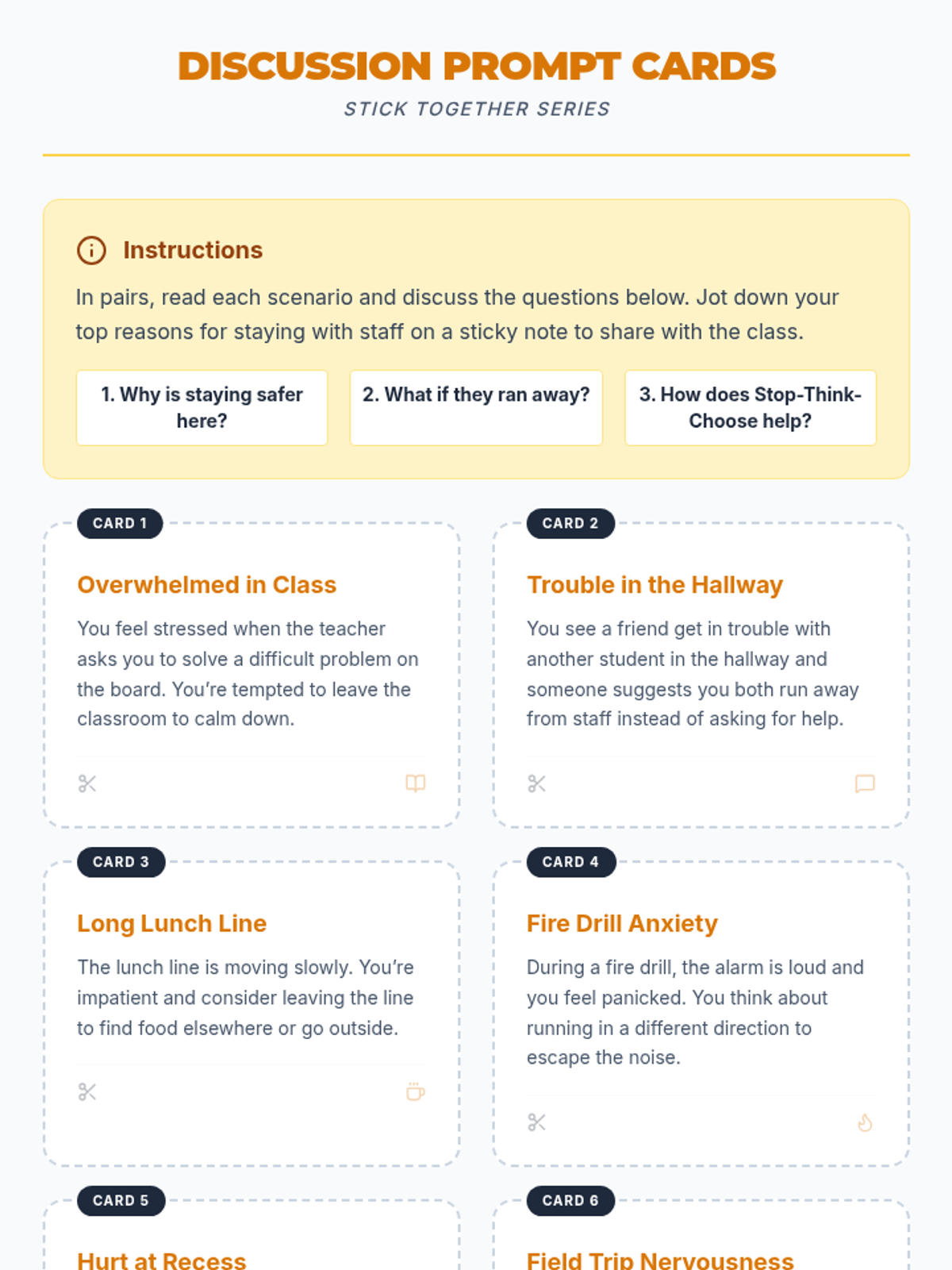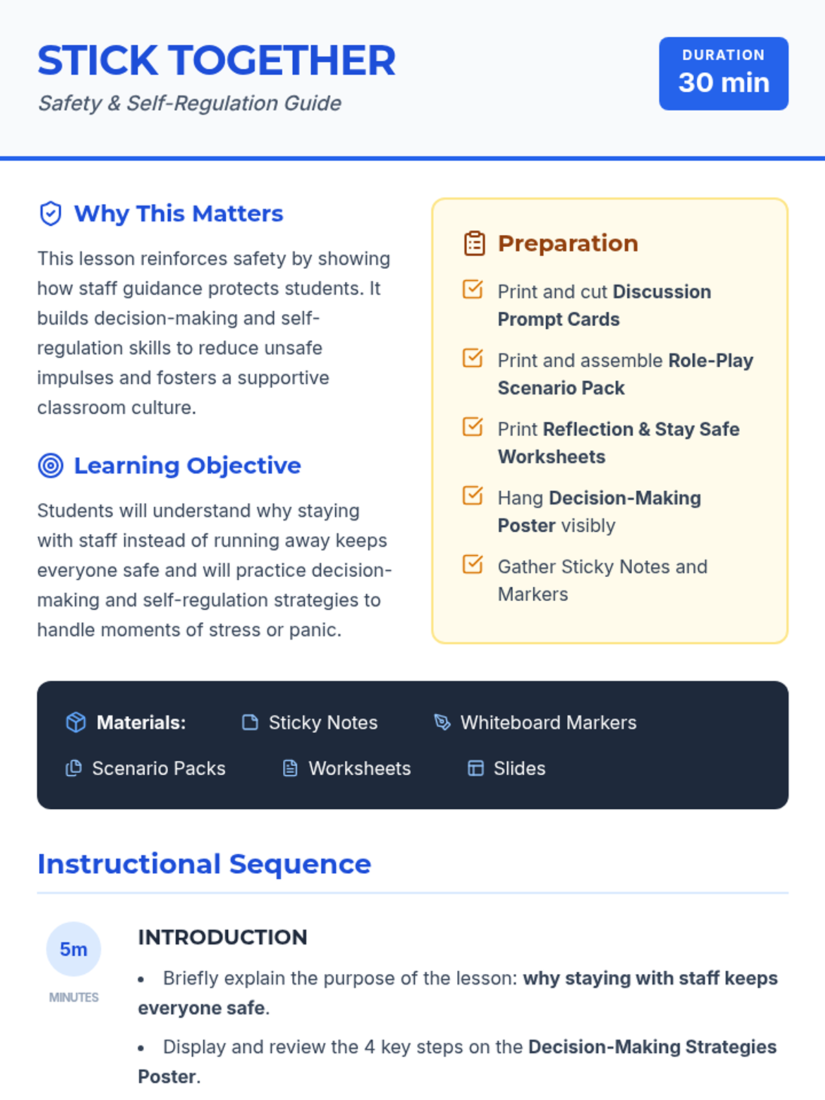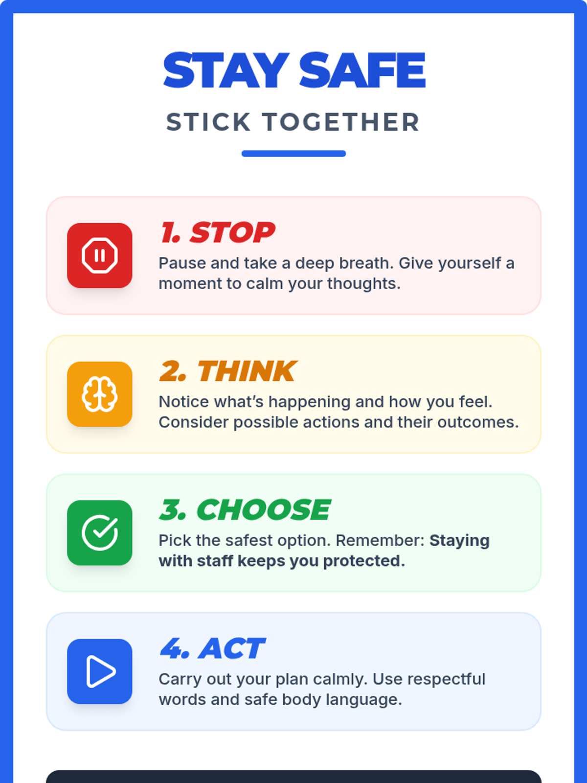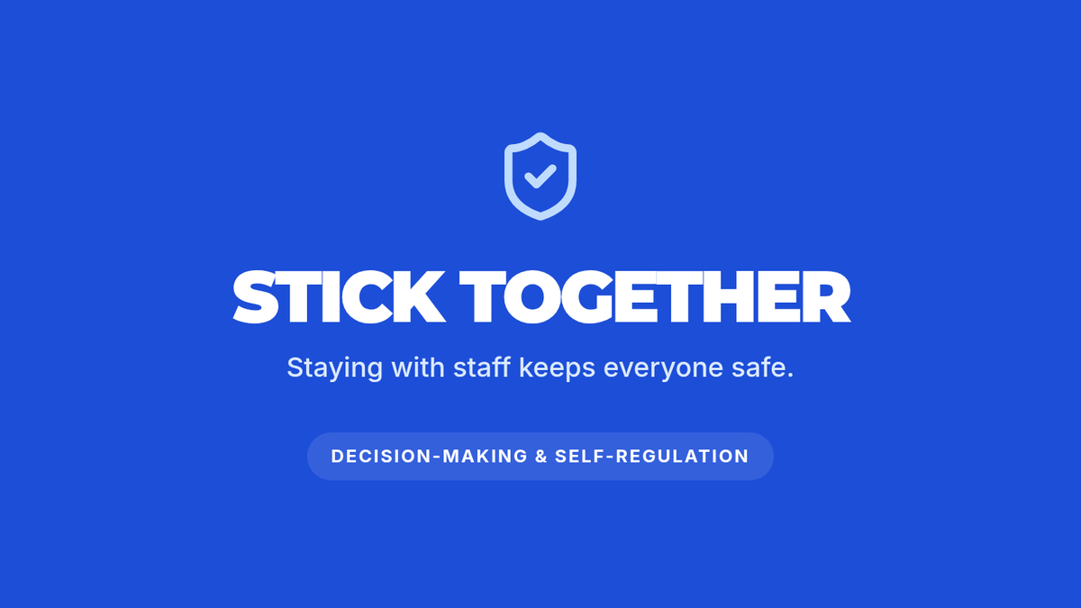 A 30-minute Tier 1 lesson for 7th graders that teaches students the importance of staying with staff during moments of stress and provides a four-step framework (Stop, Think, Choose, Act) for self-regulation and safety.