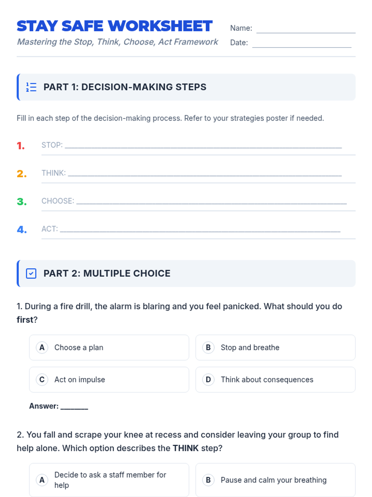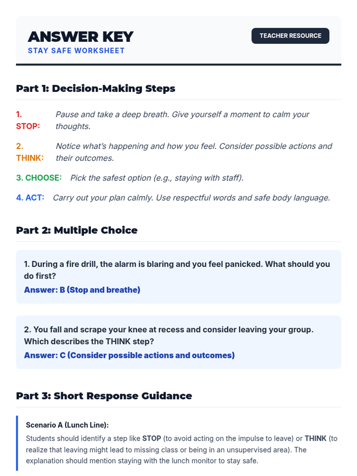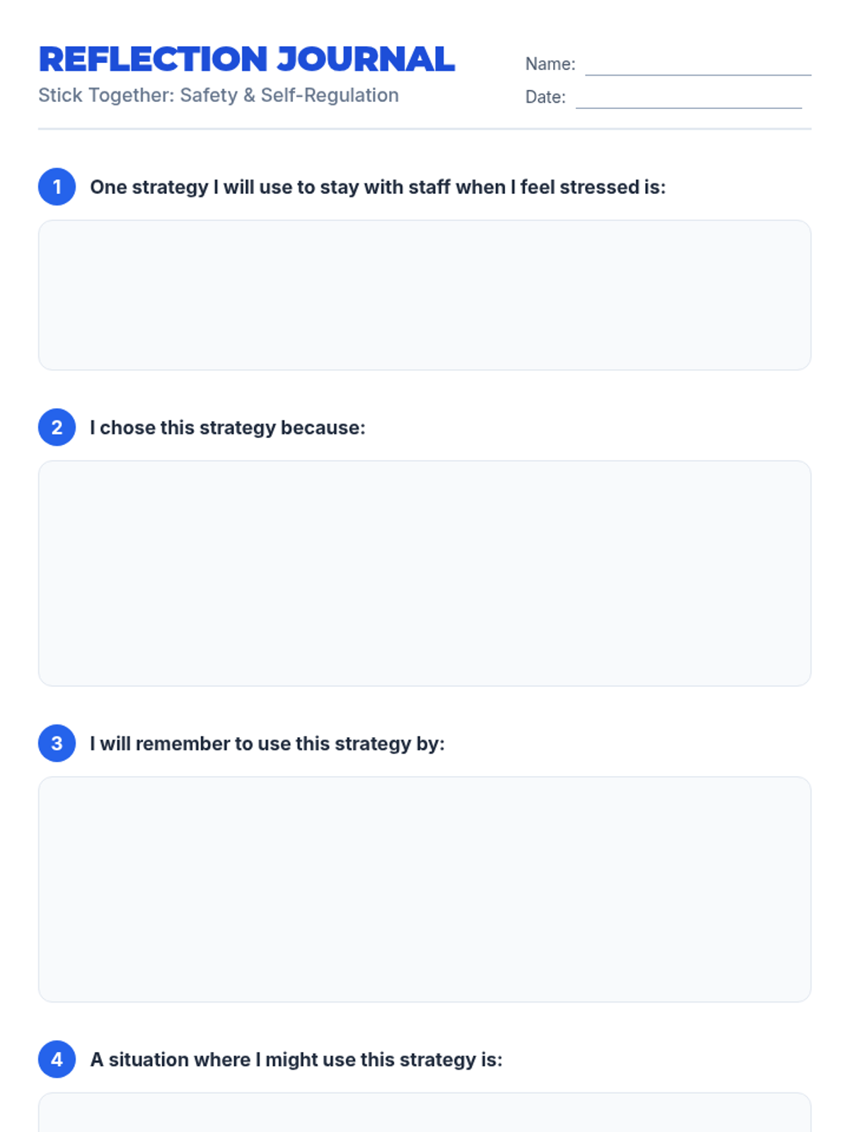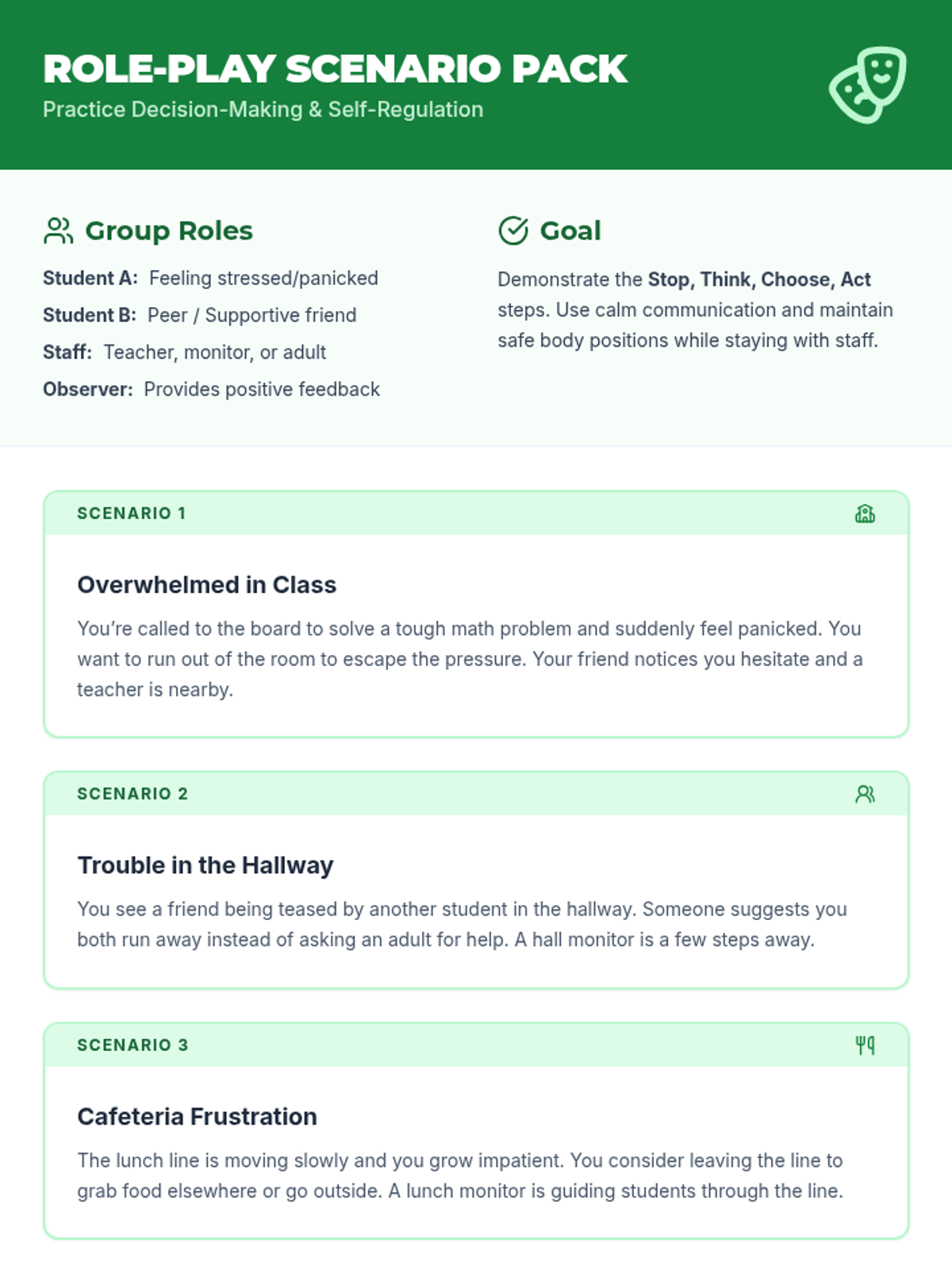 A 30-minute Tier 1 lesson for 7th graders that teaches students the importance of staying with staff during moments of stress and provides a four-step framework (Stop, Think, Choose, Act) for self-regulation and safety.
