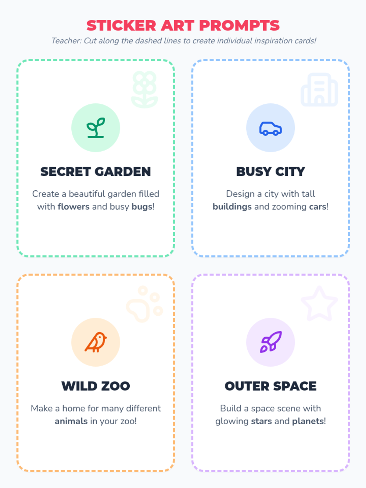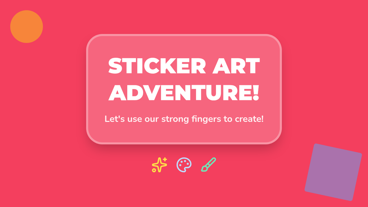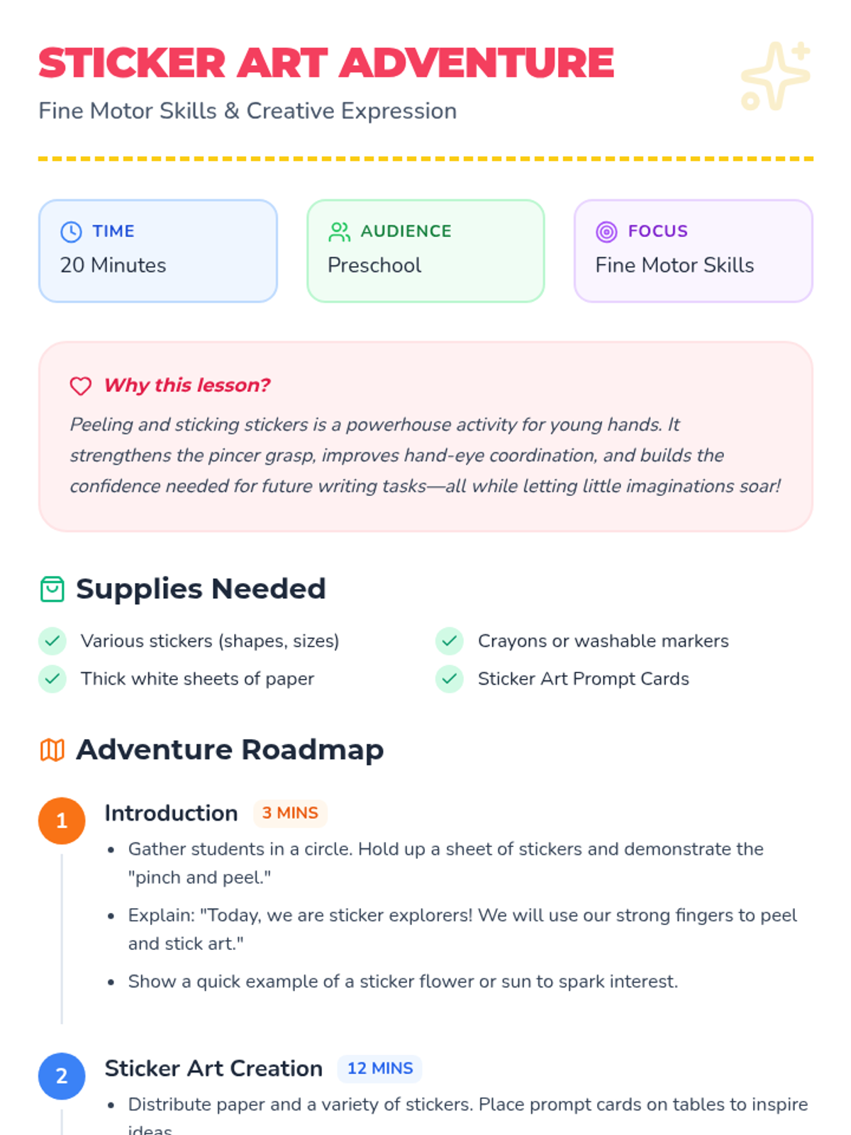 A creative preschool lesson focused on developing fine motor skills and hand-eye coordination through sticker art. Students will use various stickers and drawing tools to respond to imaginative prompts.