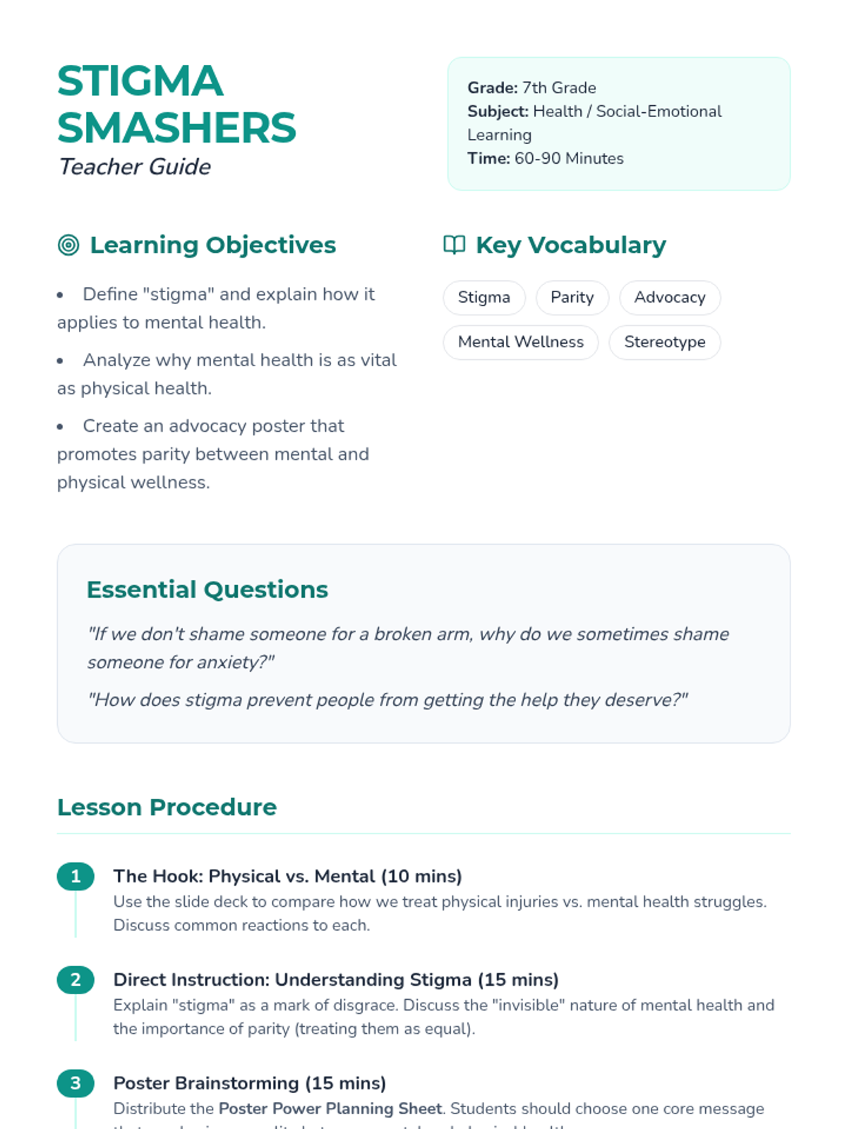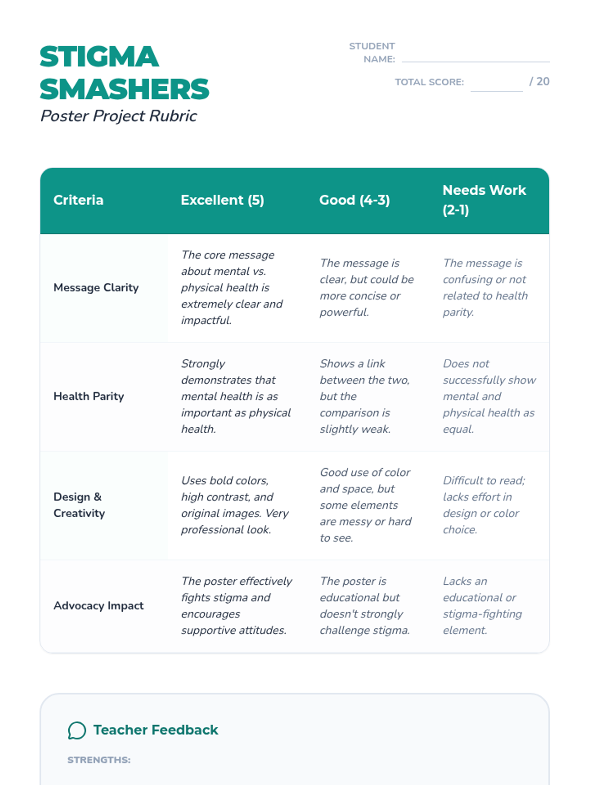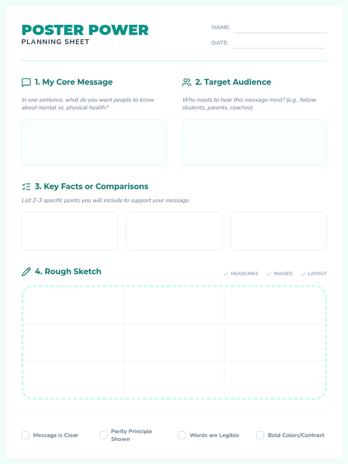 Students explore the parity between mental and physical health, learn about mental health stigma, and design advocacy posters to spread awareness and encourage equality in health care and perception.