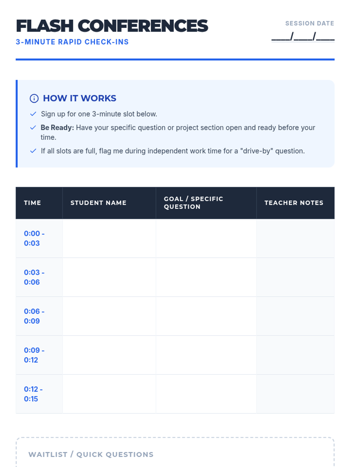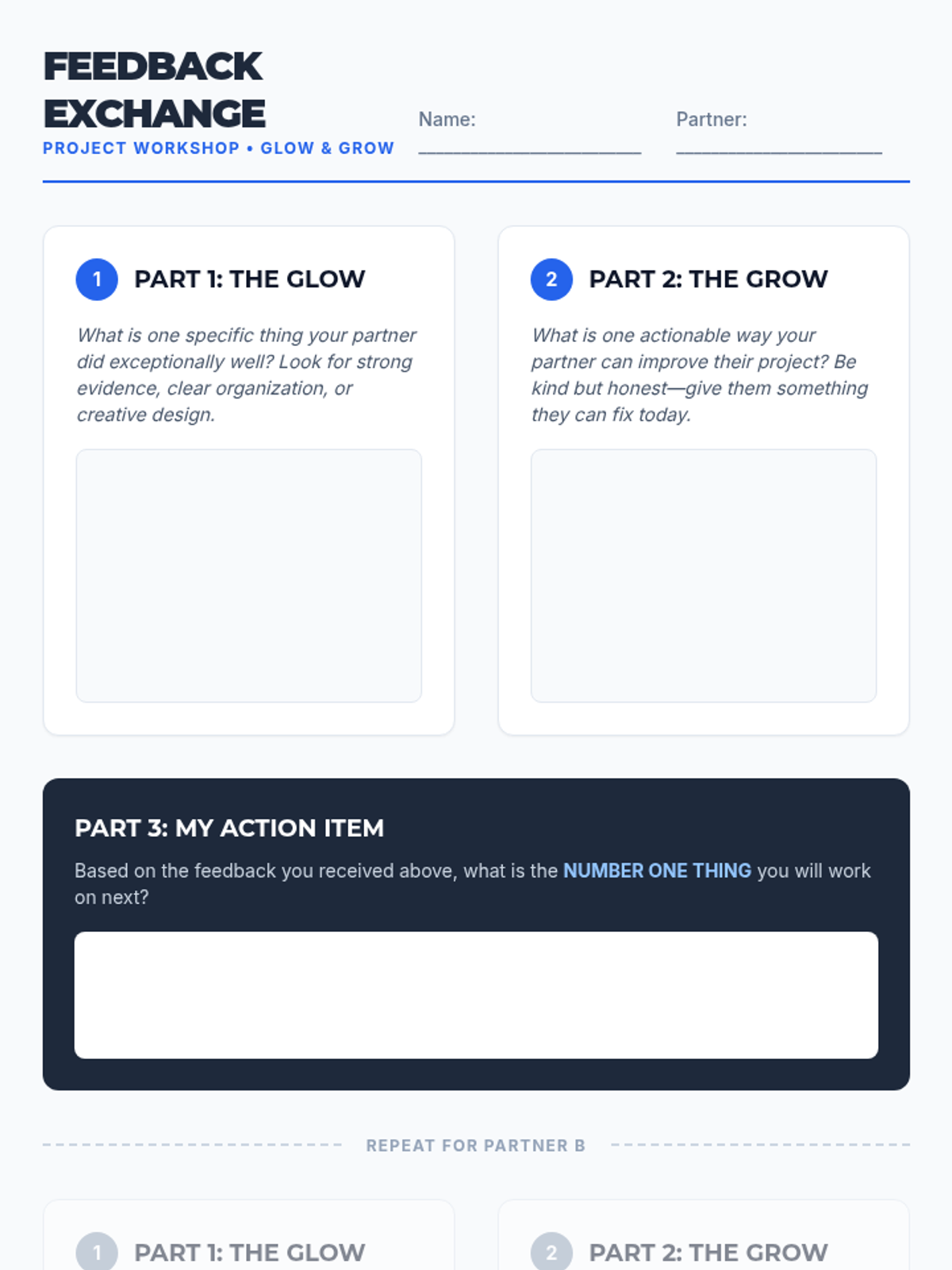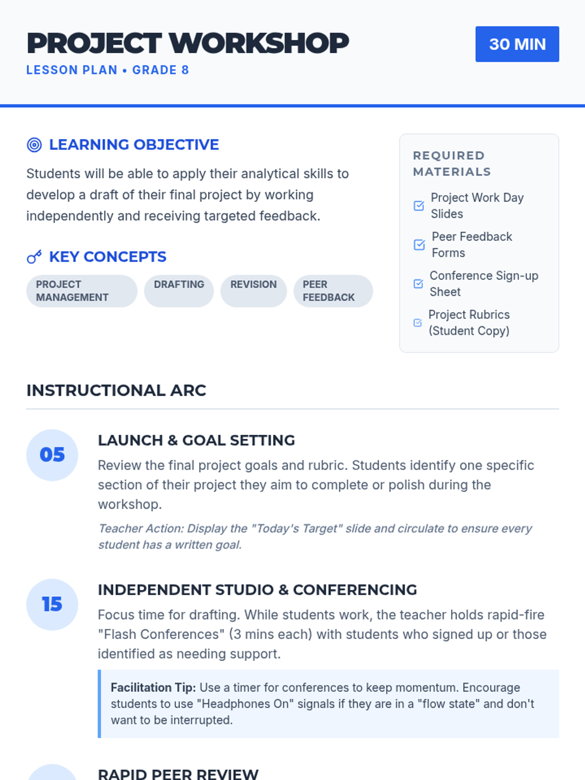 A 30-minute workshop-style lesson where 8th-grade students move their final projects forward through focused independent work, targeted teacher conferencing, and structured peer feedback.