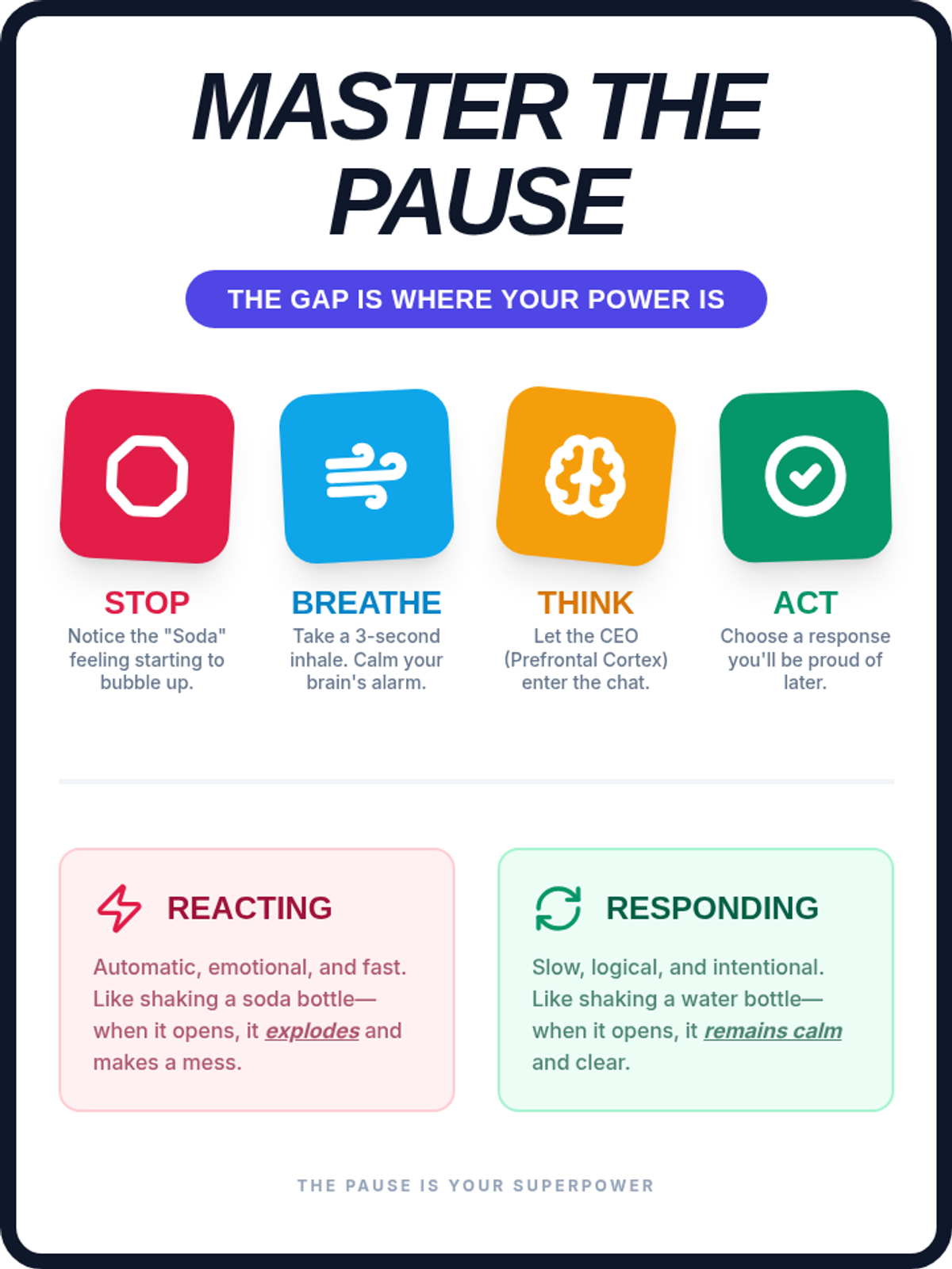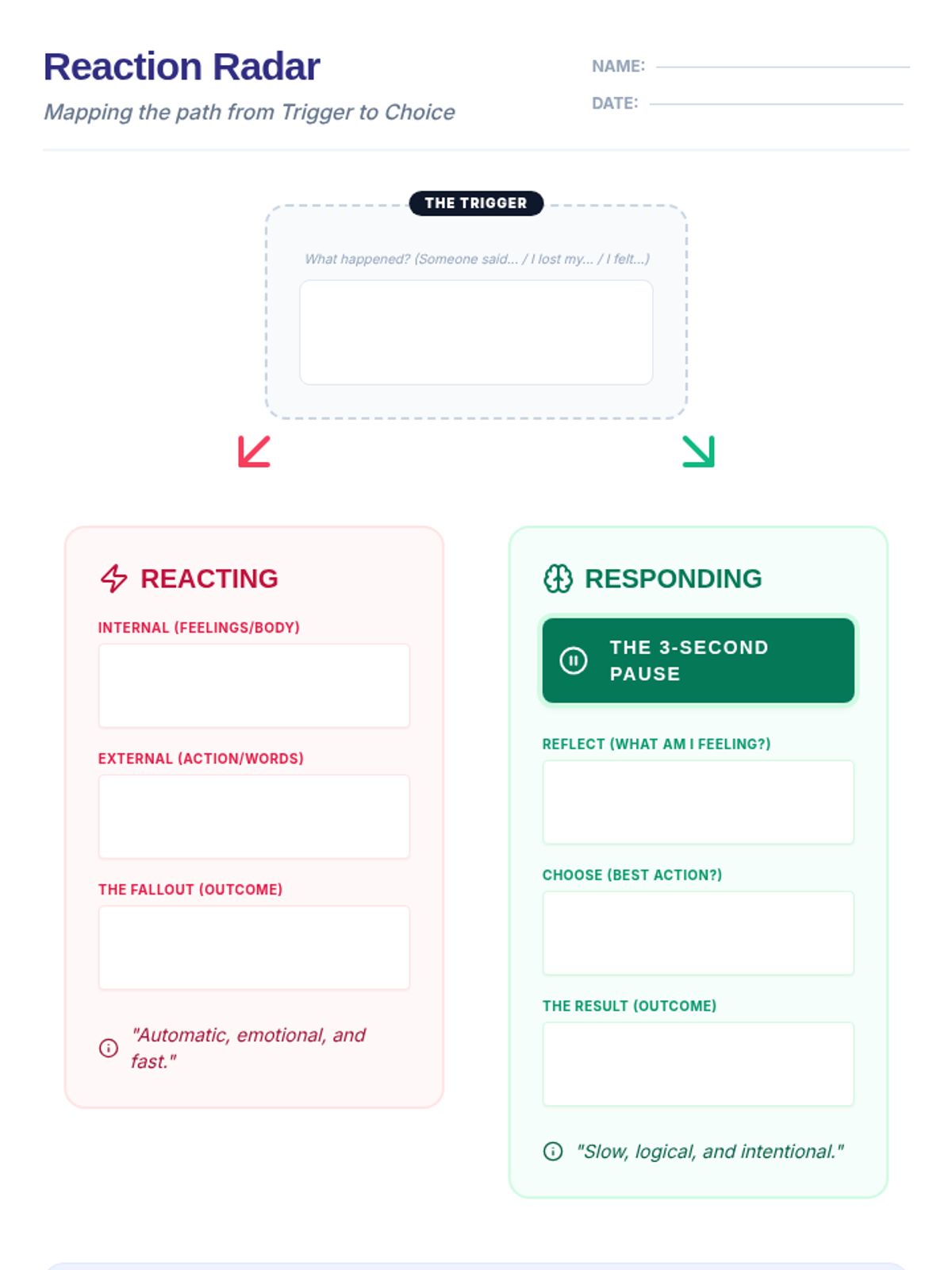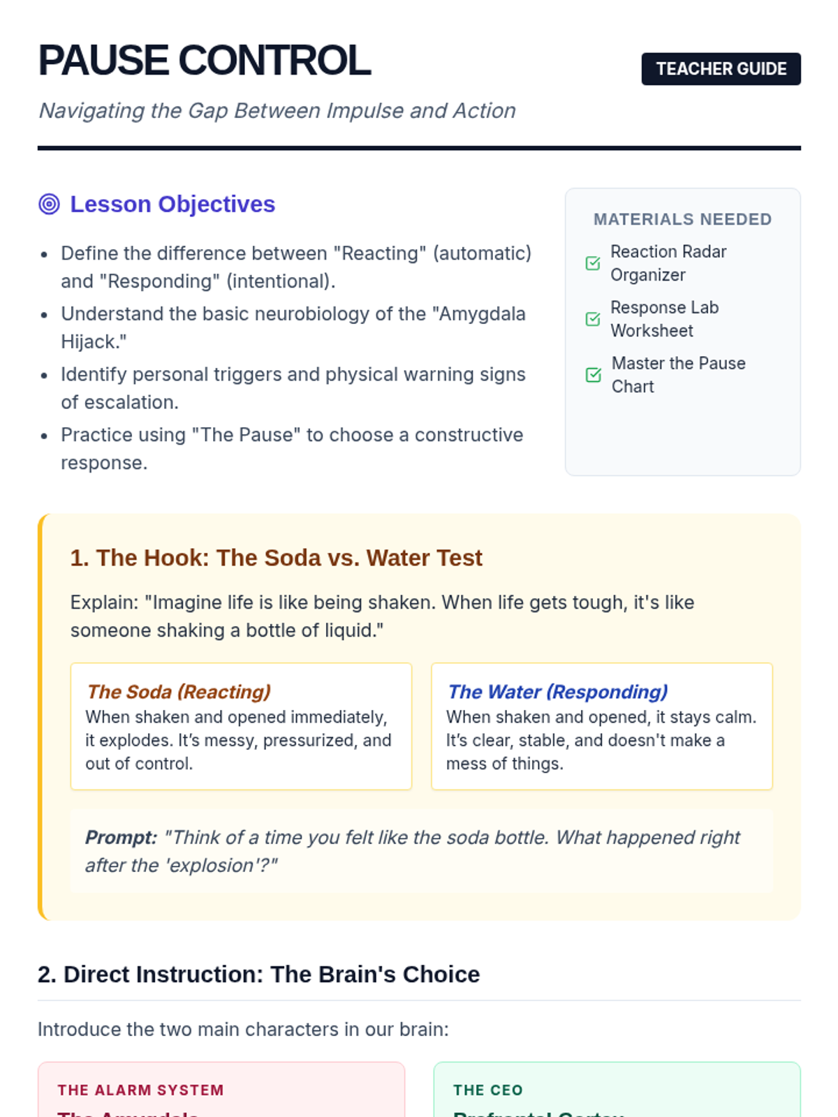 A comprehensive lesson designed for 8th-grade students to understand the neurobiological and behavioral differences between reacting impulsively and responding mindfully. The lesson includes a guide for the educator, a graphic organizer for conceptual mapping, a scenario-based worksheet, and a visual anchor chart.