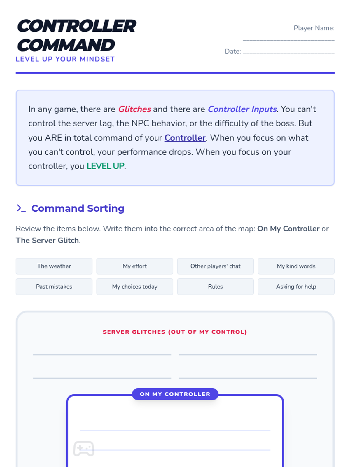 A CBT-based lesson for youth focused on identifying and focusing on things within their control, using a video game 'Controller Command' theme.