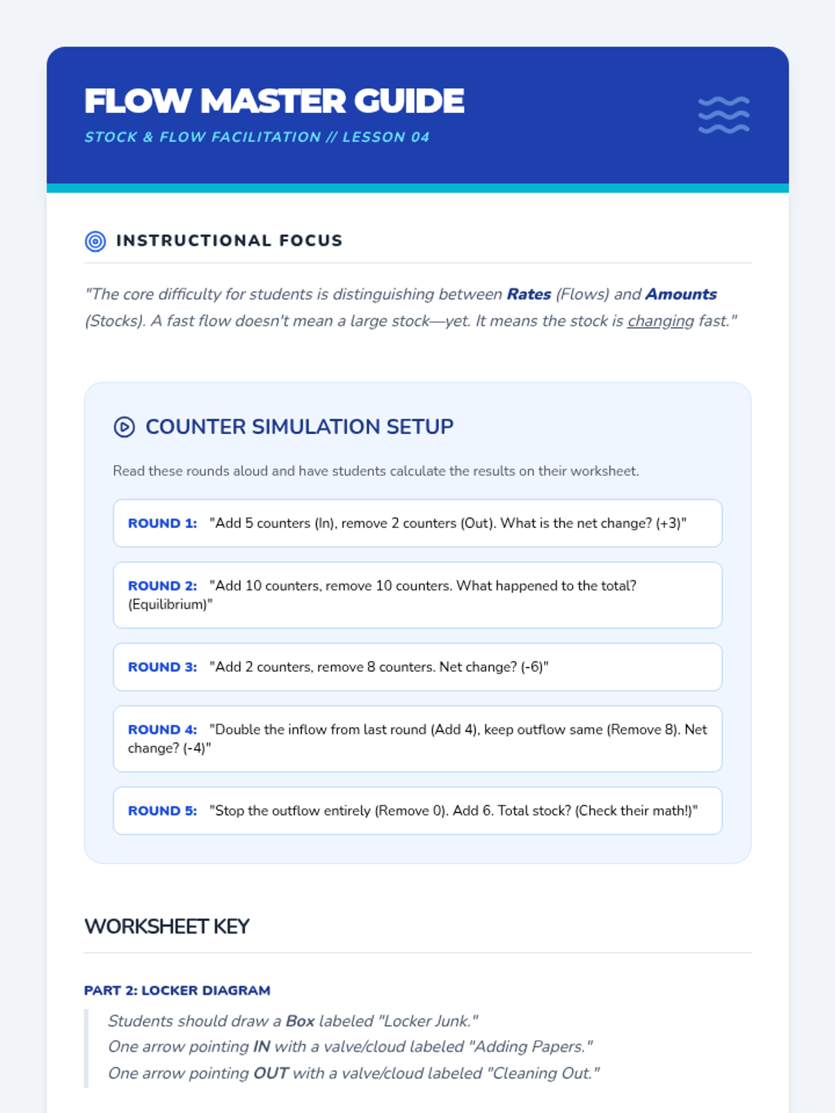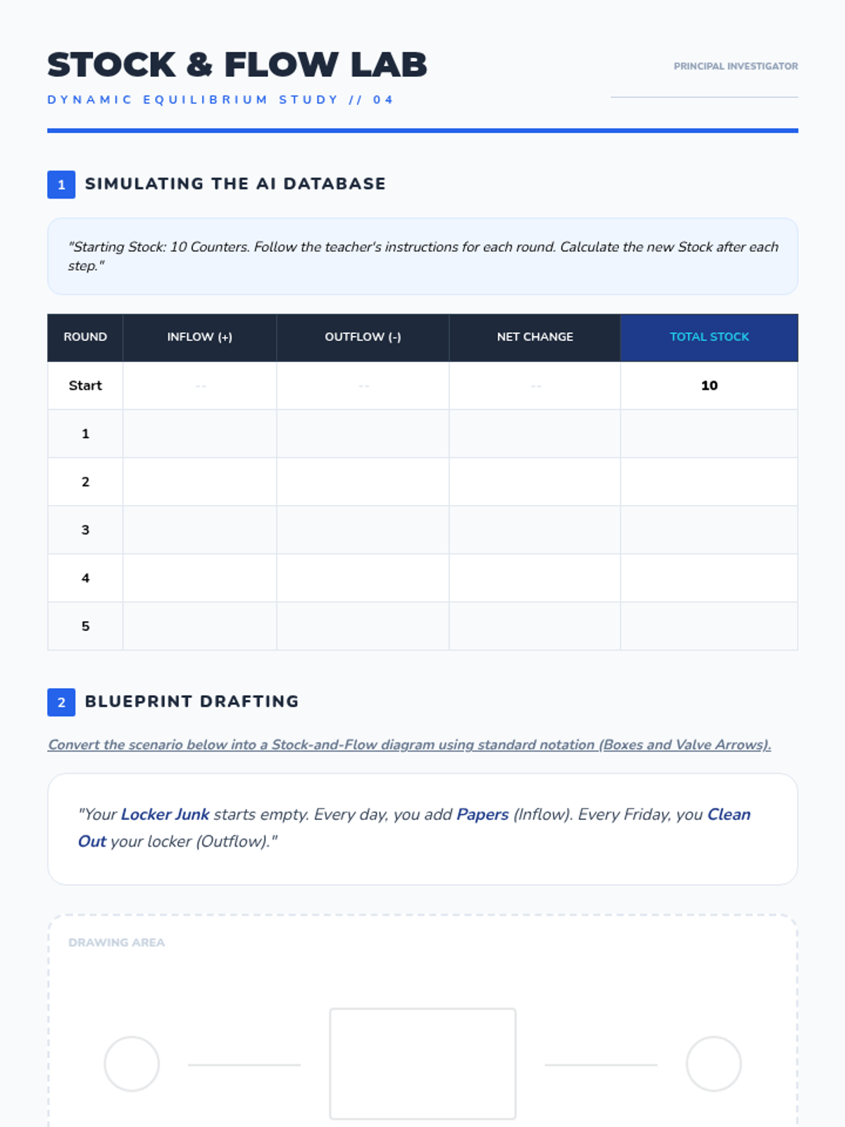 Students learn the difference between 'Stocks' (accumulations, like water in a tub or data in a server) and 'Flows' (rates of change). They create physical models using water or counters to represent data accumulation in an AI database.