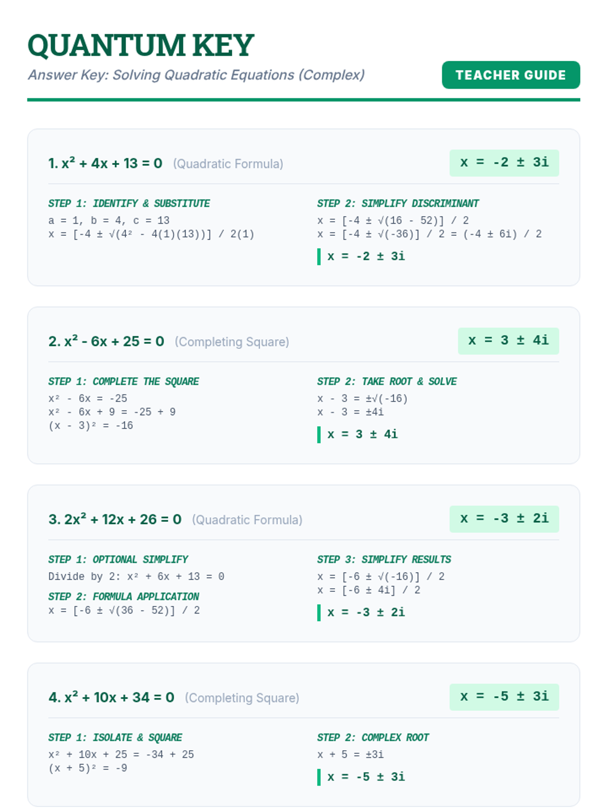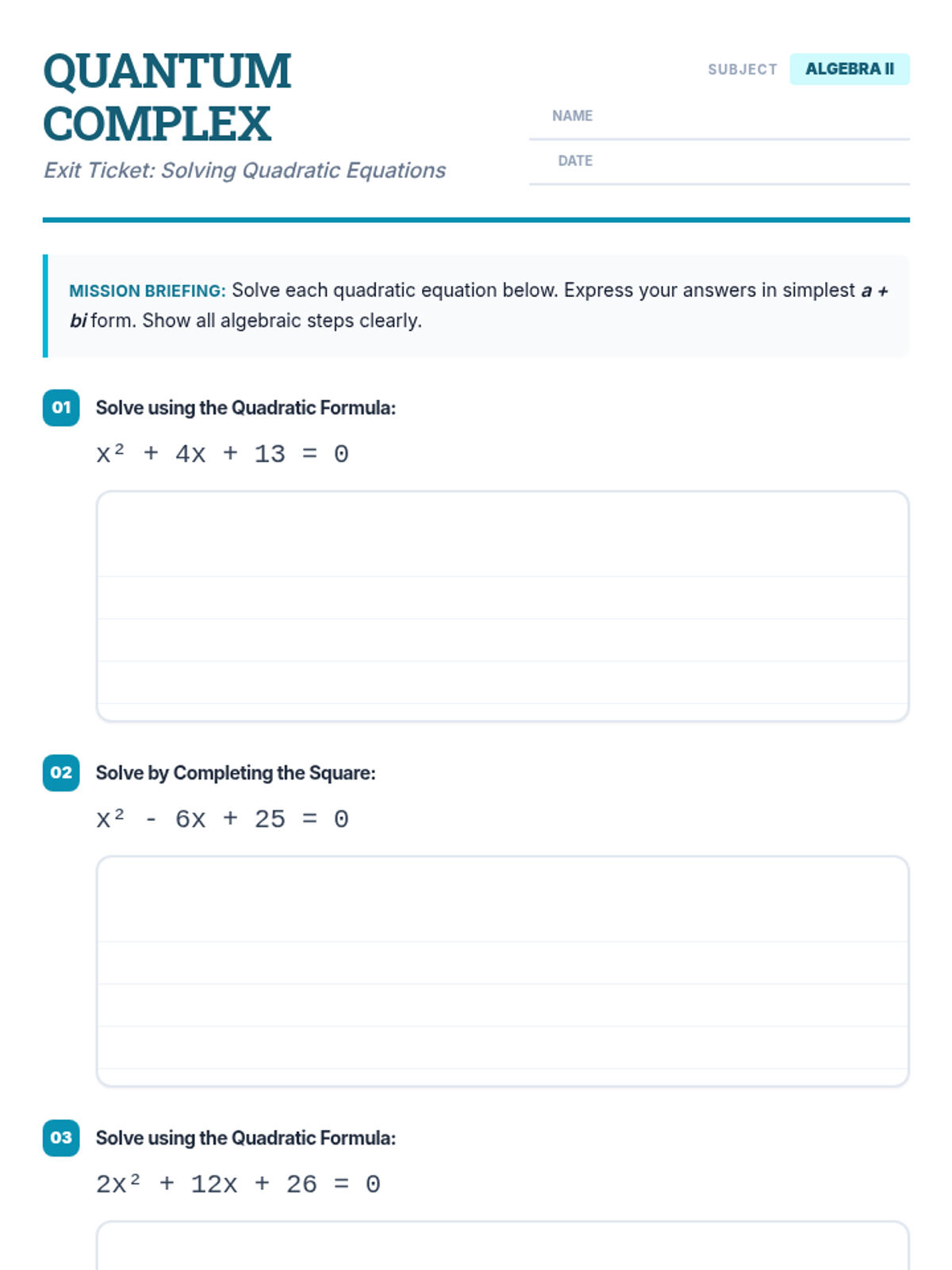 A quick assessment focusing on solving quadratic equations that result in complex solutions using the Quadratic Formula and Completing the Square.