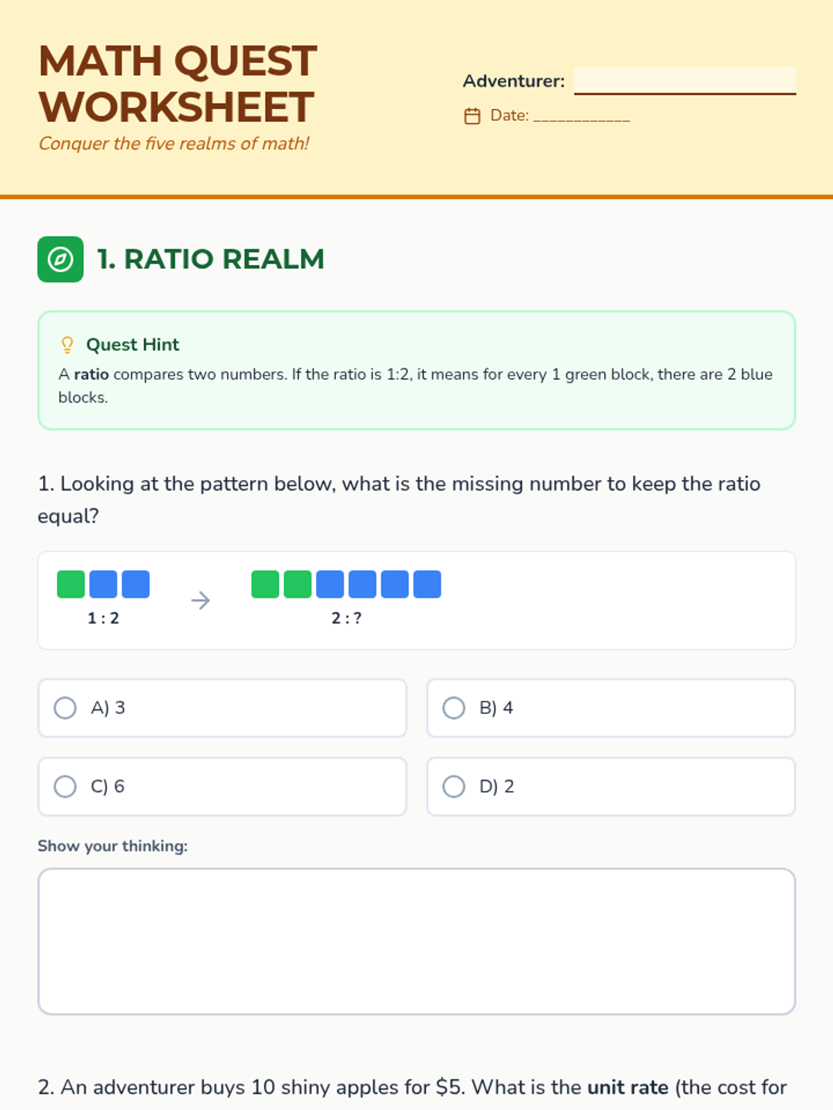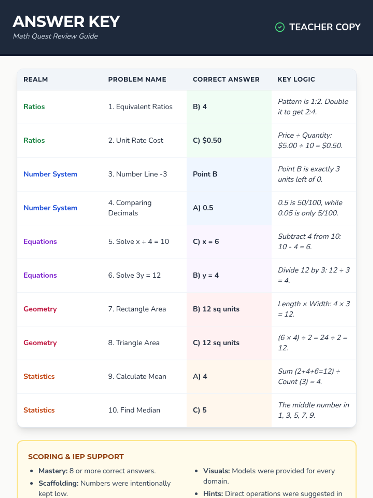 A 6th-grade math review lesson designed specifically for students with IEPs, focusing on foundational concepts in ratios, the number system, expressions, geometry, and statistics with visual scaffolds and simplified language.