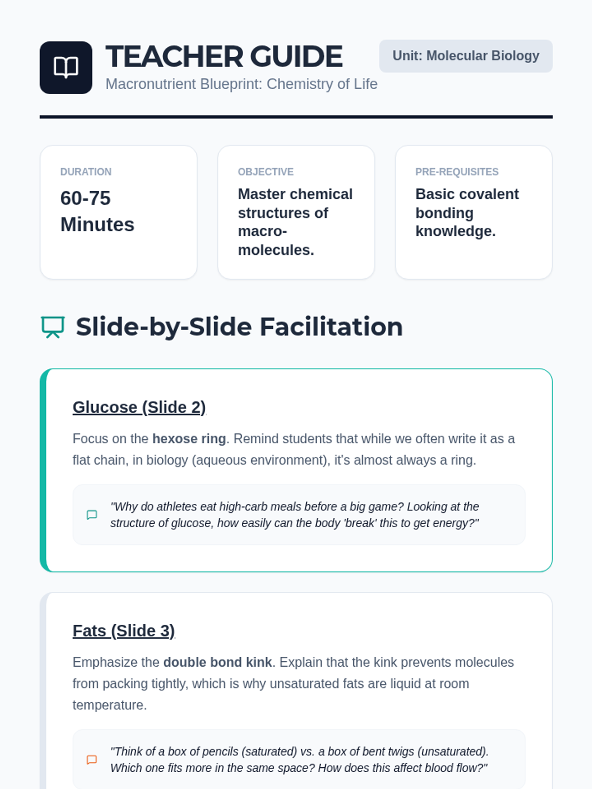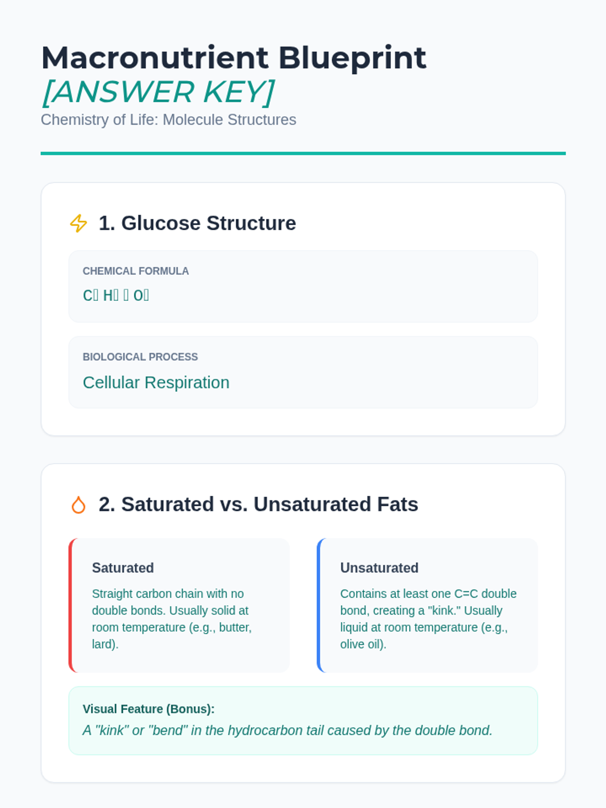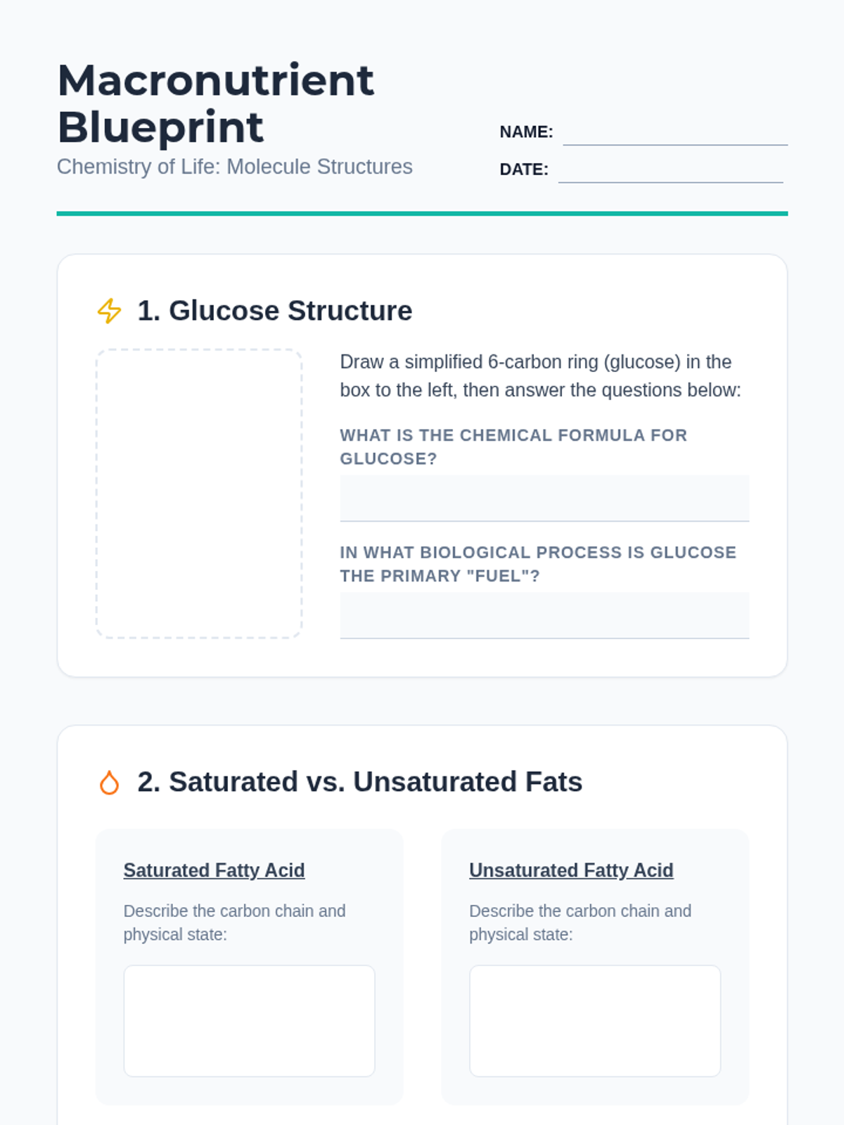 A comprehensive look at the chemical structures of carbohydrates, lipids, and proteins. Students explore glucose, fatty acids, and the complex architecture of amino acids and hemoglobin.