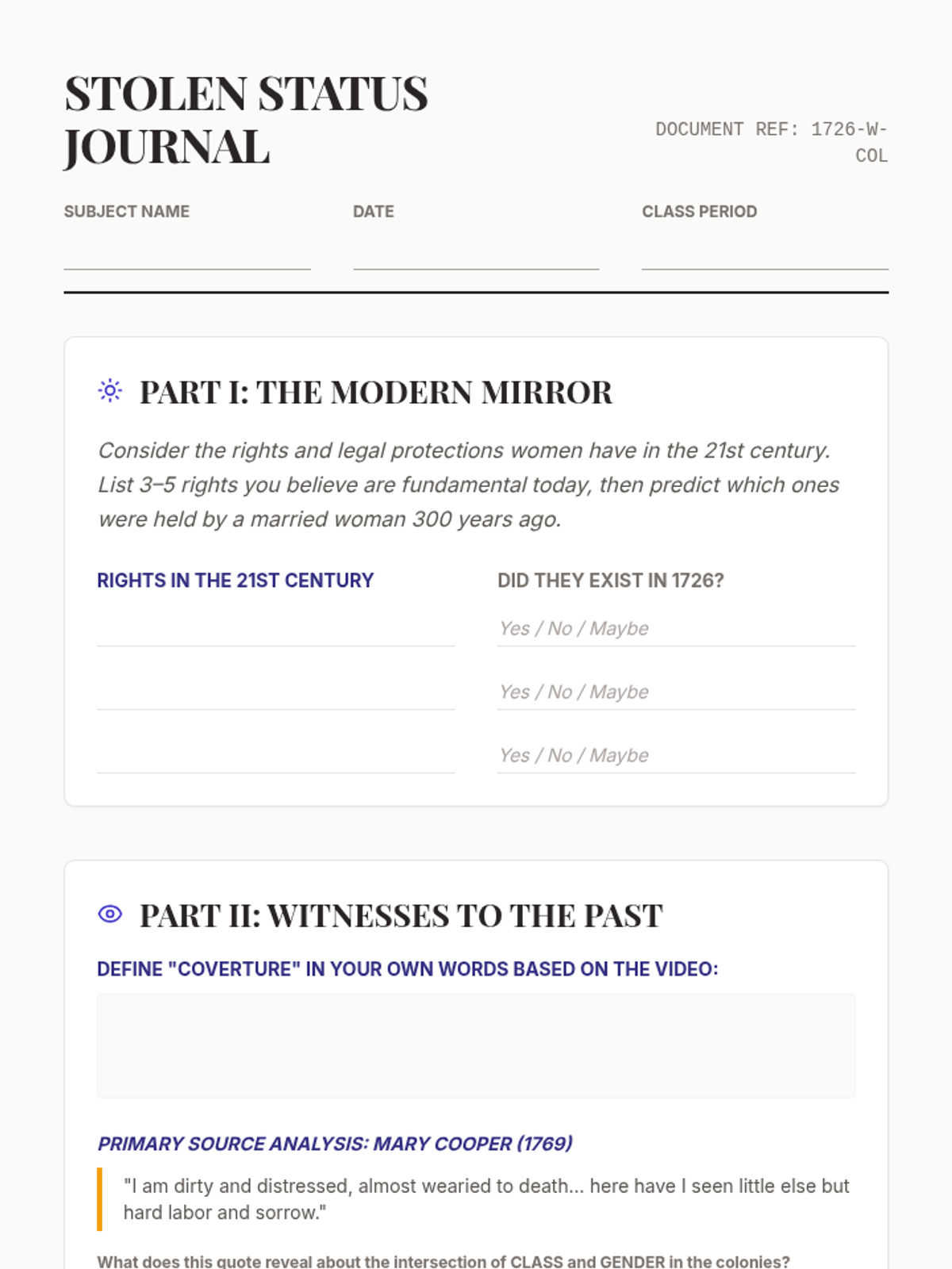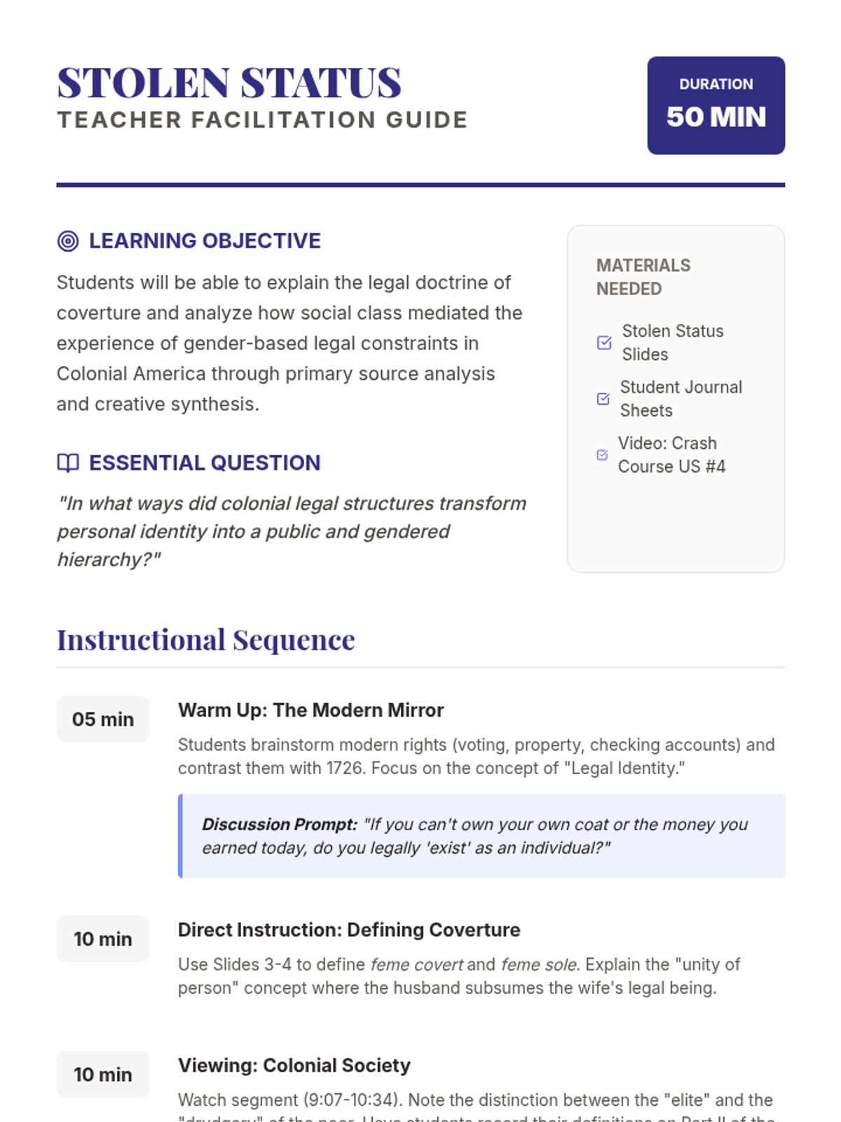 This lesson explores the legal and social constraints placed on women in Colonial America, focusing on the legal doctrine of coverture and the stark differences in daily life across social classes. Students analyze primary source quotes and synthesize their learning through creative historical journaling.