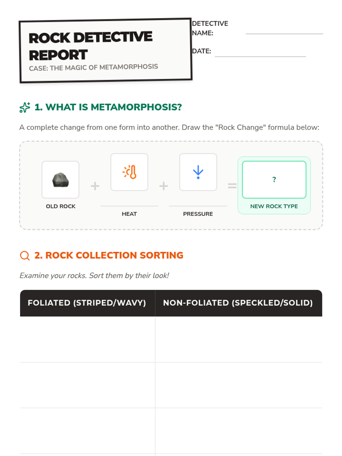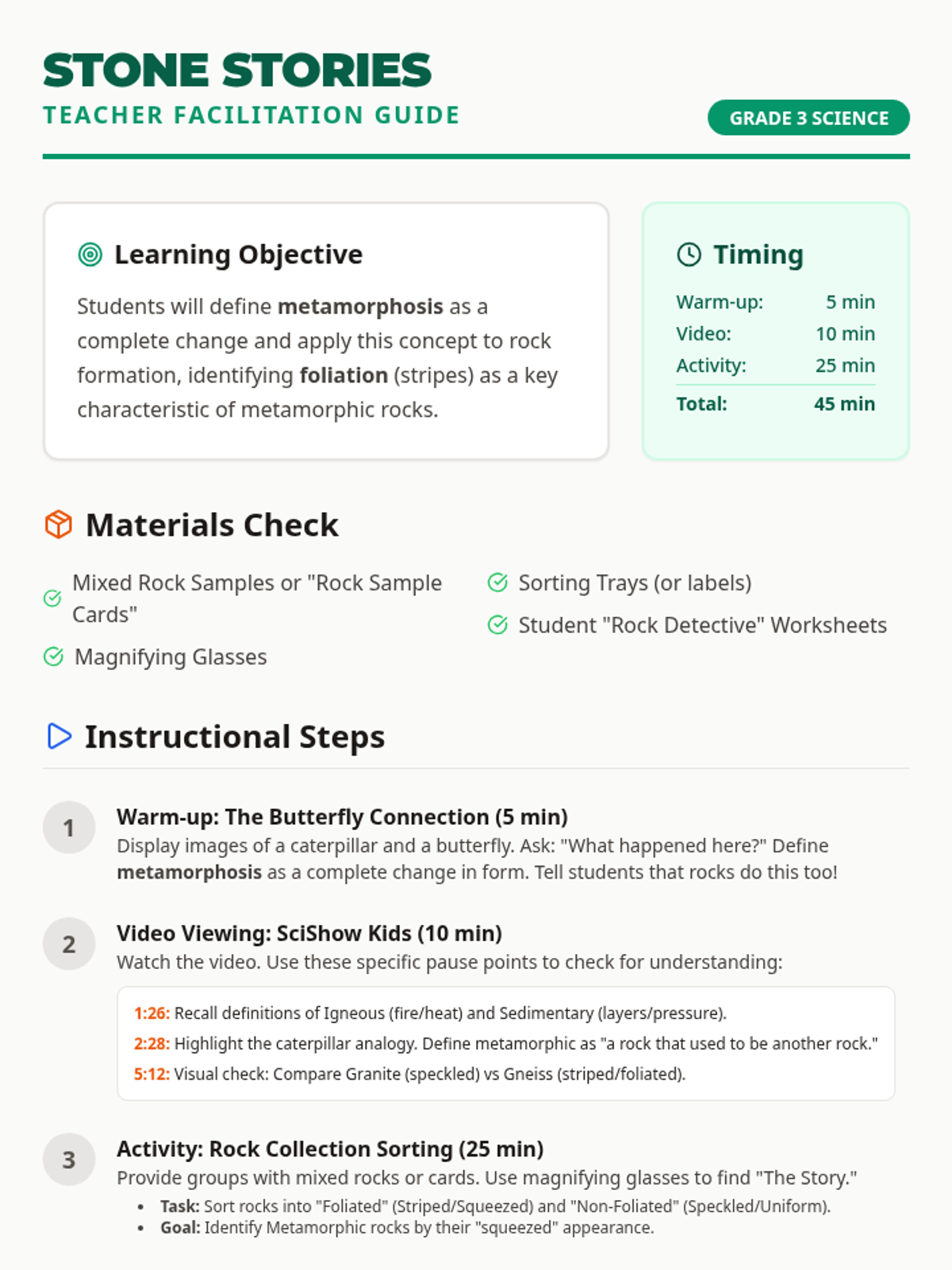 Students discover how heat and pressure transform rocks into metamorphic rocks through the lens of metamorphosis, using a video-guided discussion and a hands-on sorting activity.
