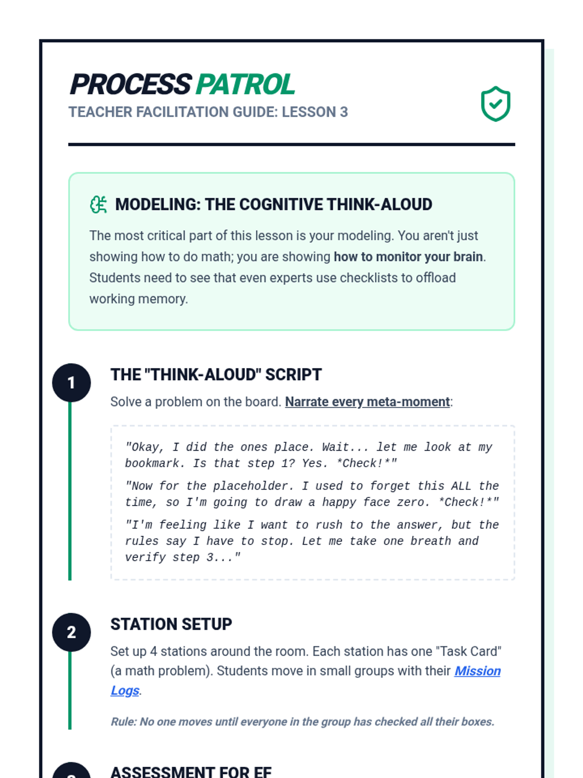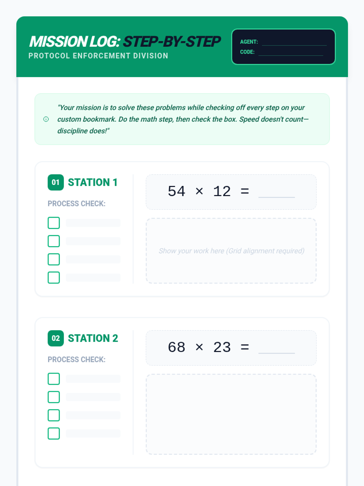 Students rotate through stations solving problems where they must physically check off boxes on their protocol list after completing each stage of the problem. Teachers model 'thinking aloud' to demonstrate how to monitor one's own progress. Emphasis is on accuracy of the process rather than speed.