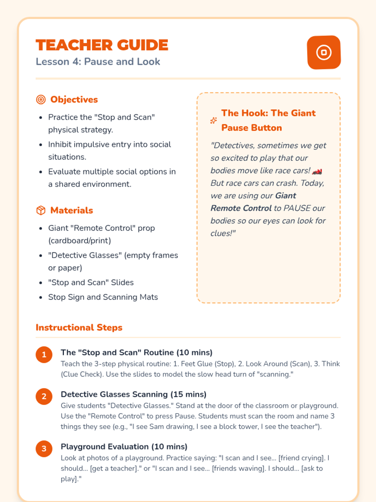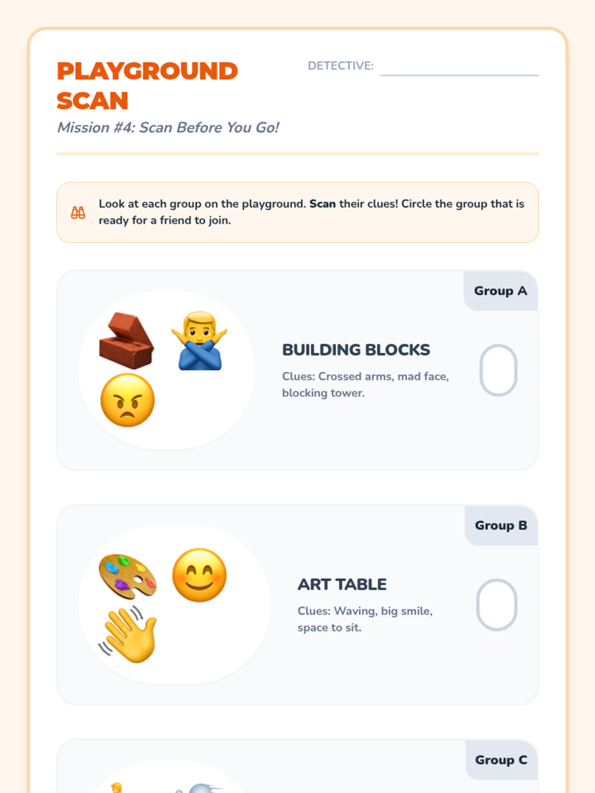 Students practice the 'Stop and Scan' technique to pause and evaluate social situations before acting.
