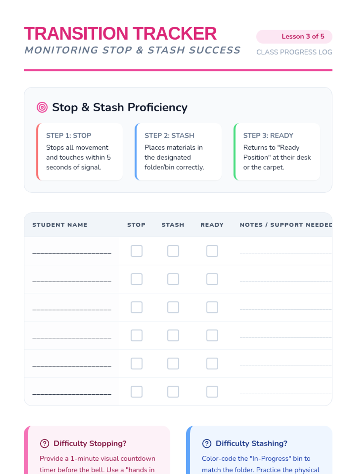 Students practice responding to transition signals by immediately stopping work and storing unfinished materials in an 'in-progress' location.