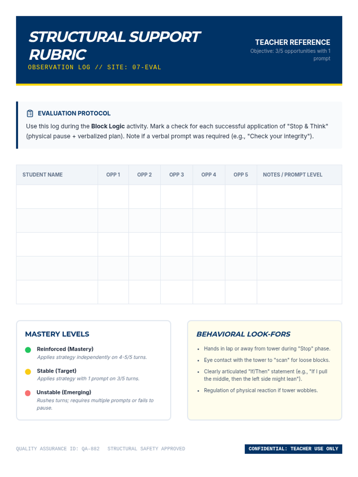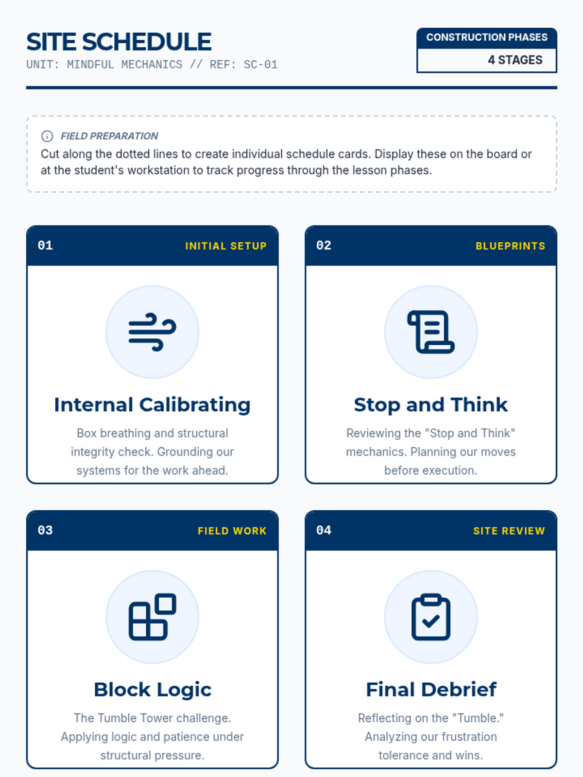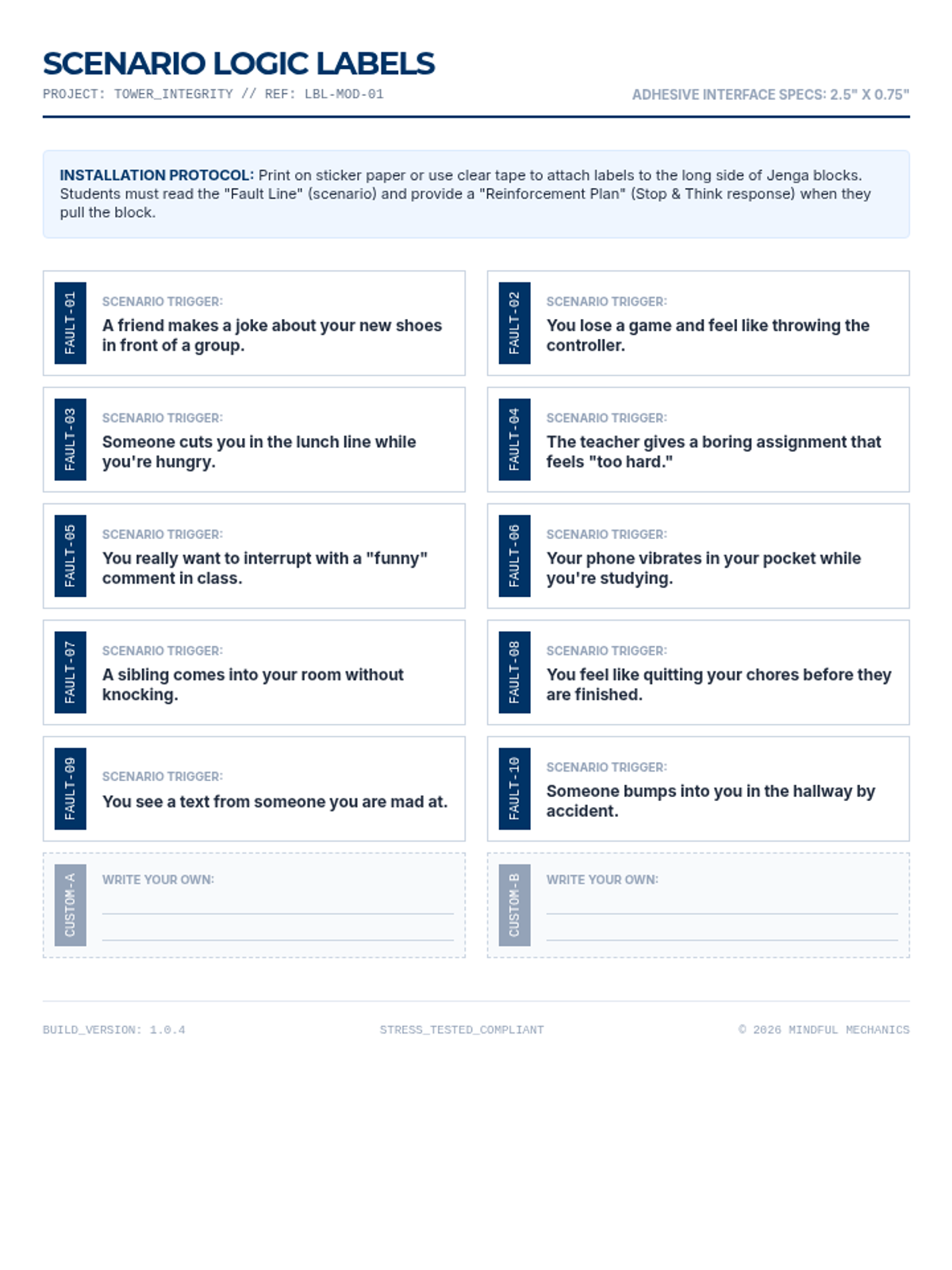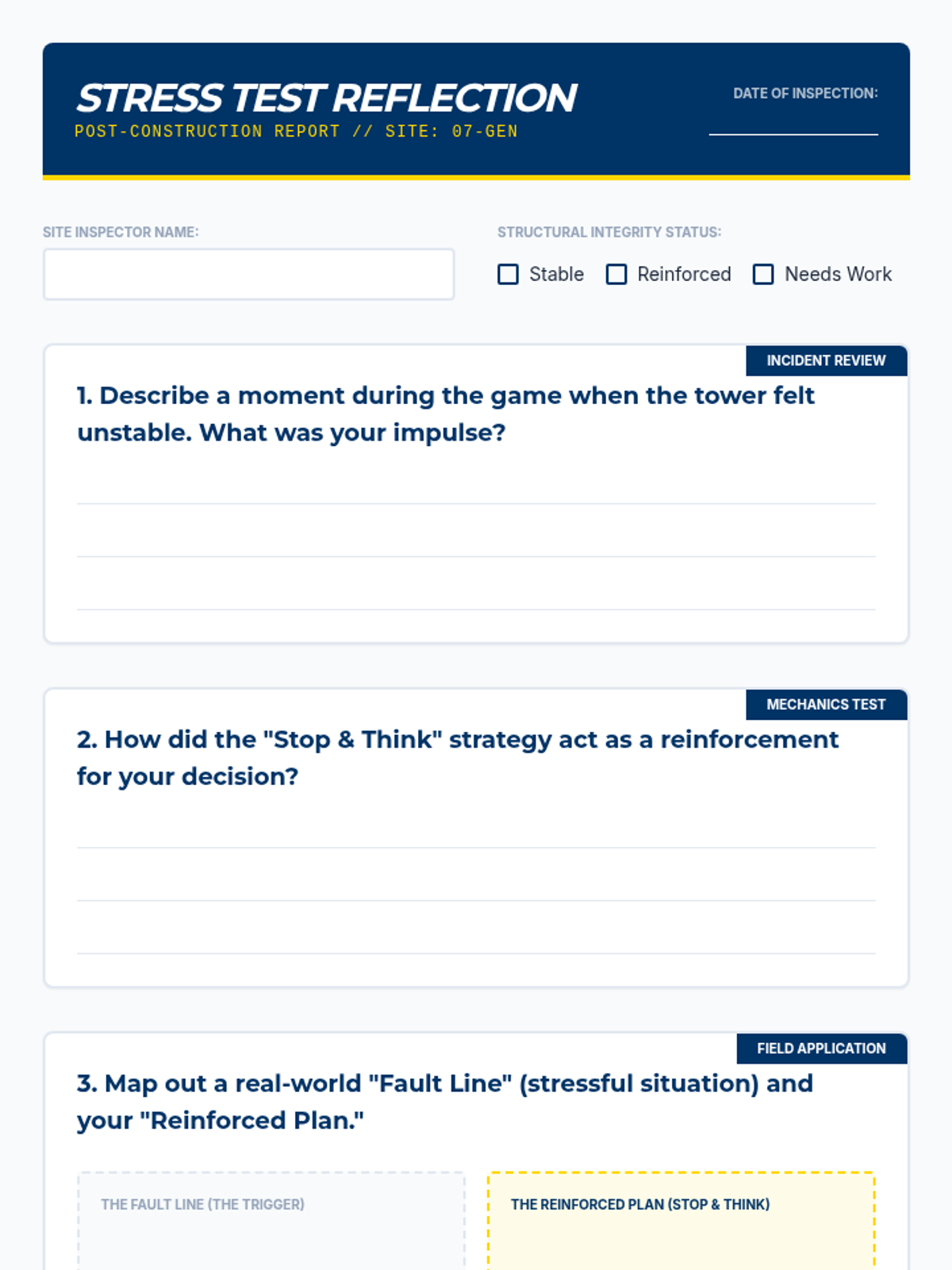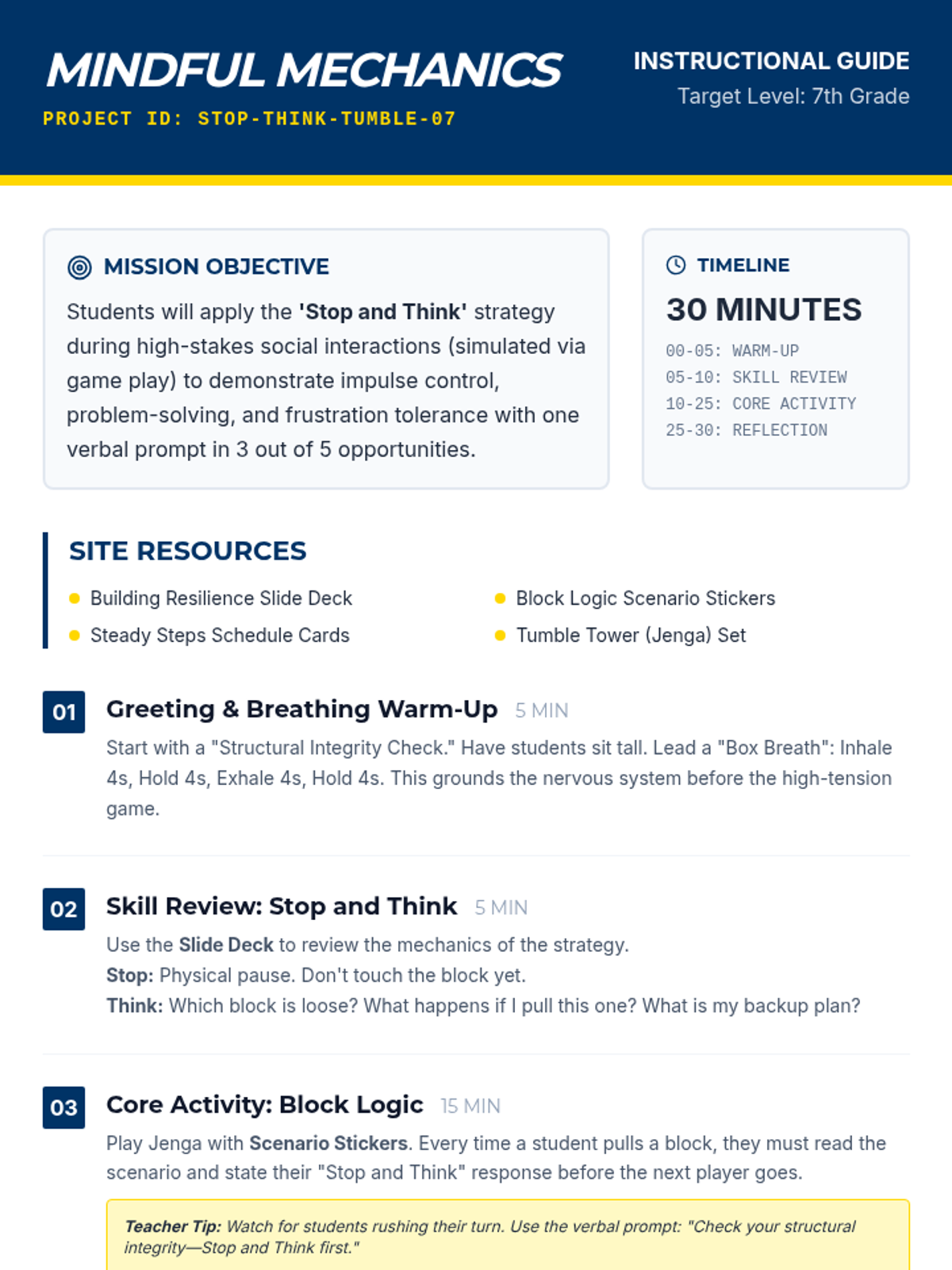 A lesson focused on developing impulse control and frustration tolerance through the 'Stop and Think' strategy, using a modified Jenga game as a practical application.
