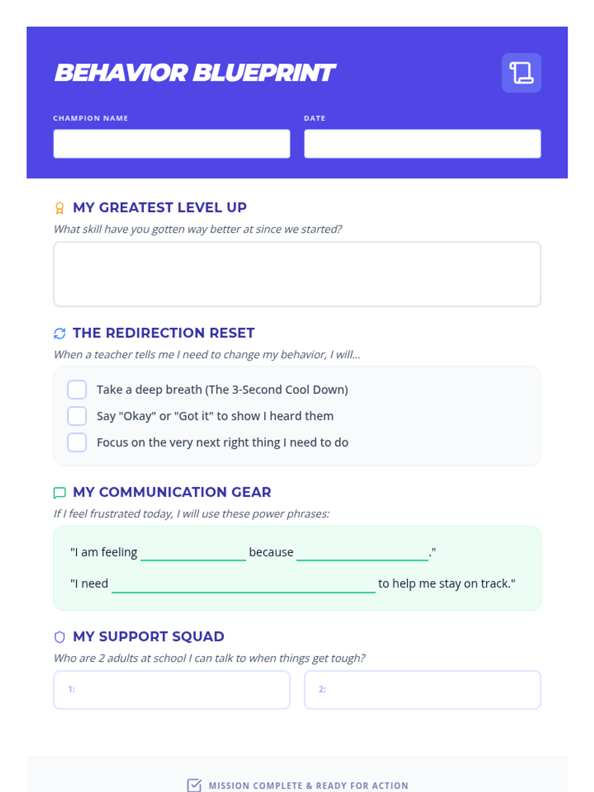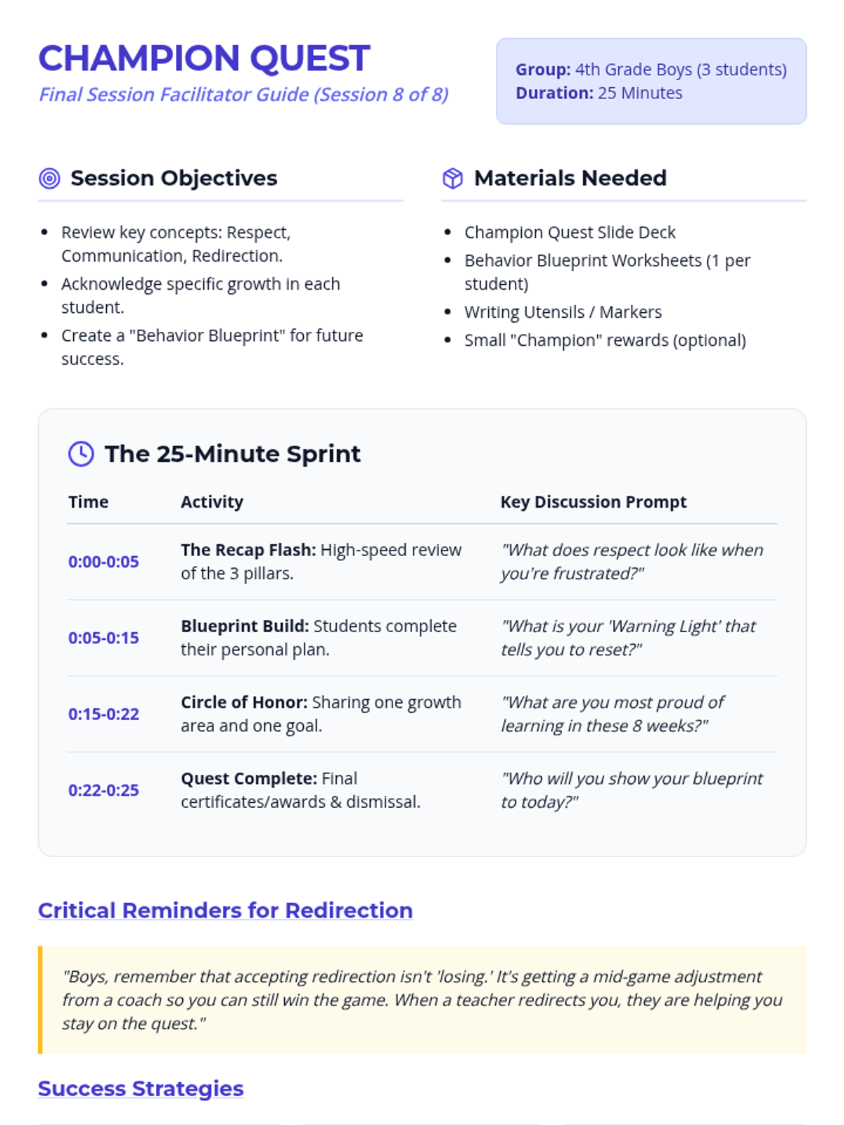 A final review and future-planning session for 4th-grade boys focusing on respect, communication, and accepting redirection. This 25-minute session celebrates growth and creates a concrete plan for maintaining positive behaviors.