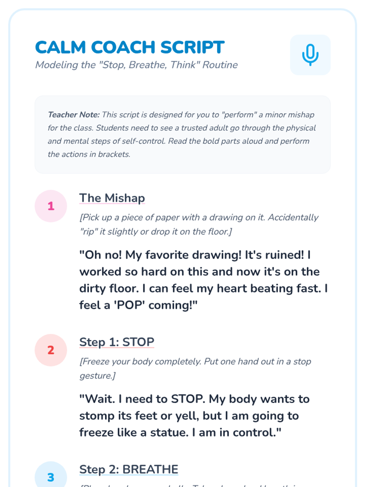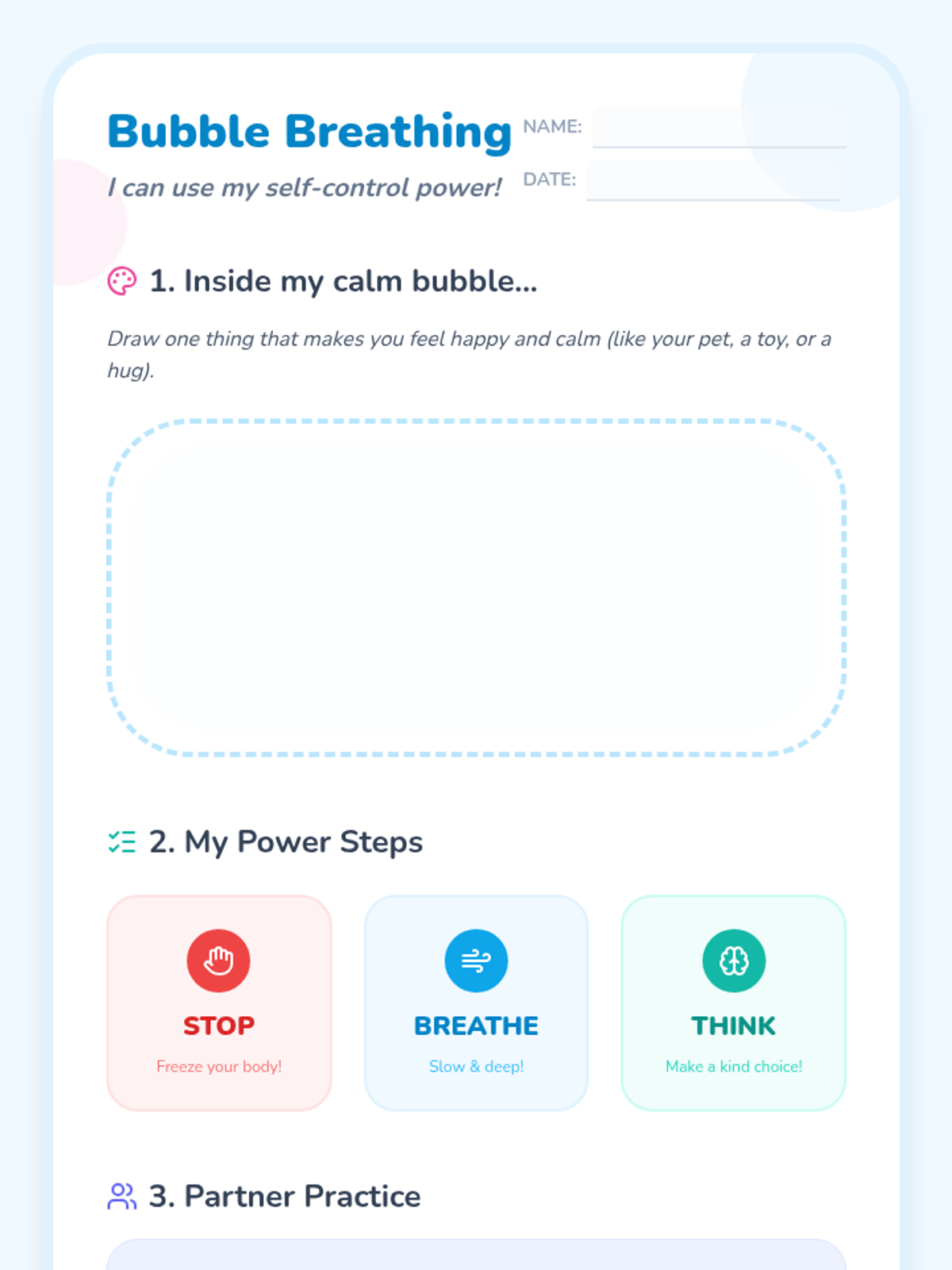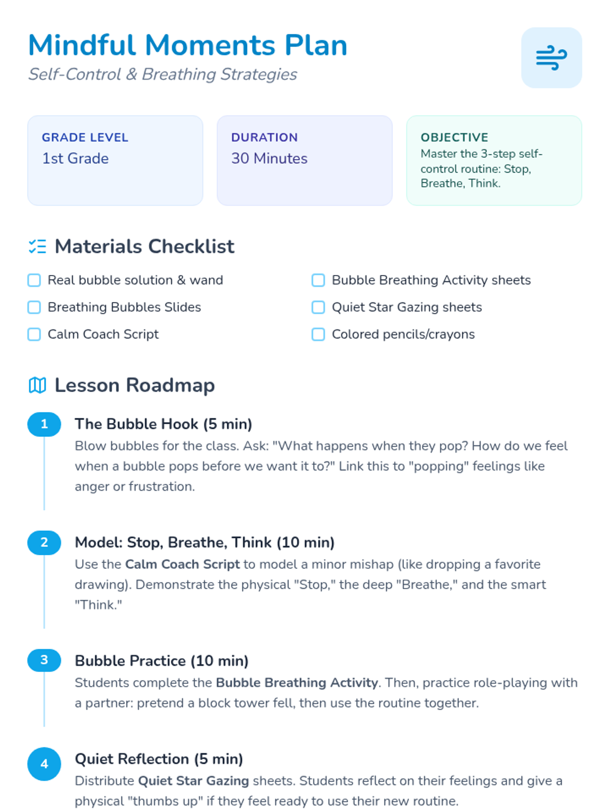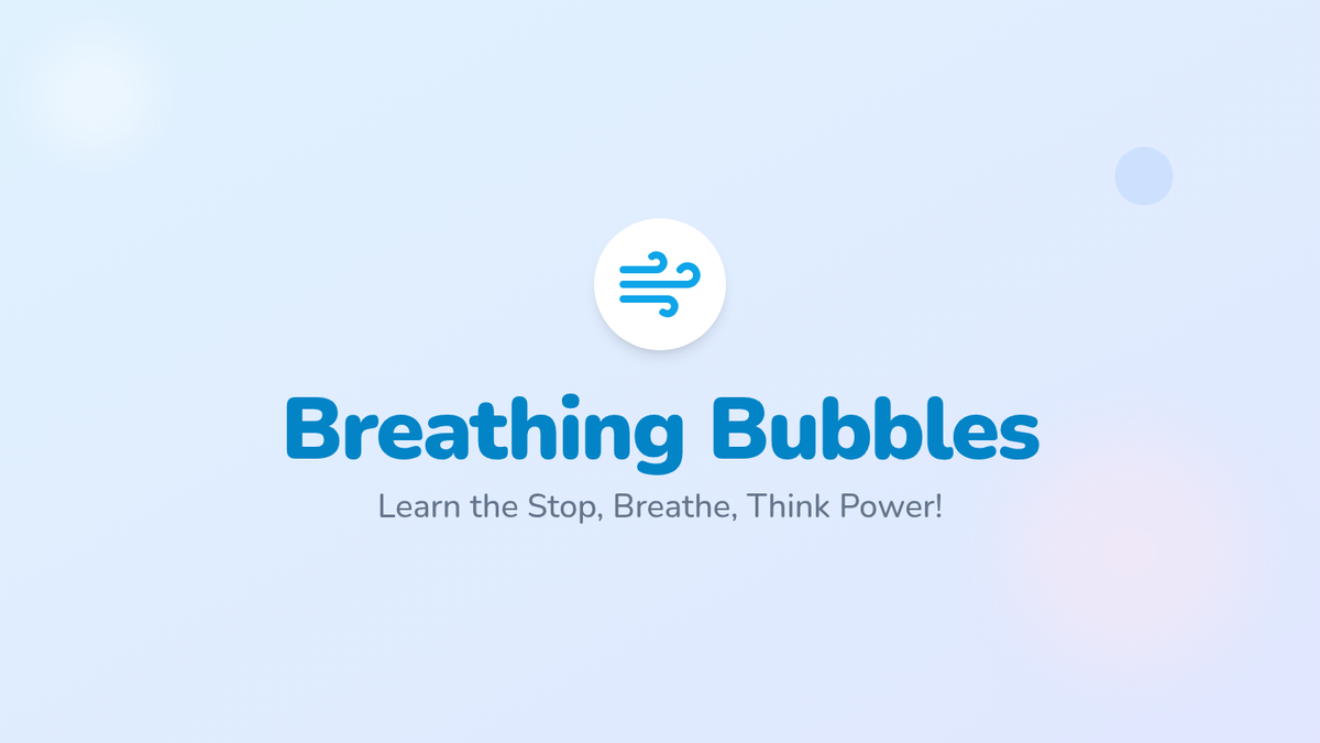 A calming social-emotional learning lesson for 1st graders to learn a simple three-step self-control routine (Stop, Breathe, Think) using the engaging metaphor of bubbles.