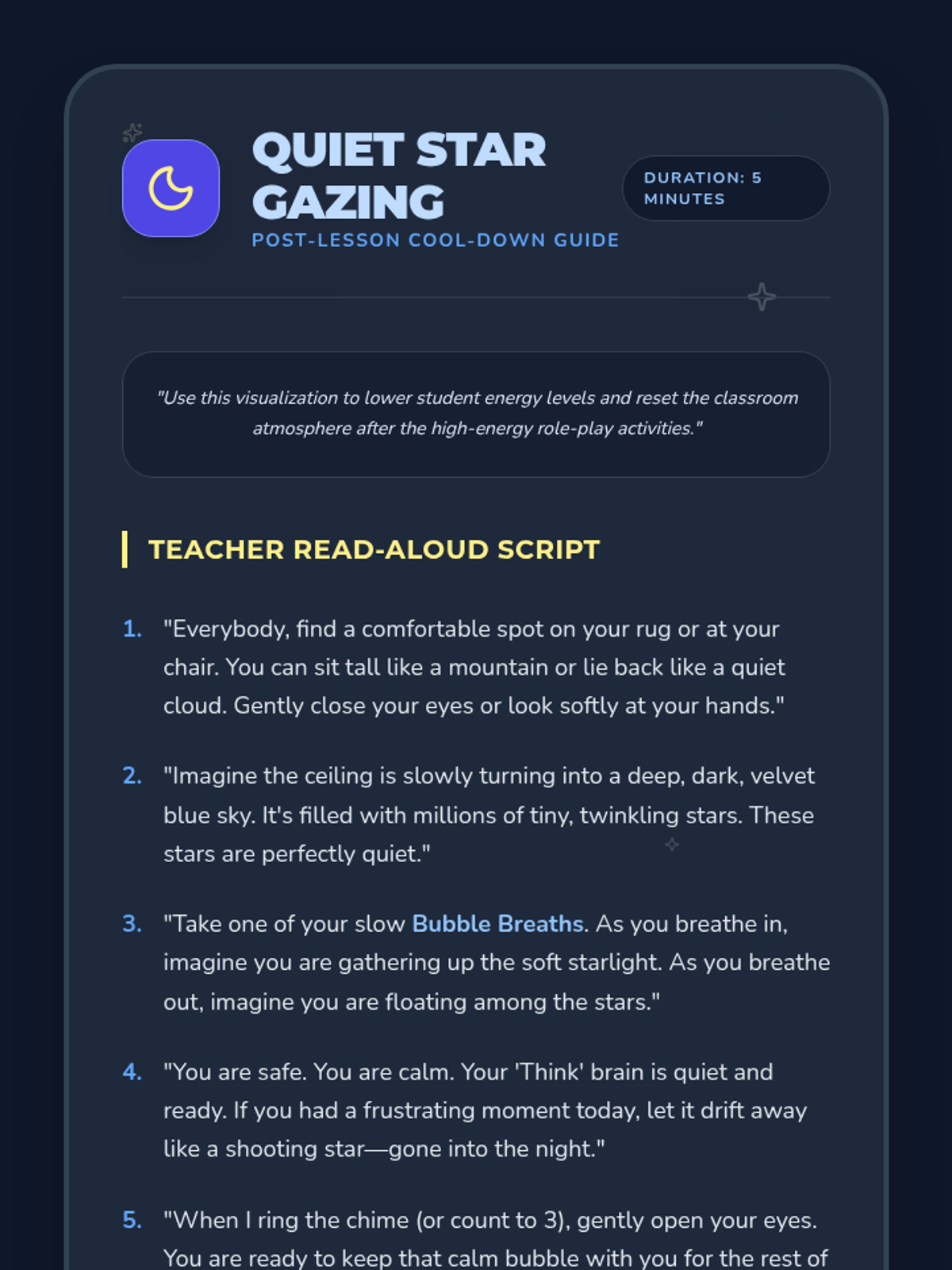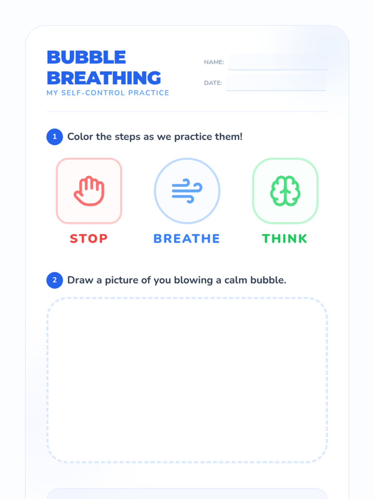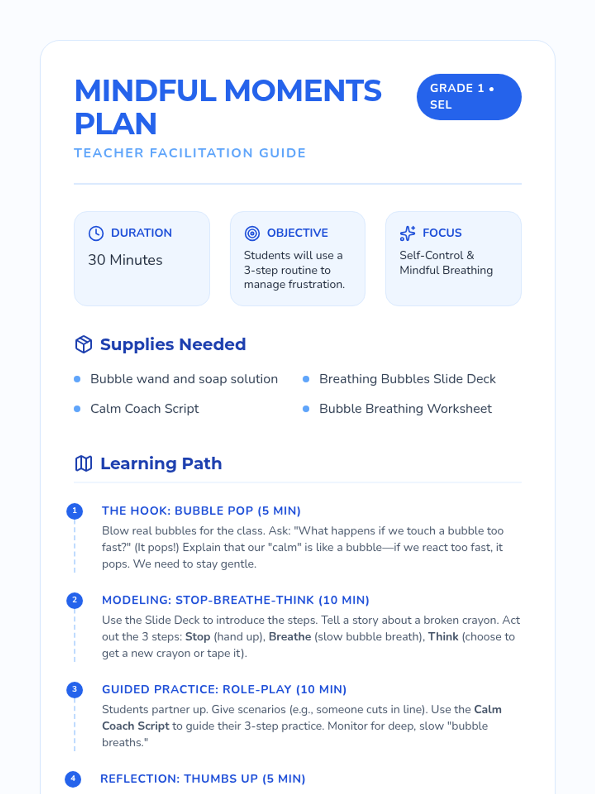 A 1st-grade Social-Emotional Learning lesson focused on self-control and mindful breathing through the 'Stop, Breathe, Think' routine. Students learn to navigate frustration using bubble-themed visualization and practice.