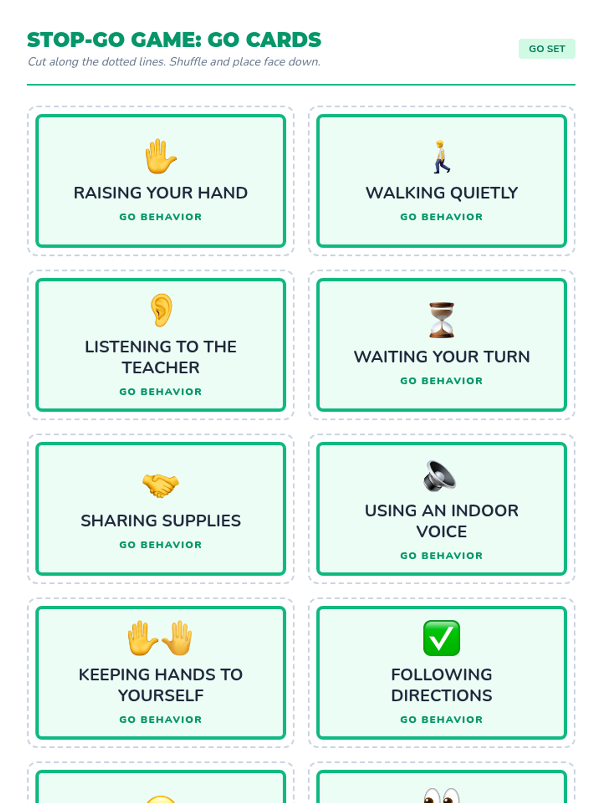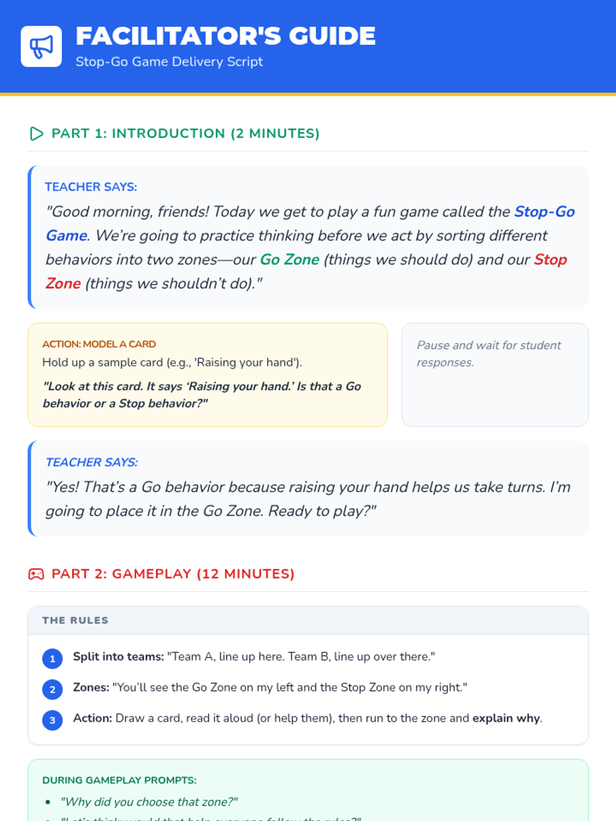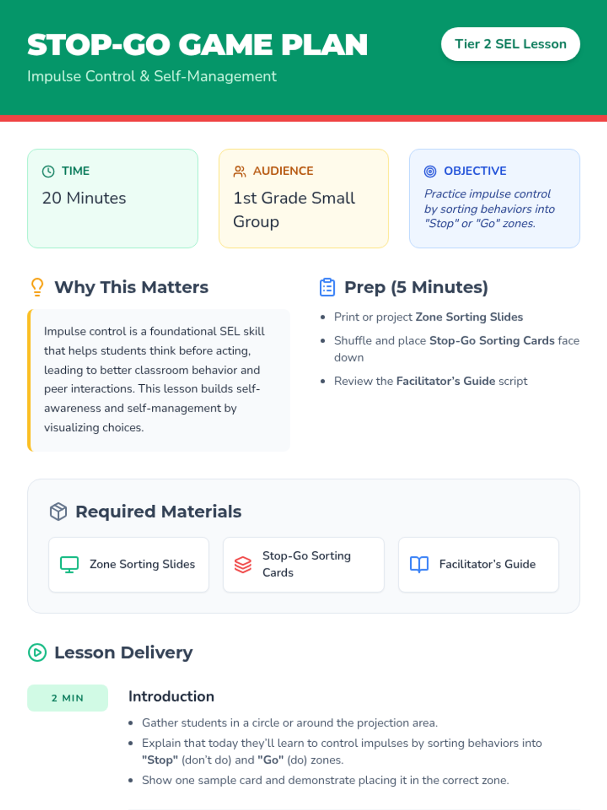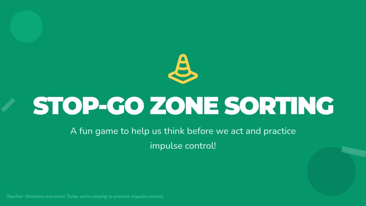 A small-group interactive game for 1st graders to teach impulse control by sorting behaviors into "Stop" and "Go" zones. This Tier 2 SEL session reinforces self-management through movement and reflection.