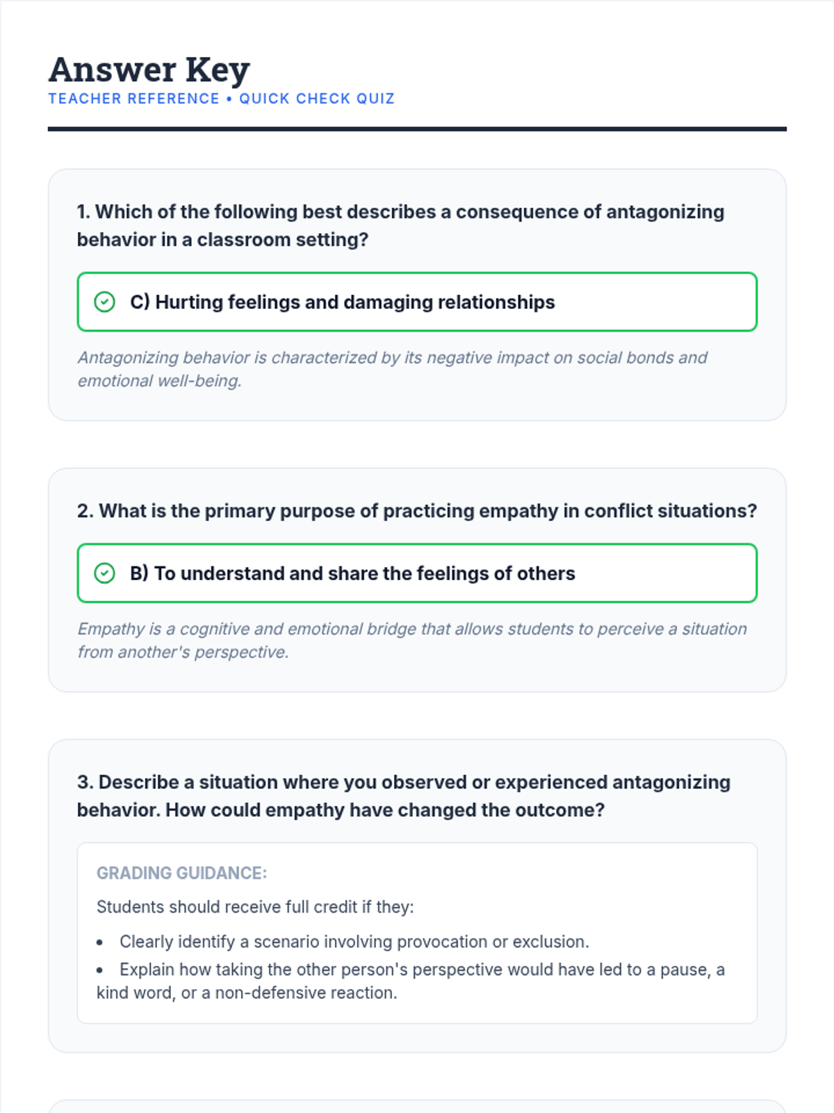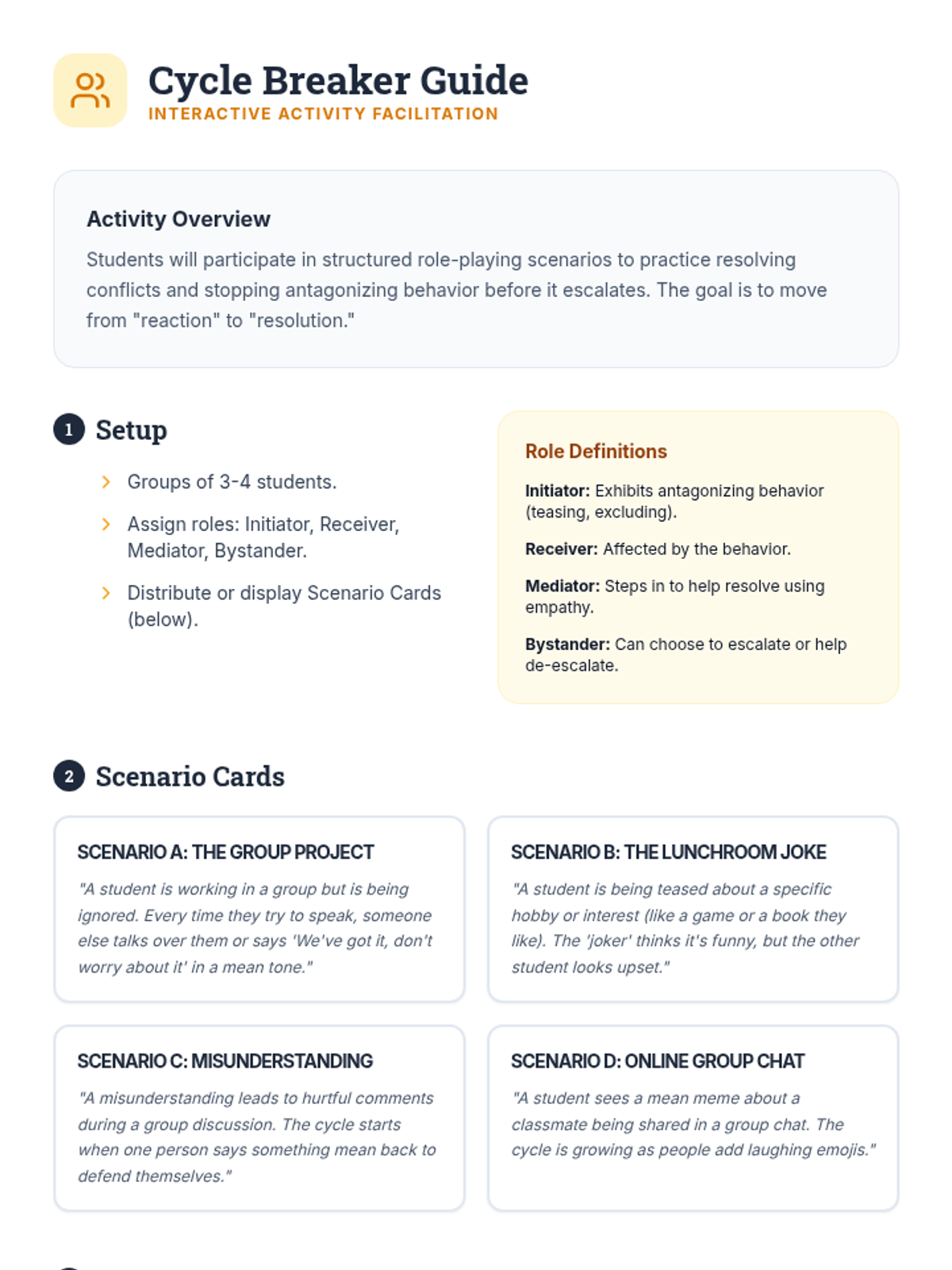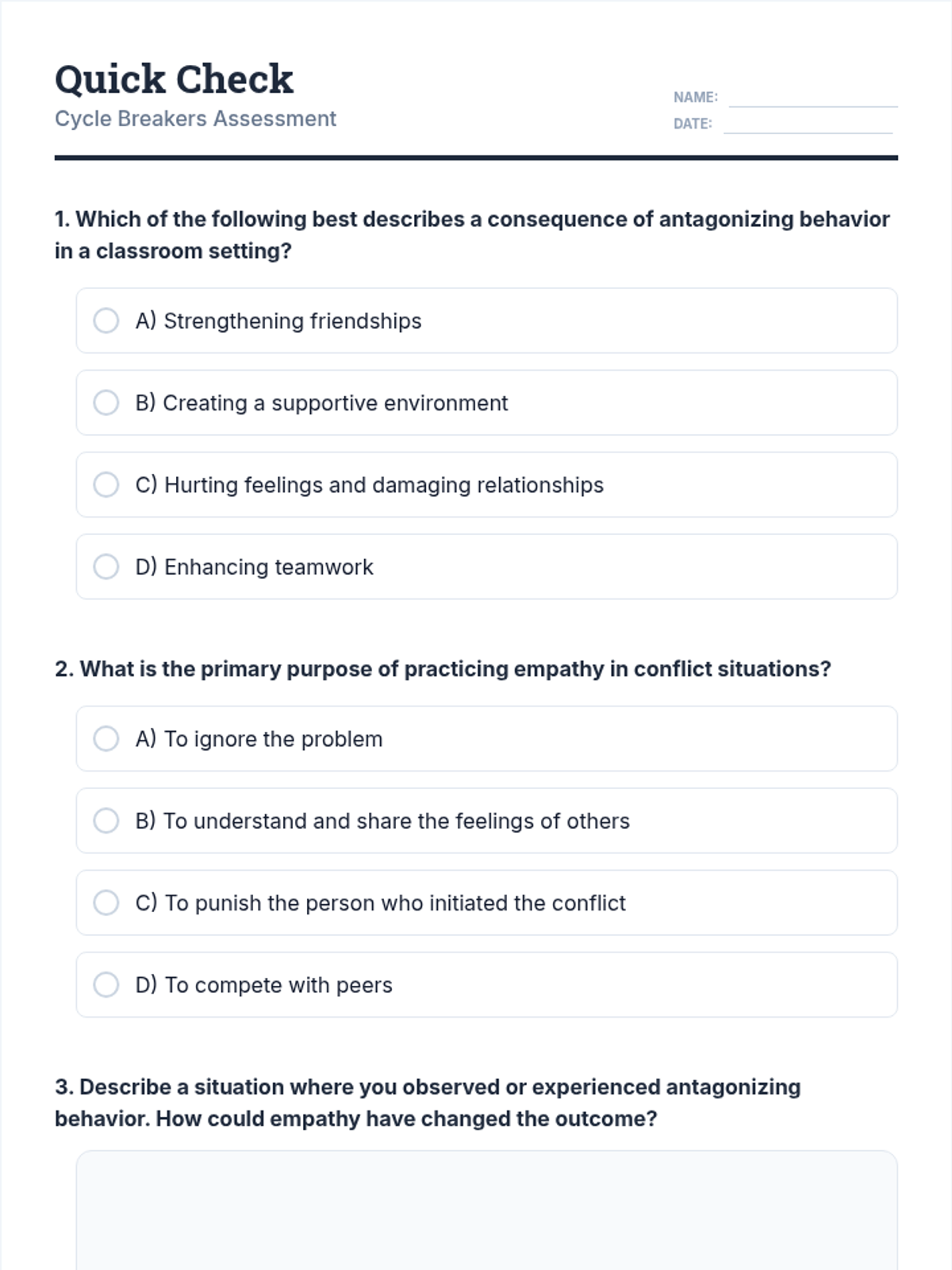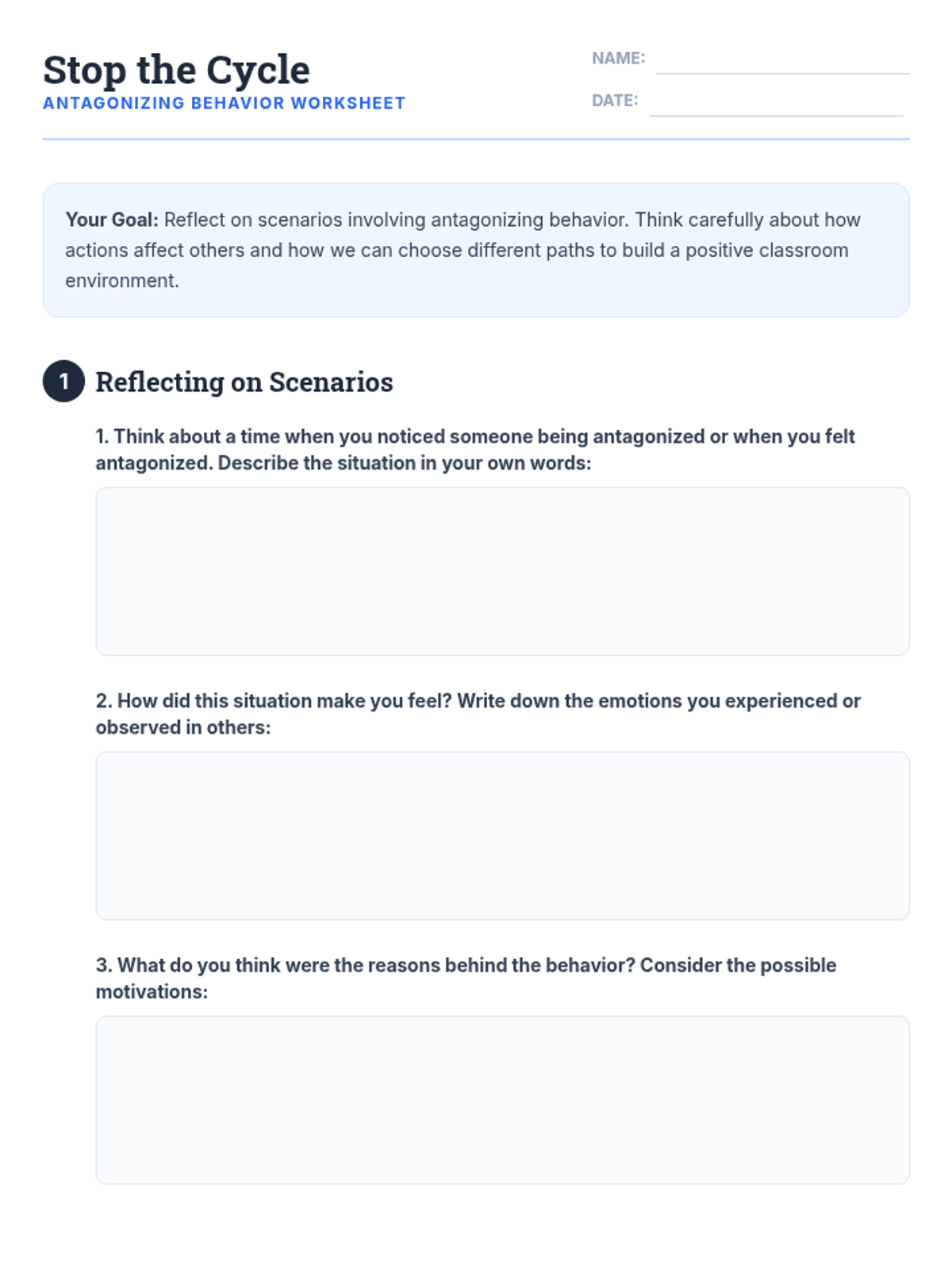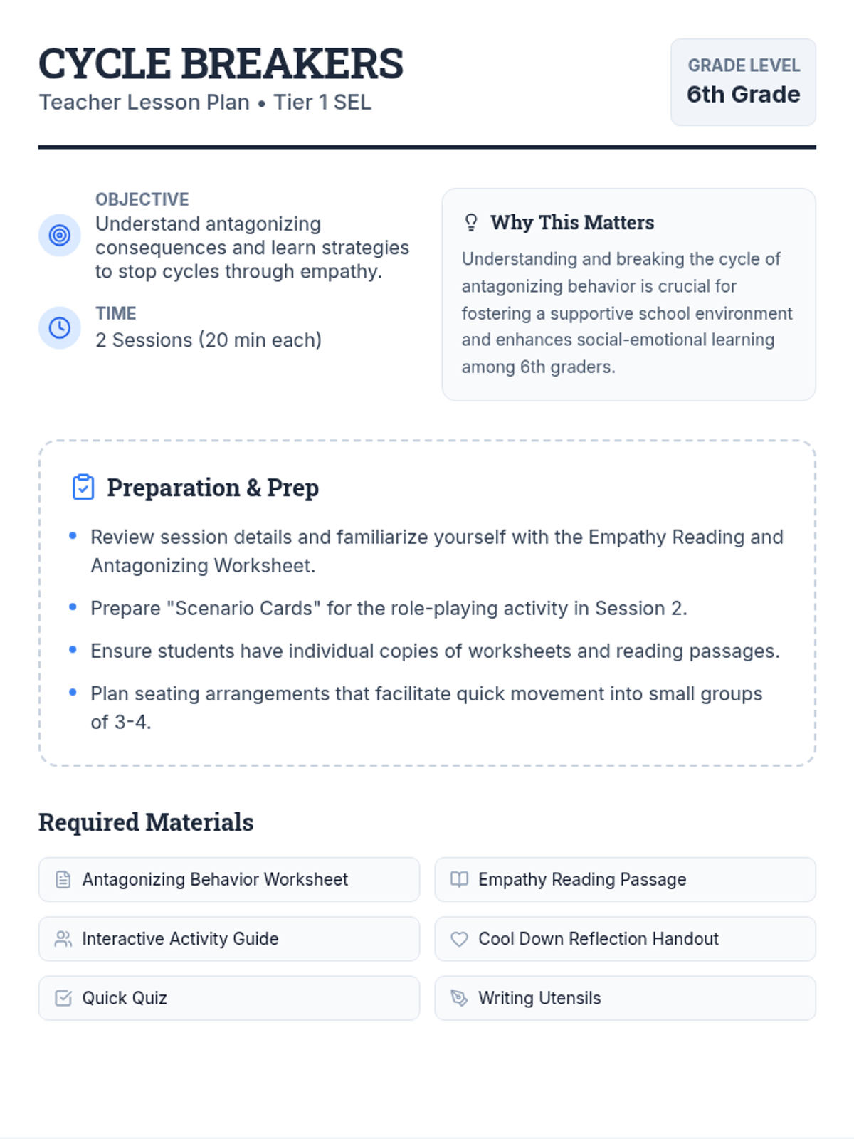A two-session Social-Emotional Learning lesson for 6th graders focused on identifying antagonizing behaviors and using empathy to break negative social cycles. Students explore real-life scenarios, practice role-playing, and reflect on their impact on classroom culture.