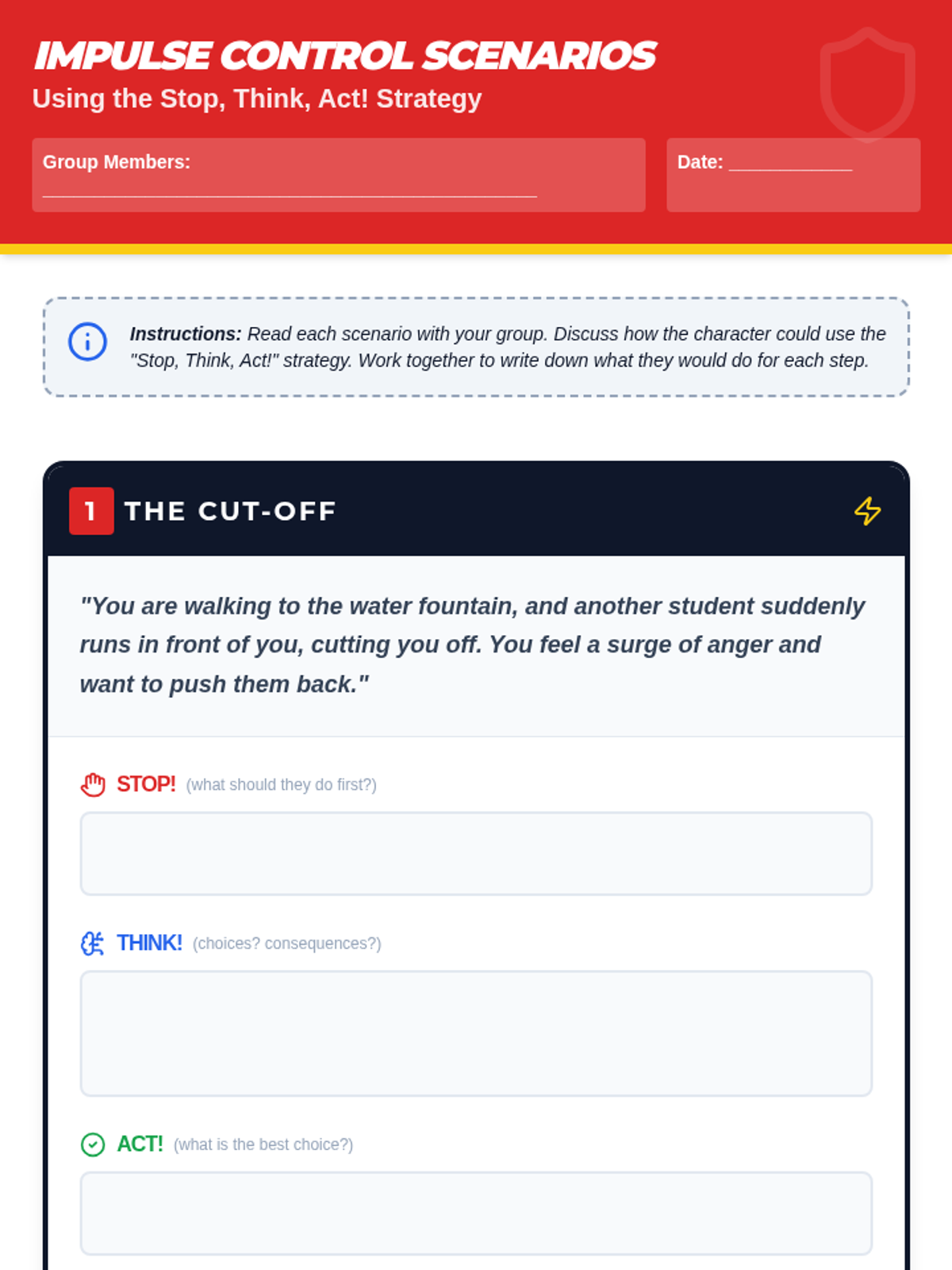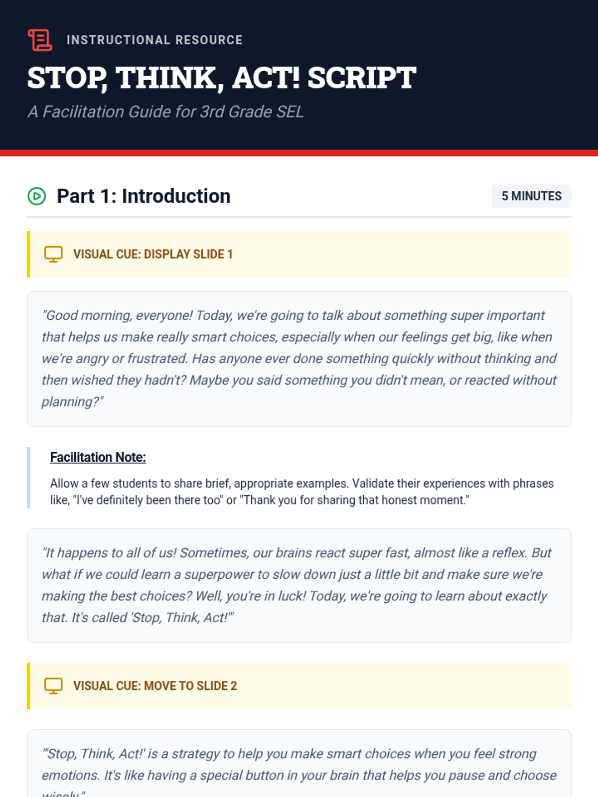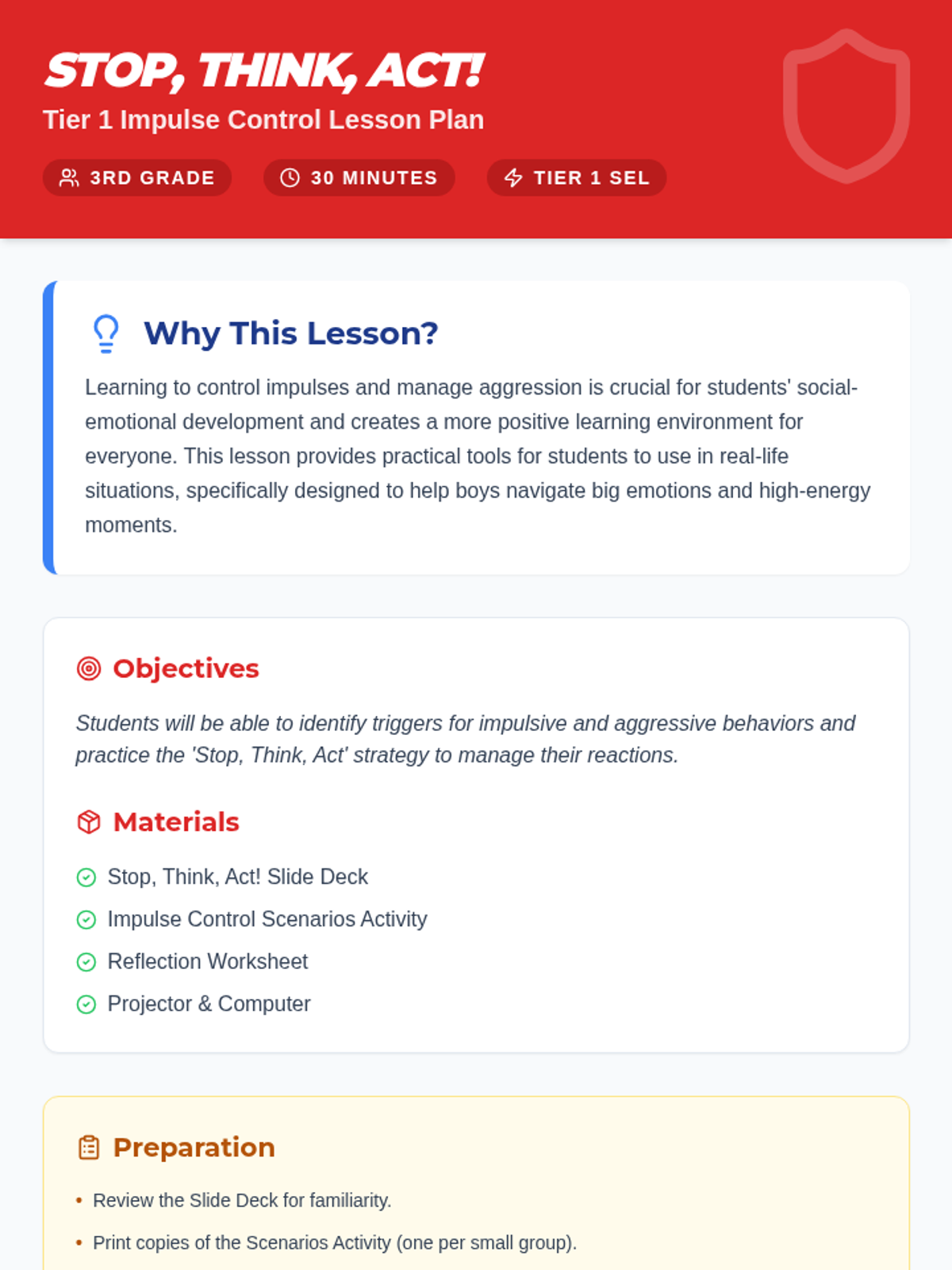 A 30-minute Tier 1 SEL lesson for 3rd graders focusing on impulse control and managing aggression through the 'Stop, Think, Act' strategy. Students practice identifying triggers and choosing calm, safe reactions.