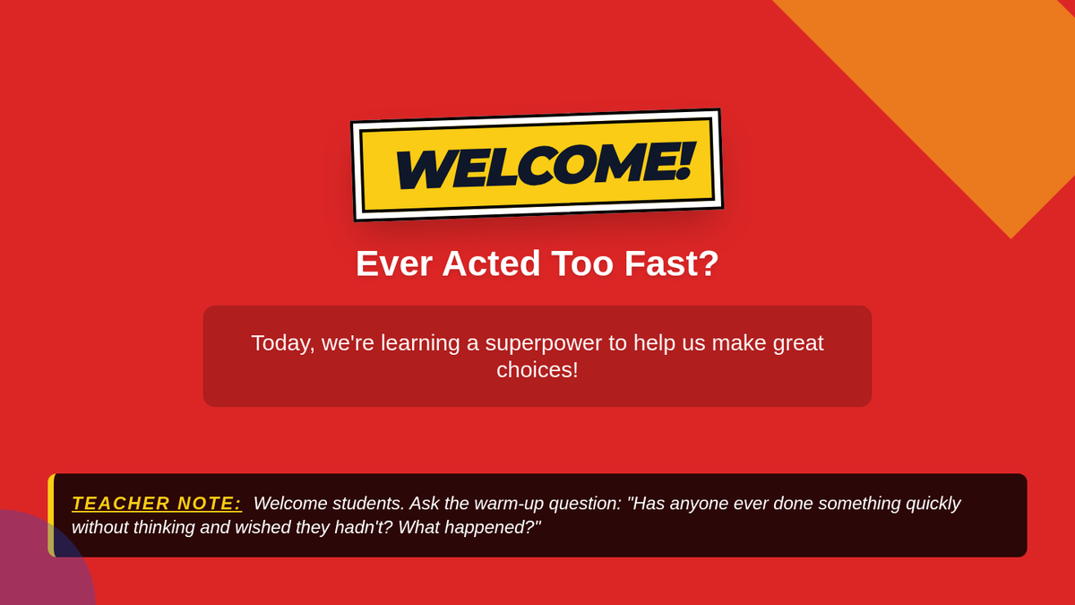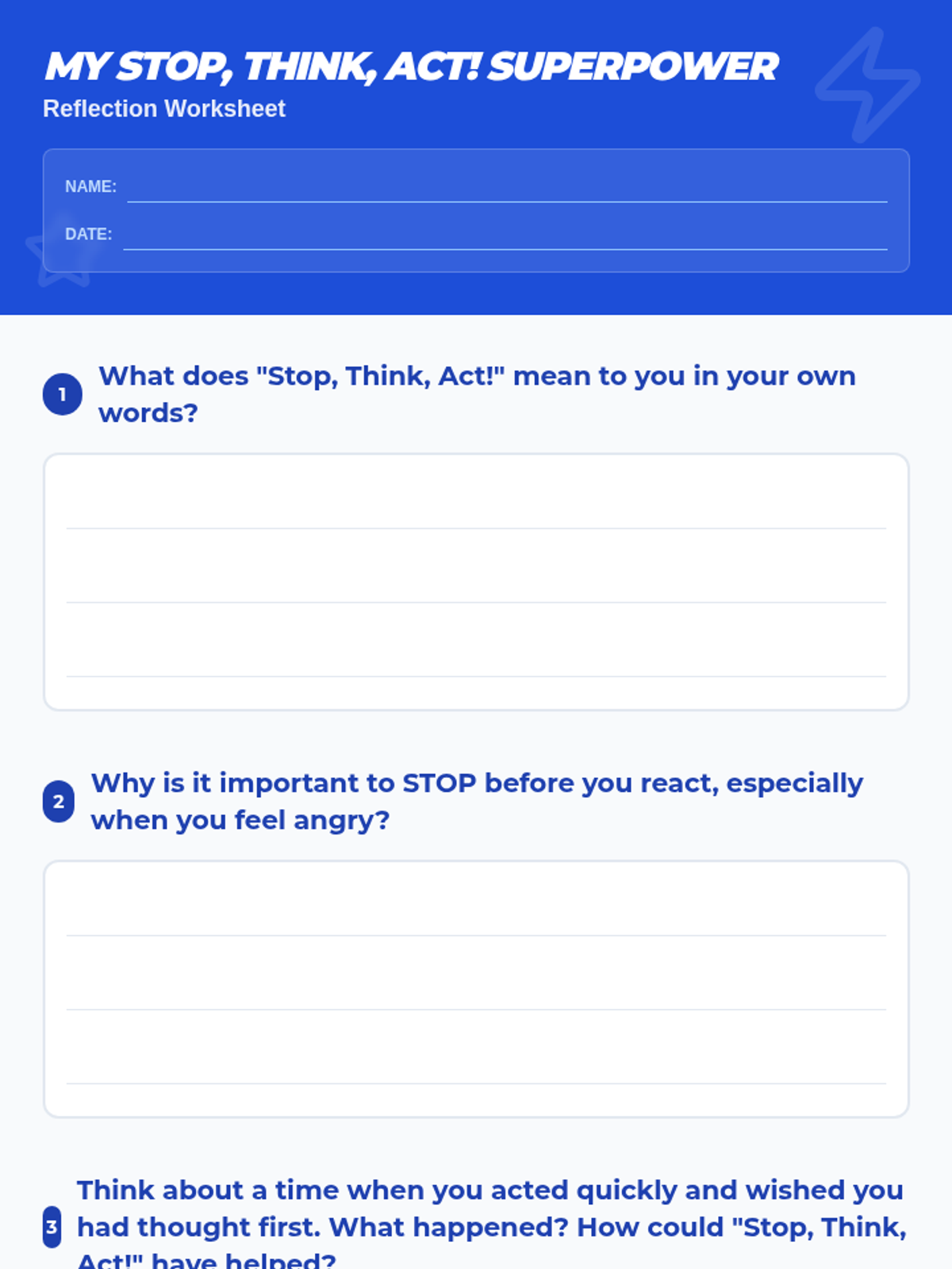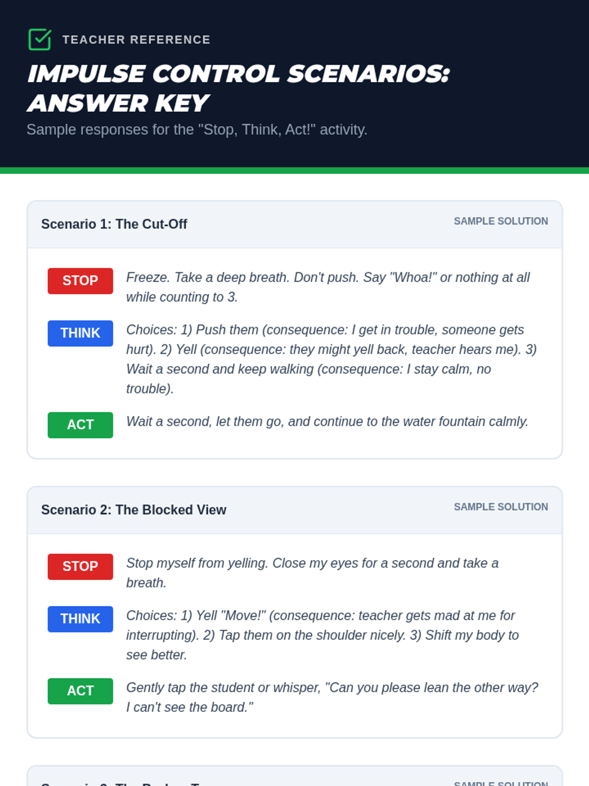 A 30-minute Tier 1 SEL lesson for 3rd graders focusing on impulse control and managing aggression through the 'Stop, Think, Act' strategy. Students practice identifying triggers and choosing calm, safe reactions.