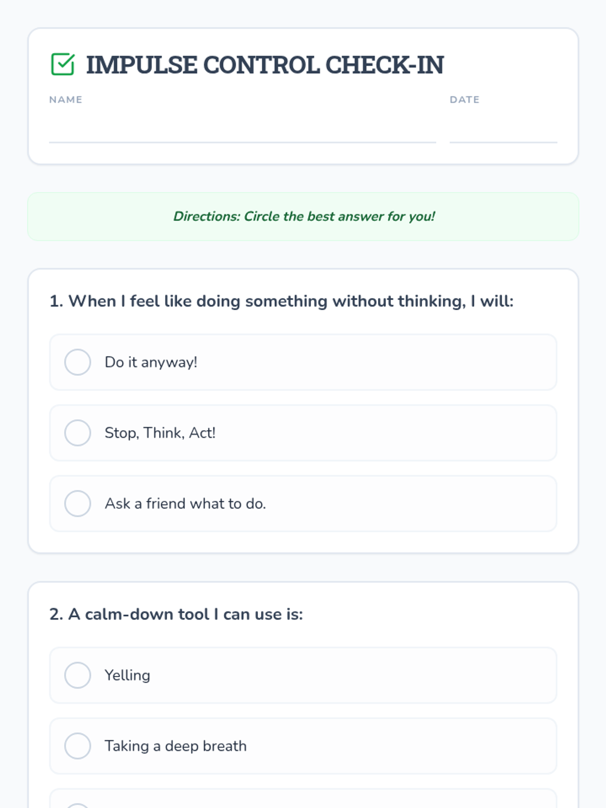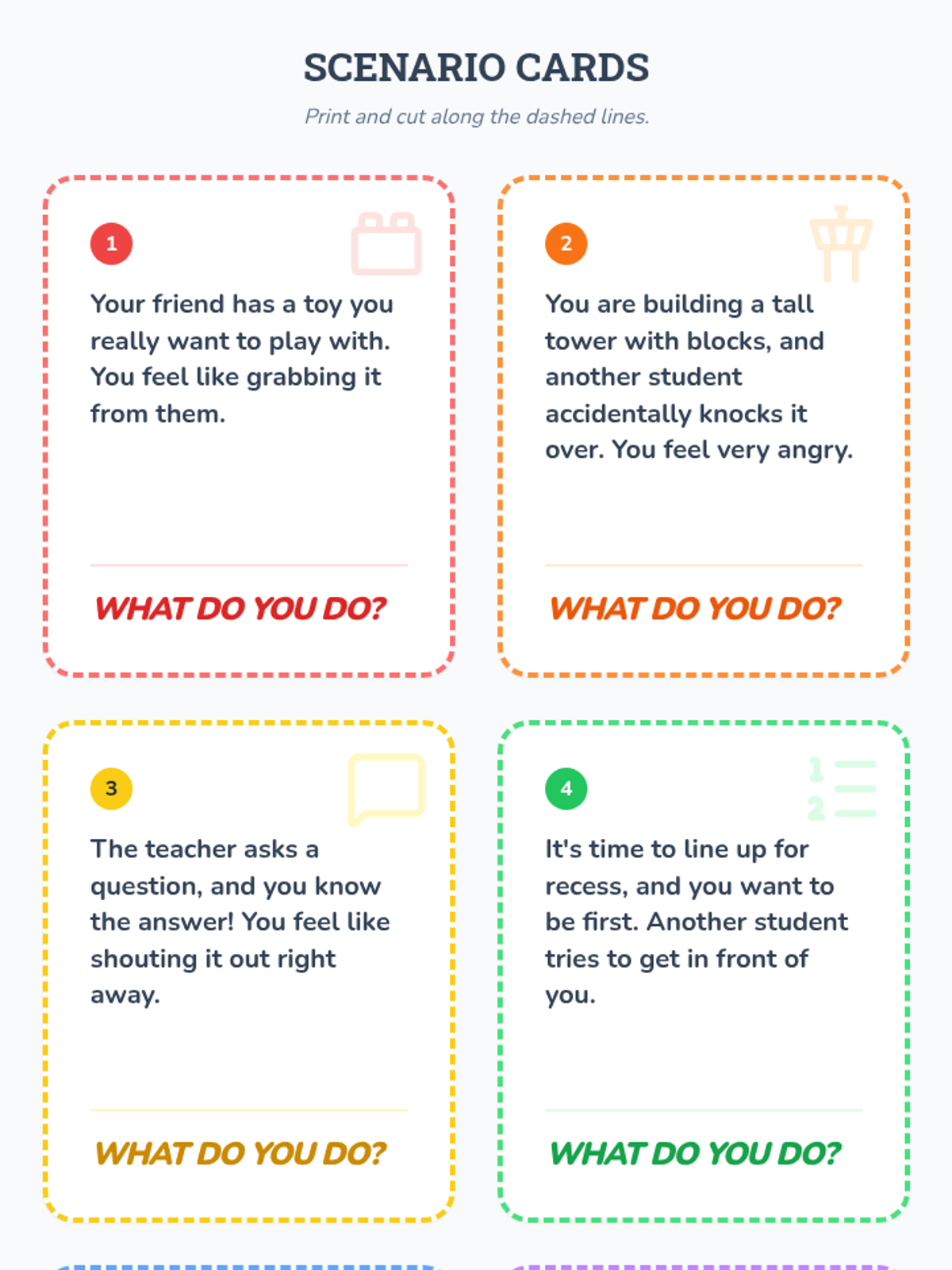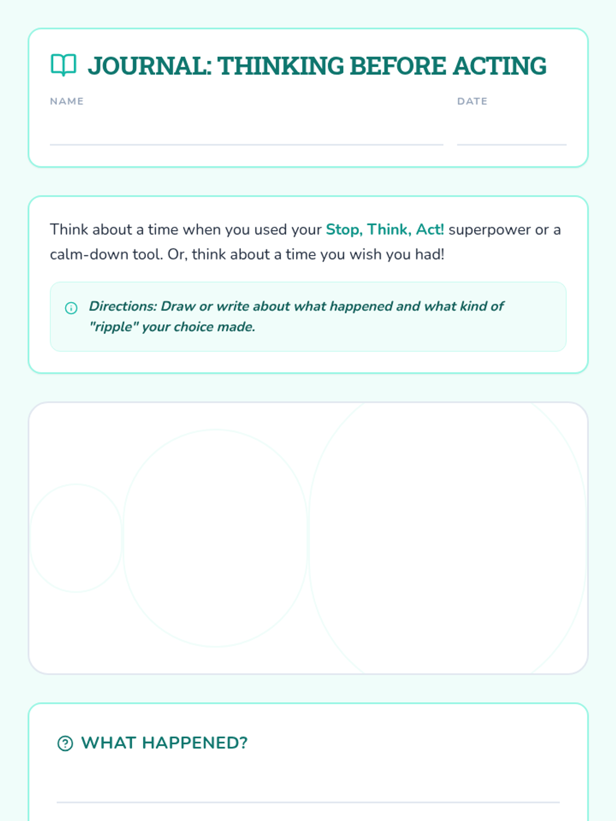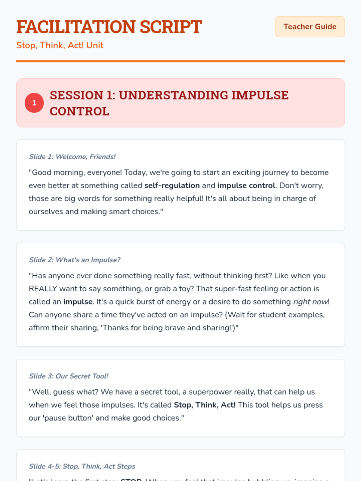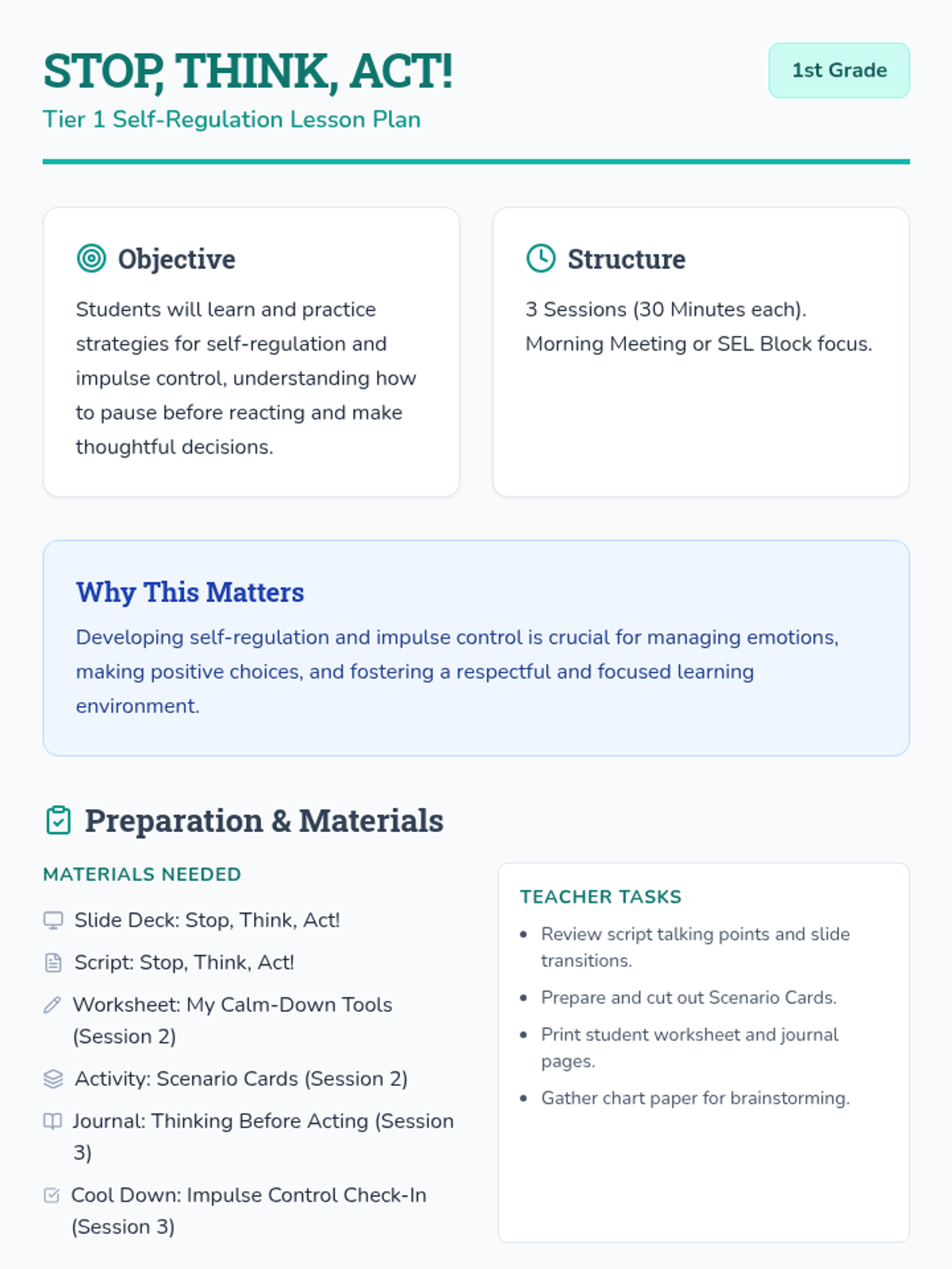 A comprehensive 3-session unit teaching 1st graders how to pause, consider options, and make thoughtful choices to manage impulses.