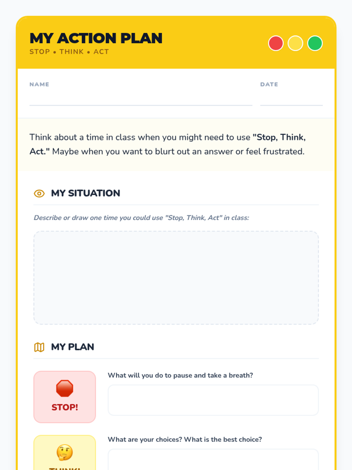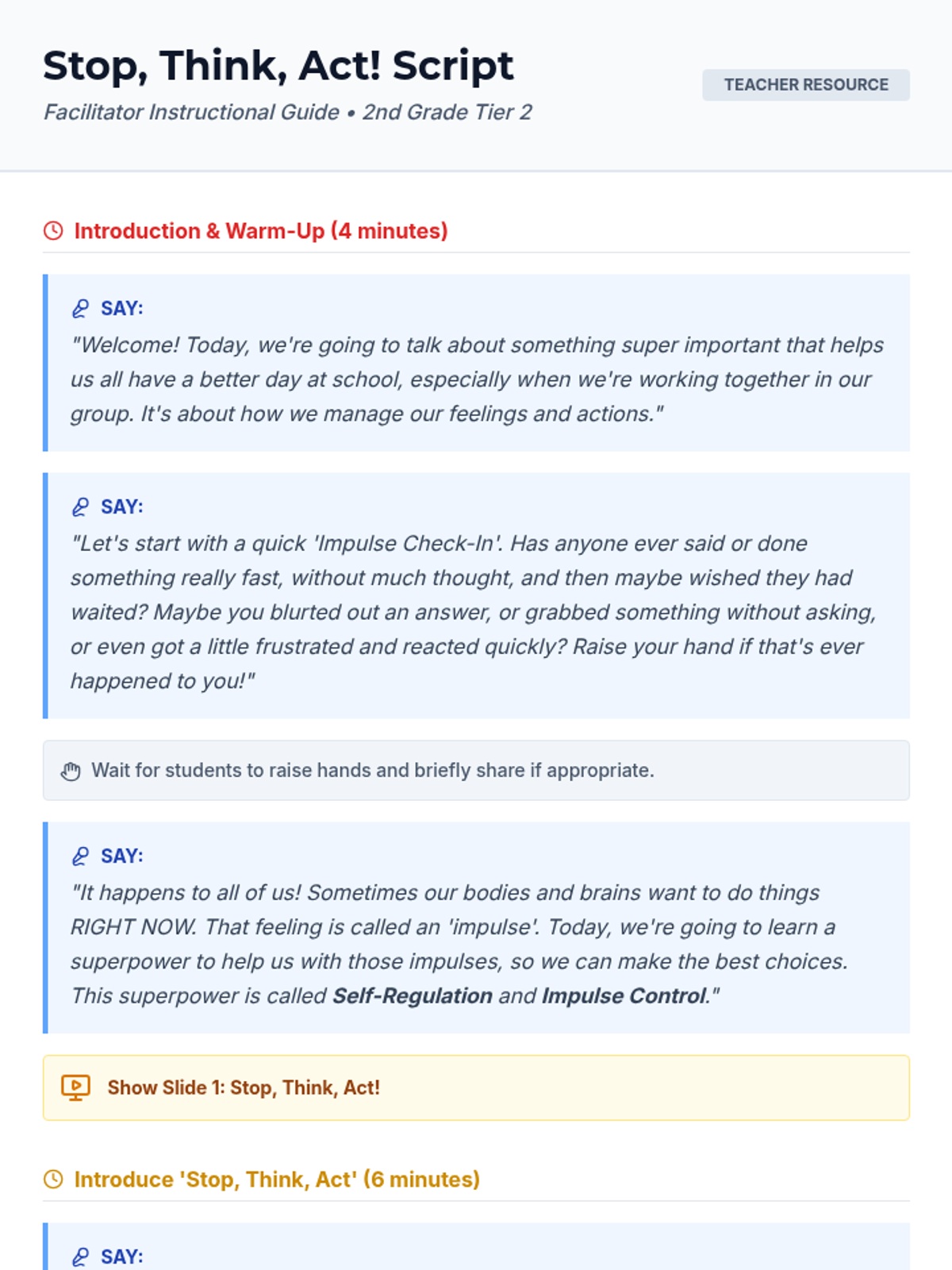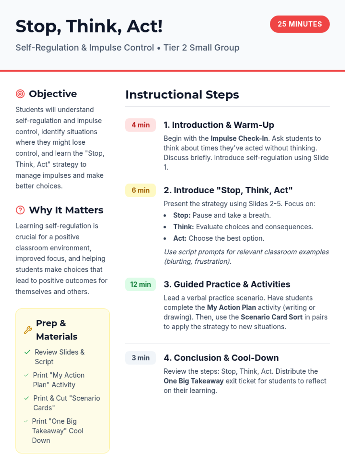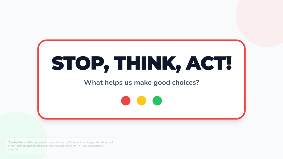 A 25-minute Tier 2 small group lesson for 2nd grade students focused on self-regulation and impulse control using the 'Stop, Think, Act' strategy. Students learn to identify impulses and apply a three-step process to make positive classroom choices.