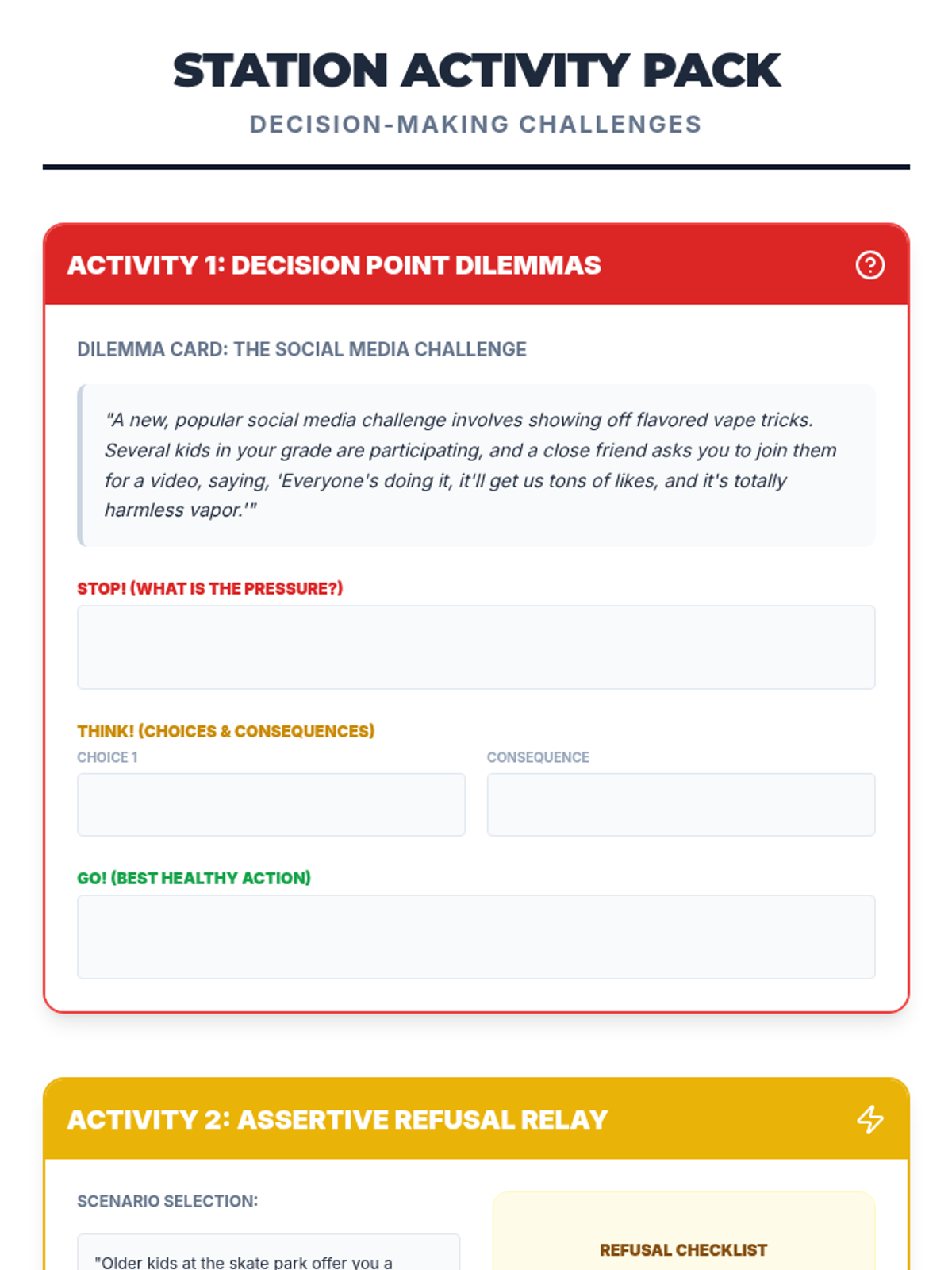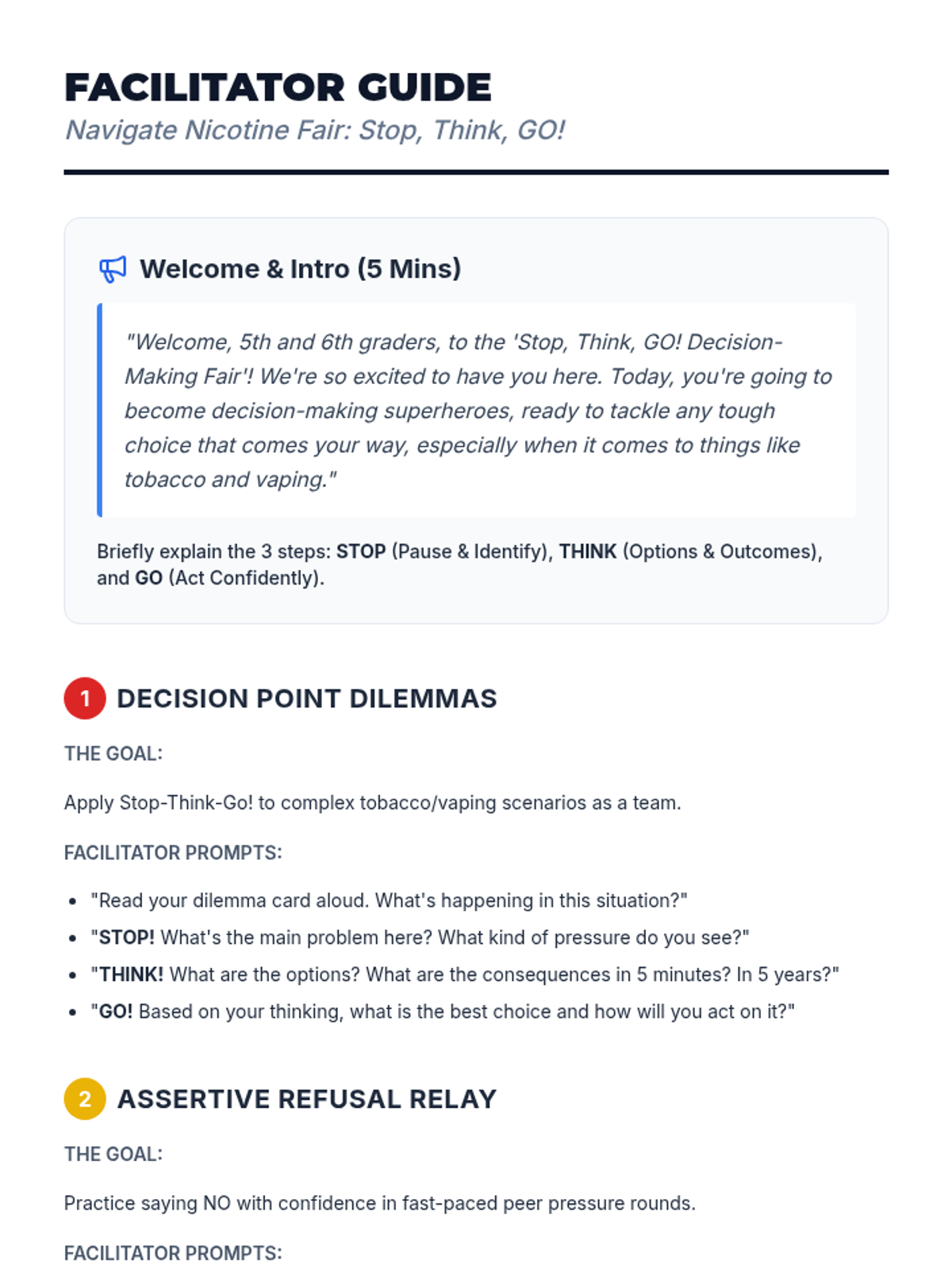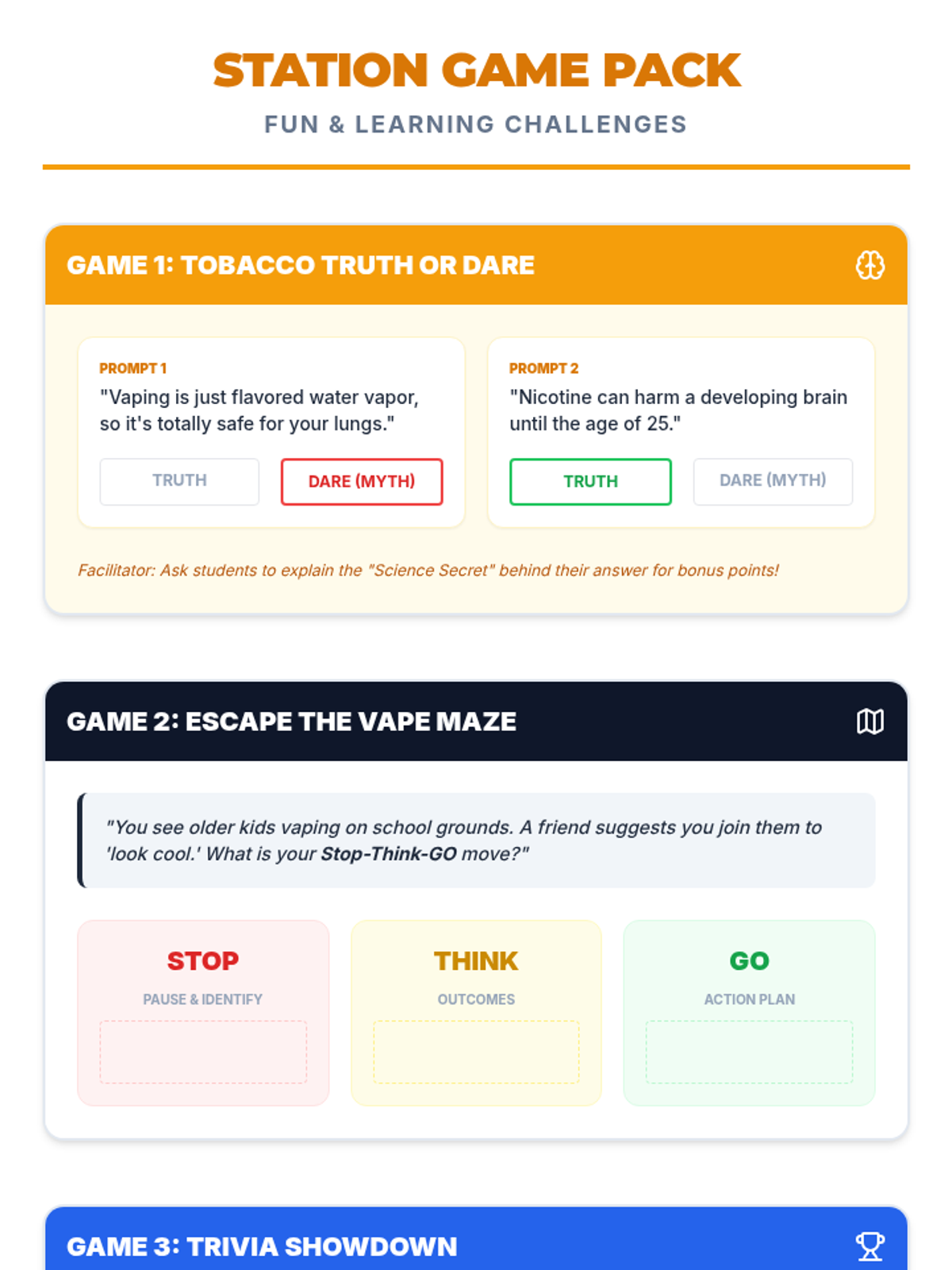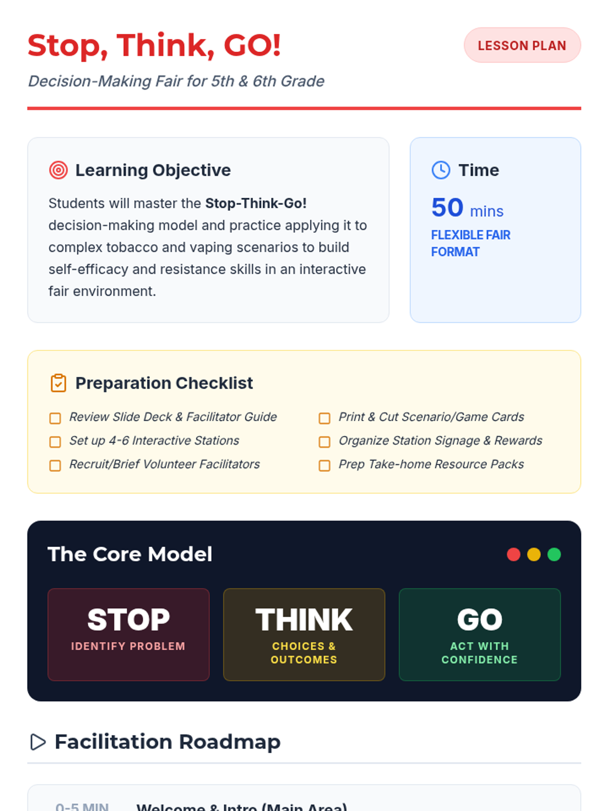 A 50-minute interactive fair-style lesson for 5th and 6th graders to master the Stop-Think-Go! decision-making model through high-energy stations and games focused on tobacco and vaping prevention.