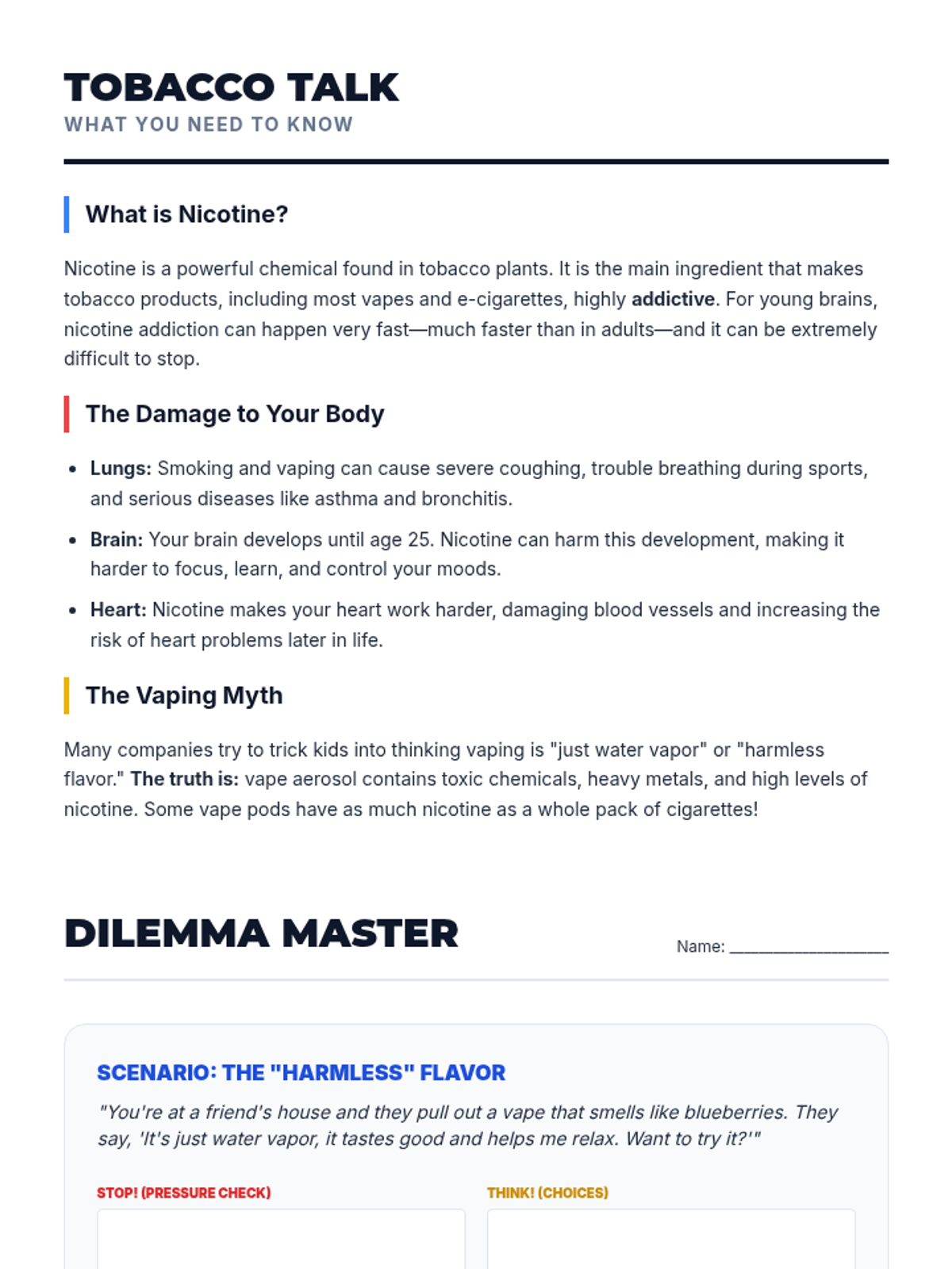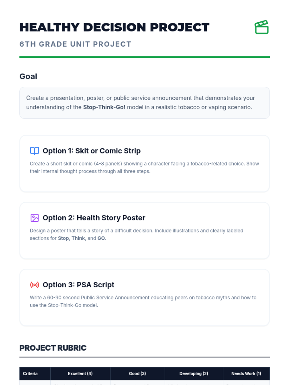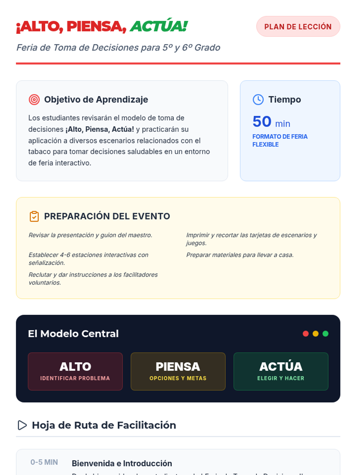 A 50-minute interactive fair-style lesson for 5th and 6th graders to master the Stop-Think-Go! decision-making model through high-energy stations and games focused on tobacco and vaping prevention.