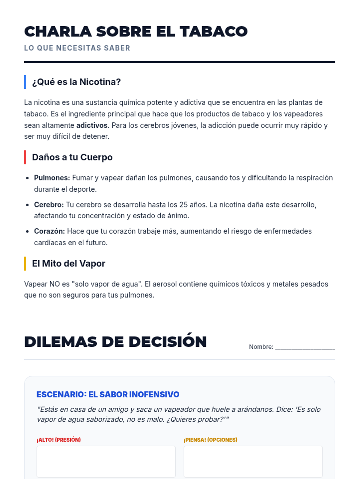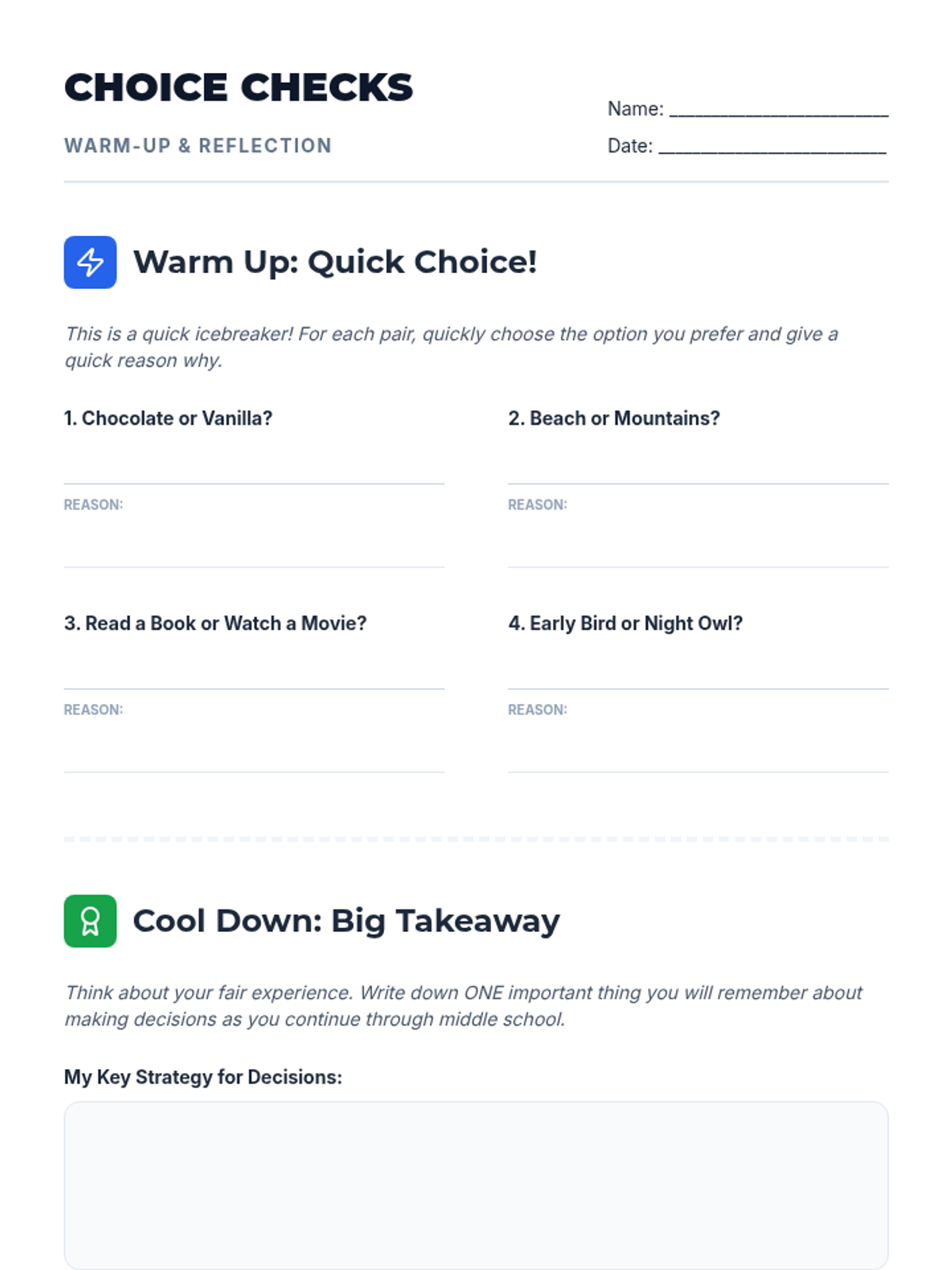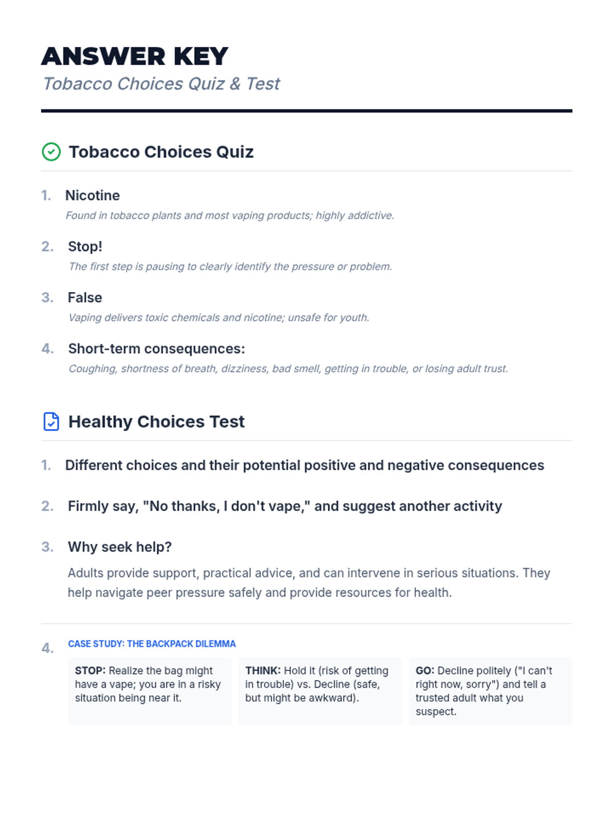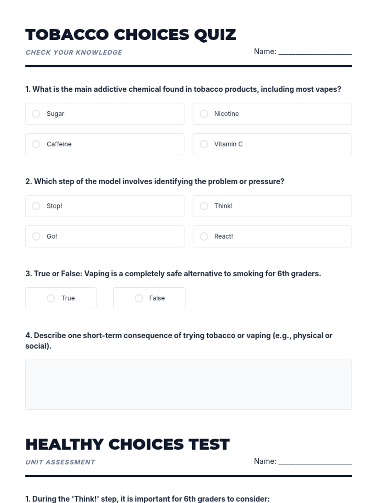 A 50-minute interactive fair-style lesson for 5th and 6th graders to master the Stop-Think-Go! decision-making model through high-energy stations and games focused on tobacco and vaping prevention.
