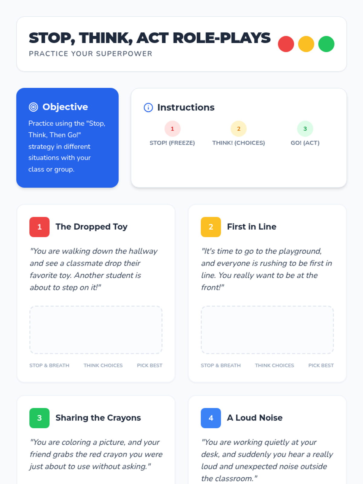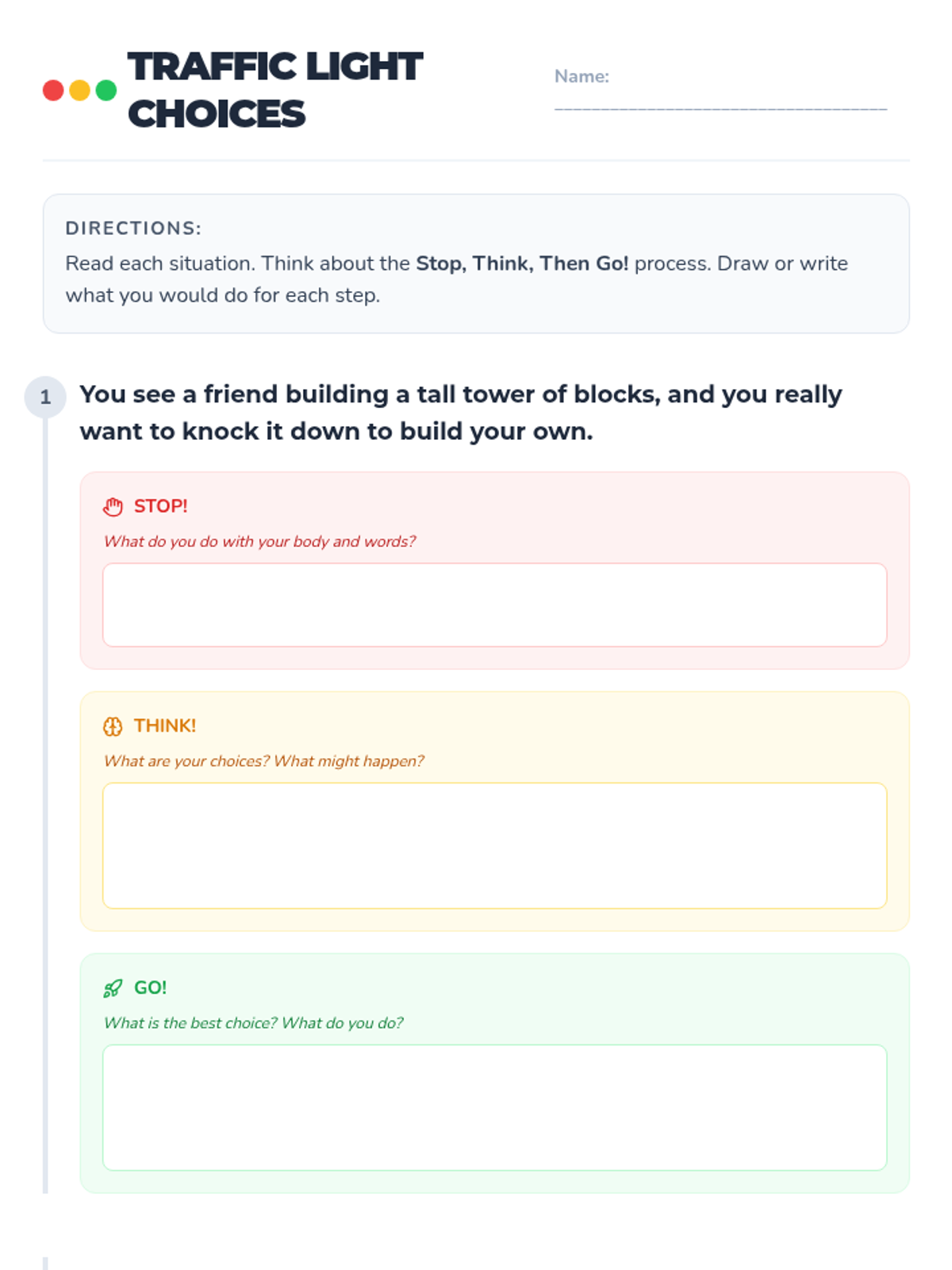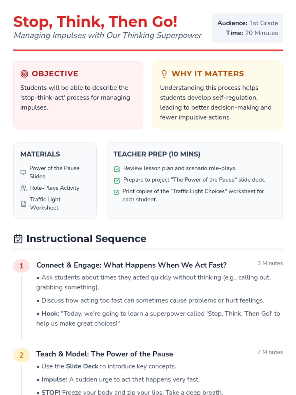 A 20-minute SEL lesson for 1st-grade students that teaches the 'stop-think-act' process to manage impulses using a traffic light metaphor.
