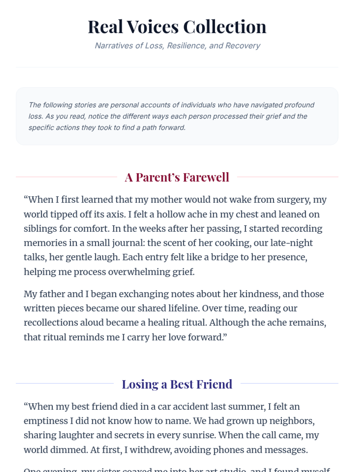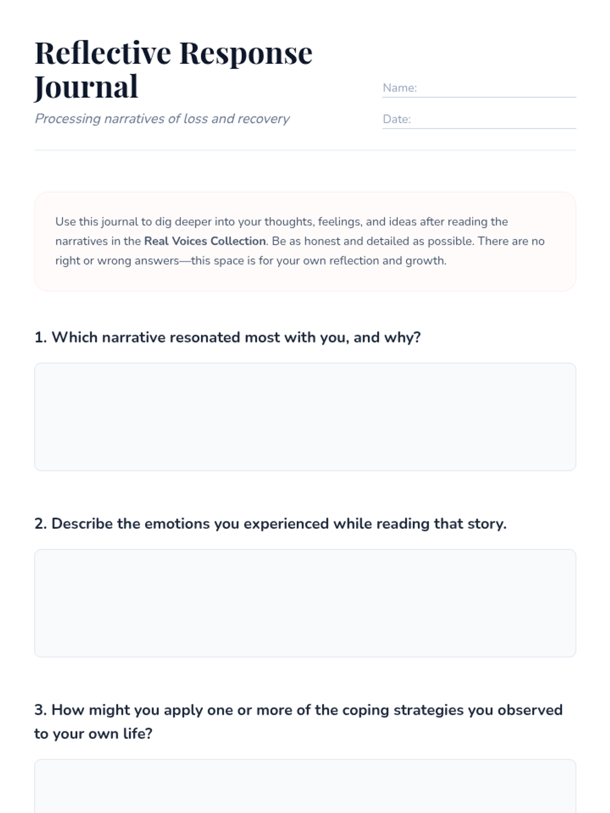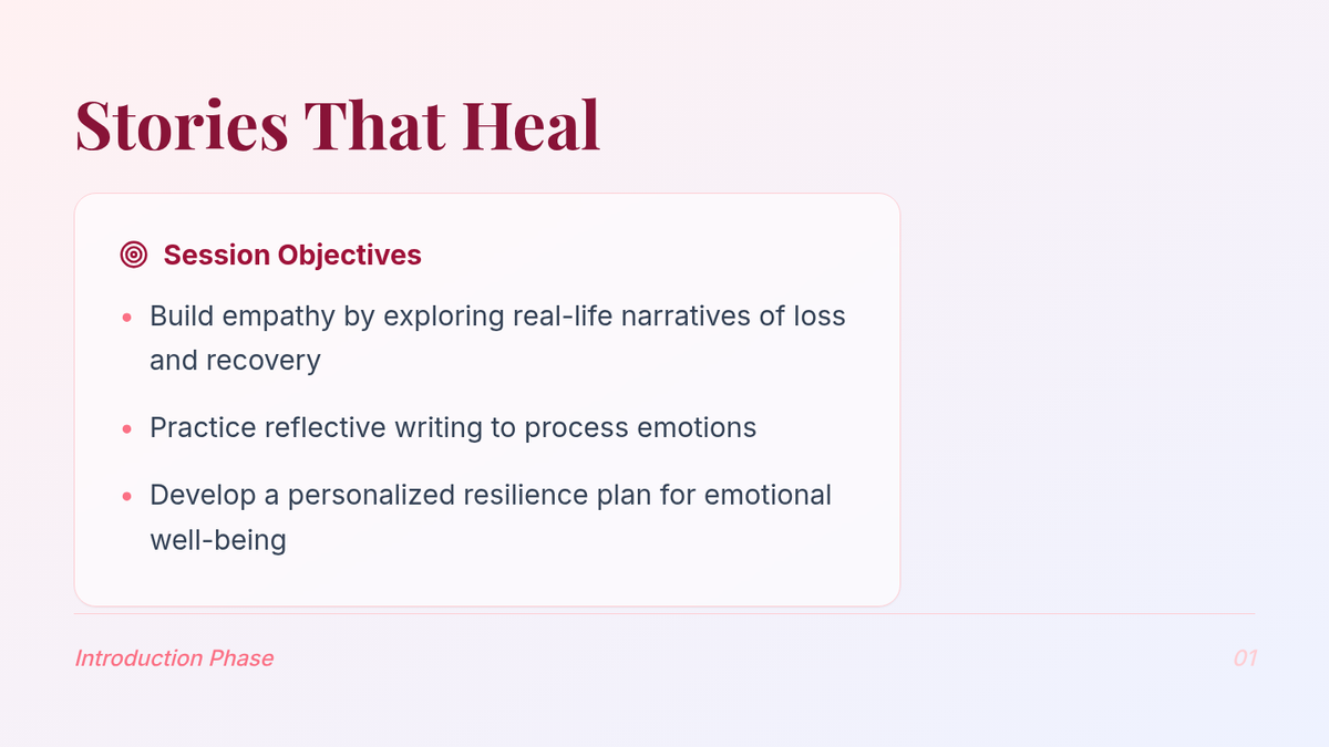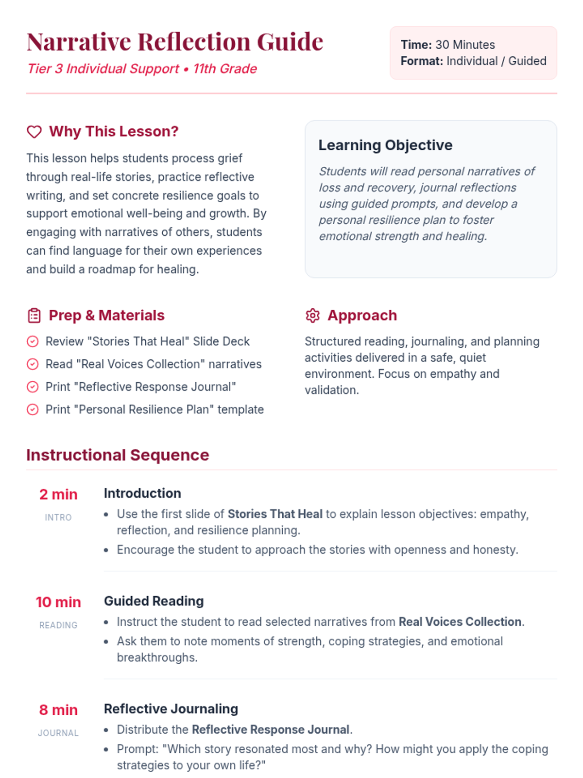 An individual Tier 3 lesson for 11th-grade students focused on processing grief through narratives, reflective writing, and resilience planning. Students explore stories of loss and recovery to build empathy and develop personal coping strategies.