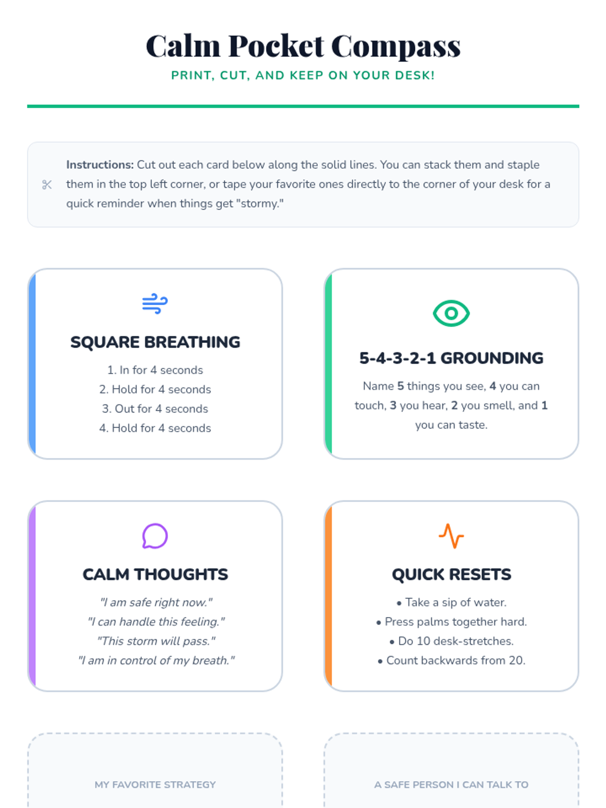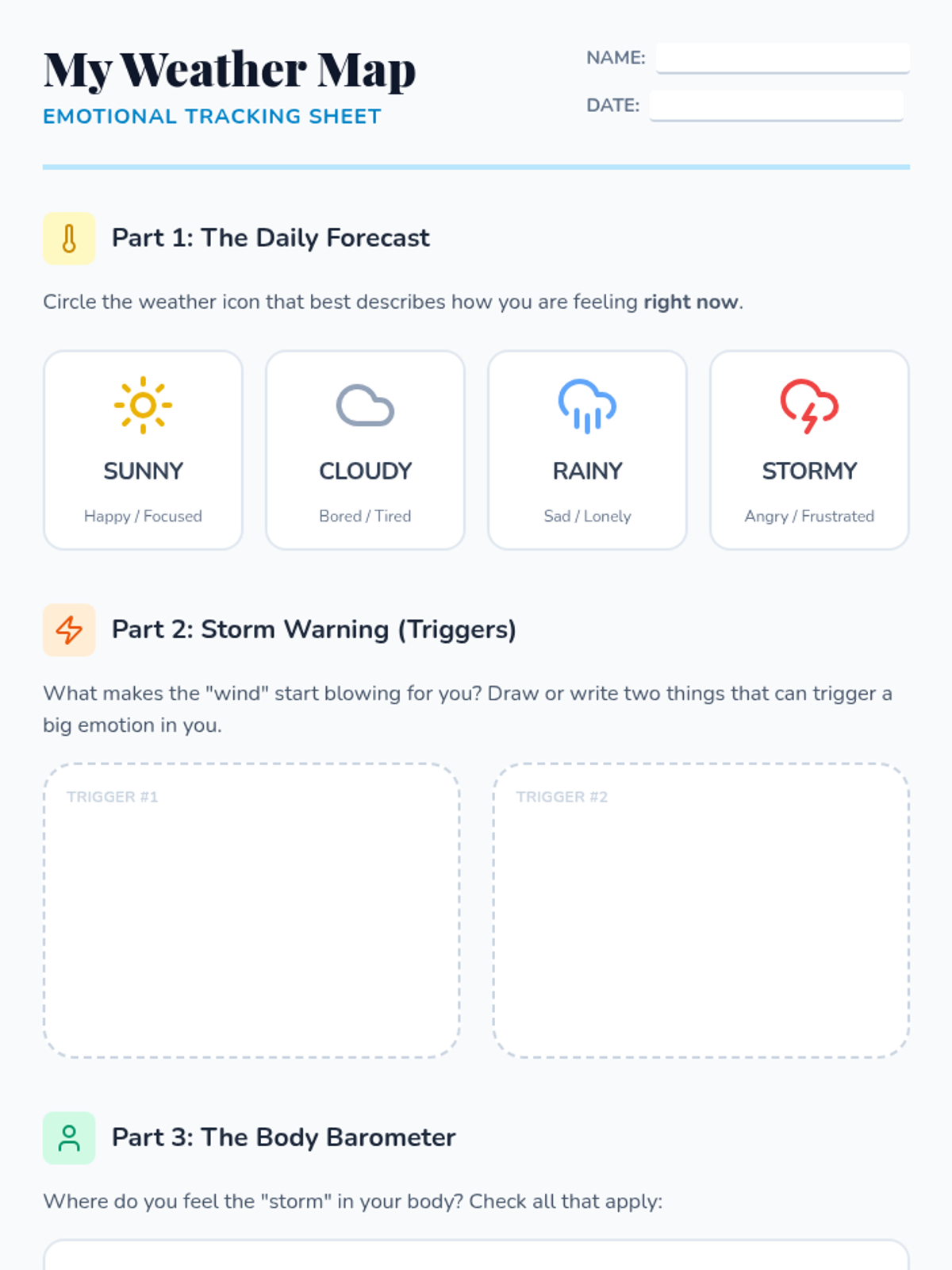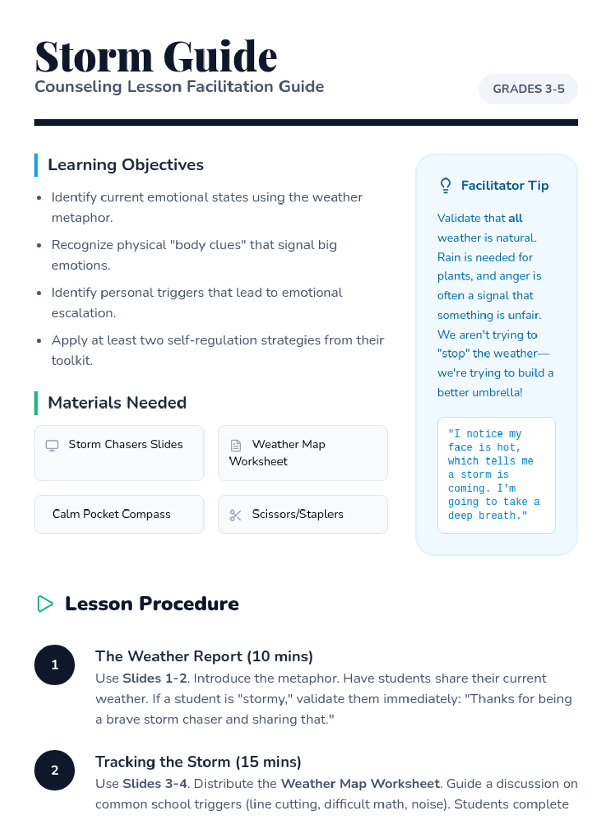 A counseling lesson for grades 3-5 focusing on identifying emotional 'weather' (feelings), understanding triggers, and building a toolkit of calming strategies. Students will create personal desk resources for self-regulation.