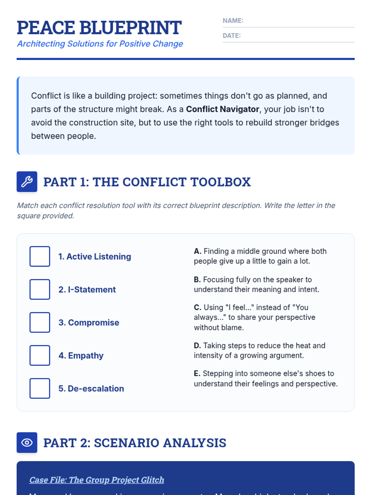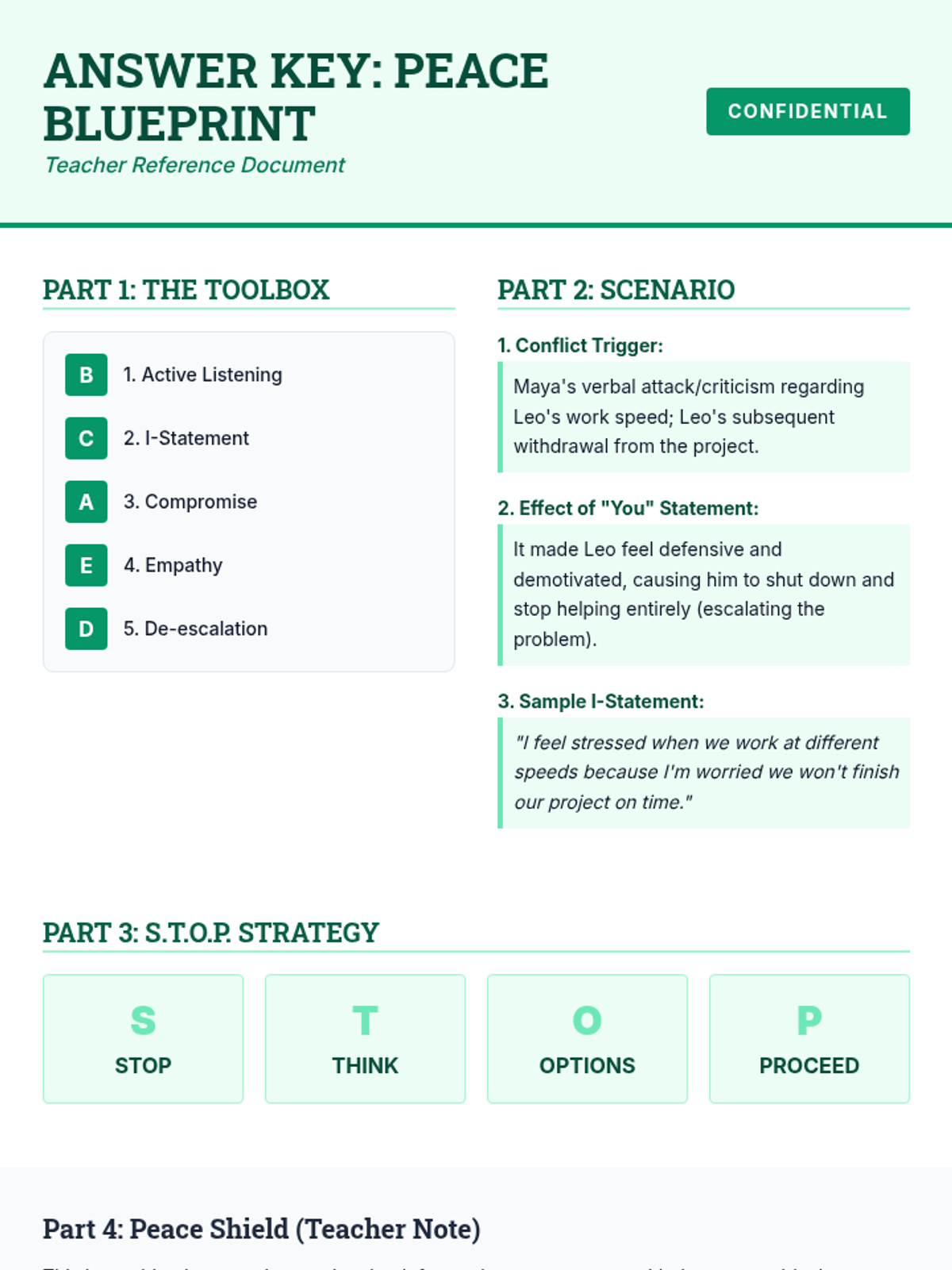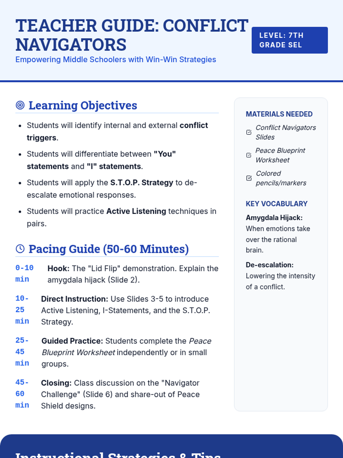 A lesson focused on equipping middle schoolers with practical strategies for de-escalating disagreements and finding win-win solutions. Students explore communication tools like I-statements and active listening through scenarios and creative reflection.