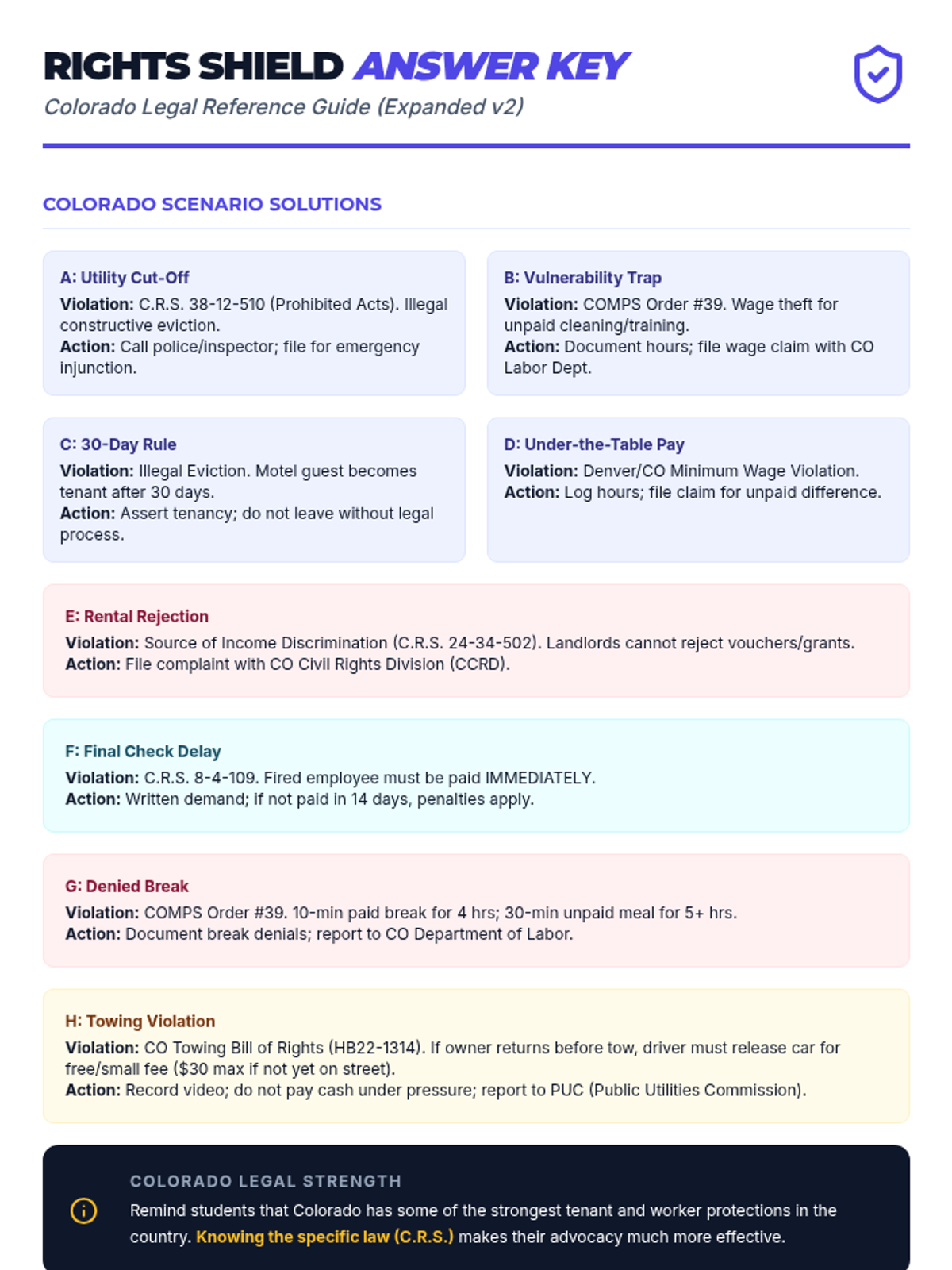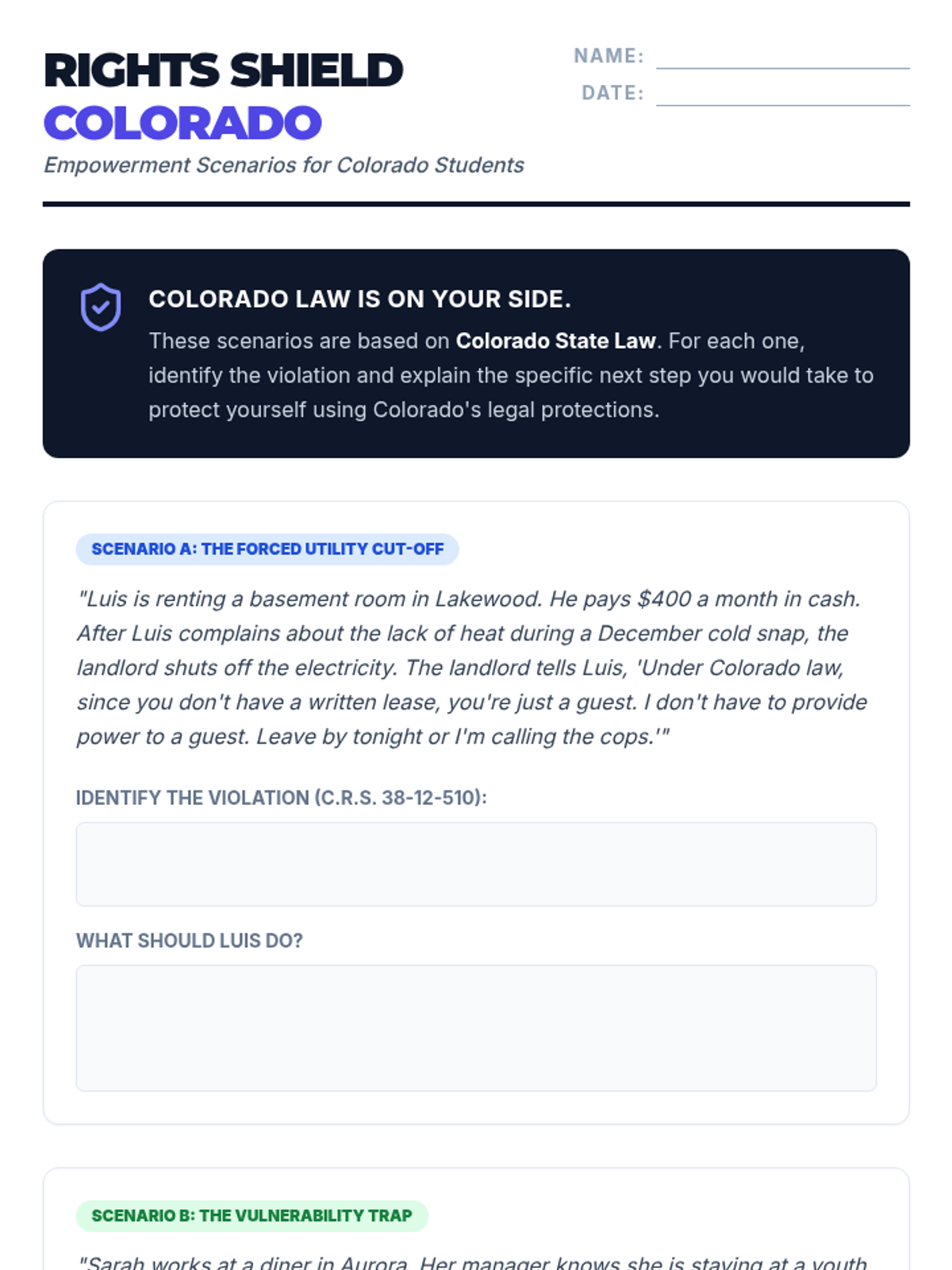 A practical empowerment lesson teaching homeless high school students their fundamental rights as tenants and employees through real-world scenarios and key terminology.