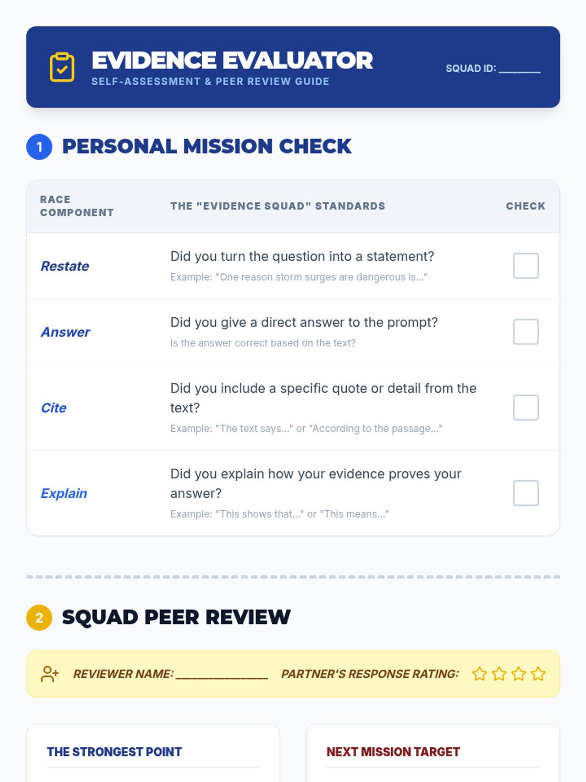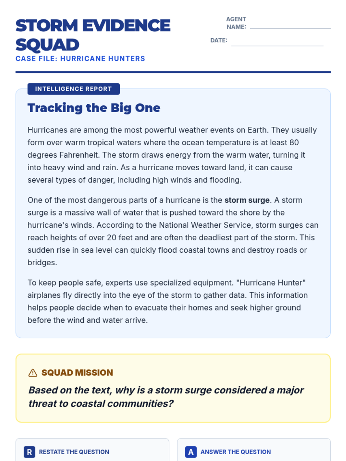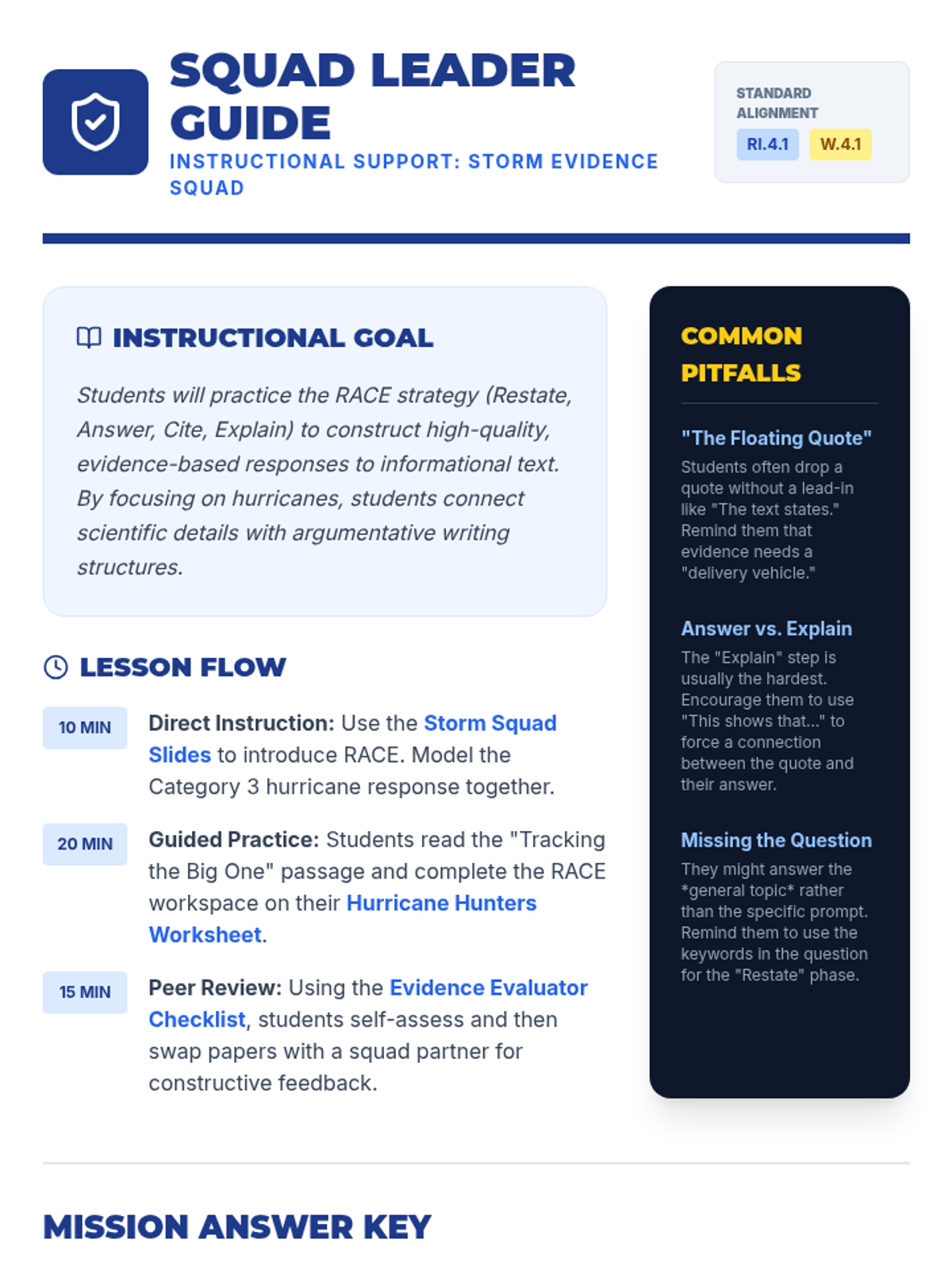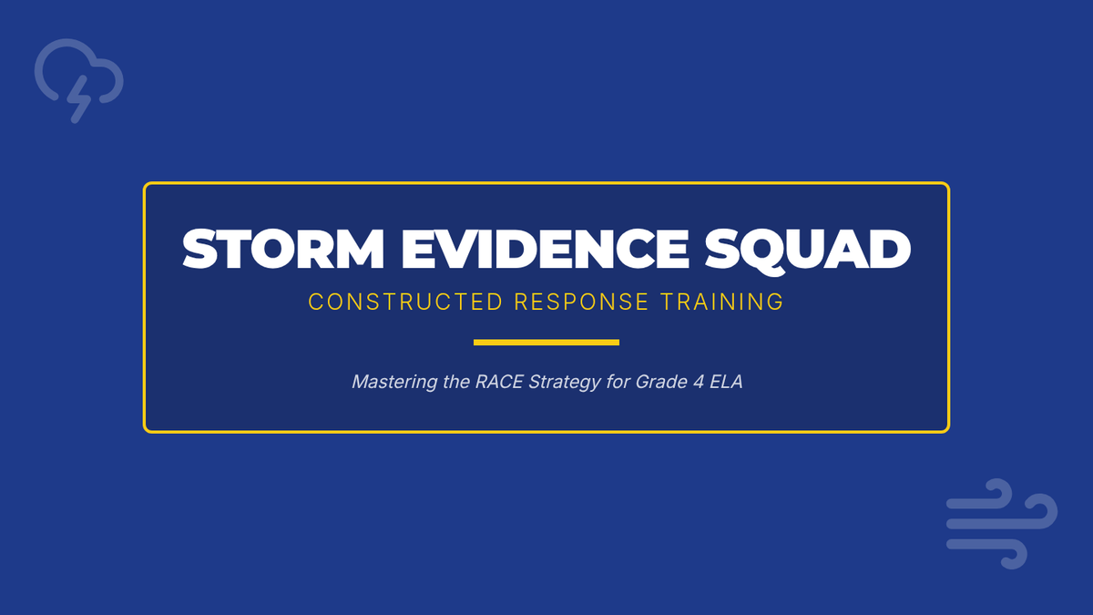 A Grade 4 ELA lesson focusing on the RACE strategy for constructed responses, using hurricane-themed informational text to practice citing evidence and explaining reasoning.