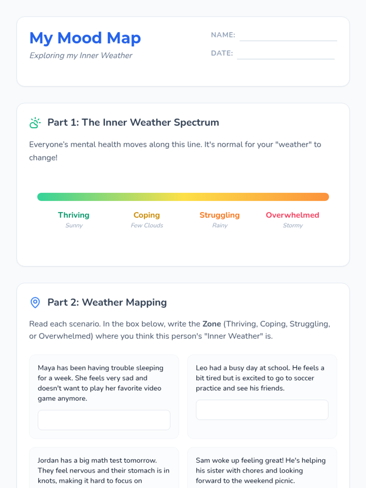 A creative art-based activity designed for middle school students who are hesitant to communicate verbally. This lesson uses a meteorological metaphor to help students map out their stressors and triggers through drawing rather than direct conversation.