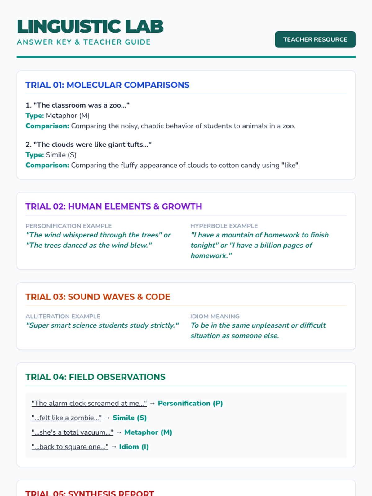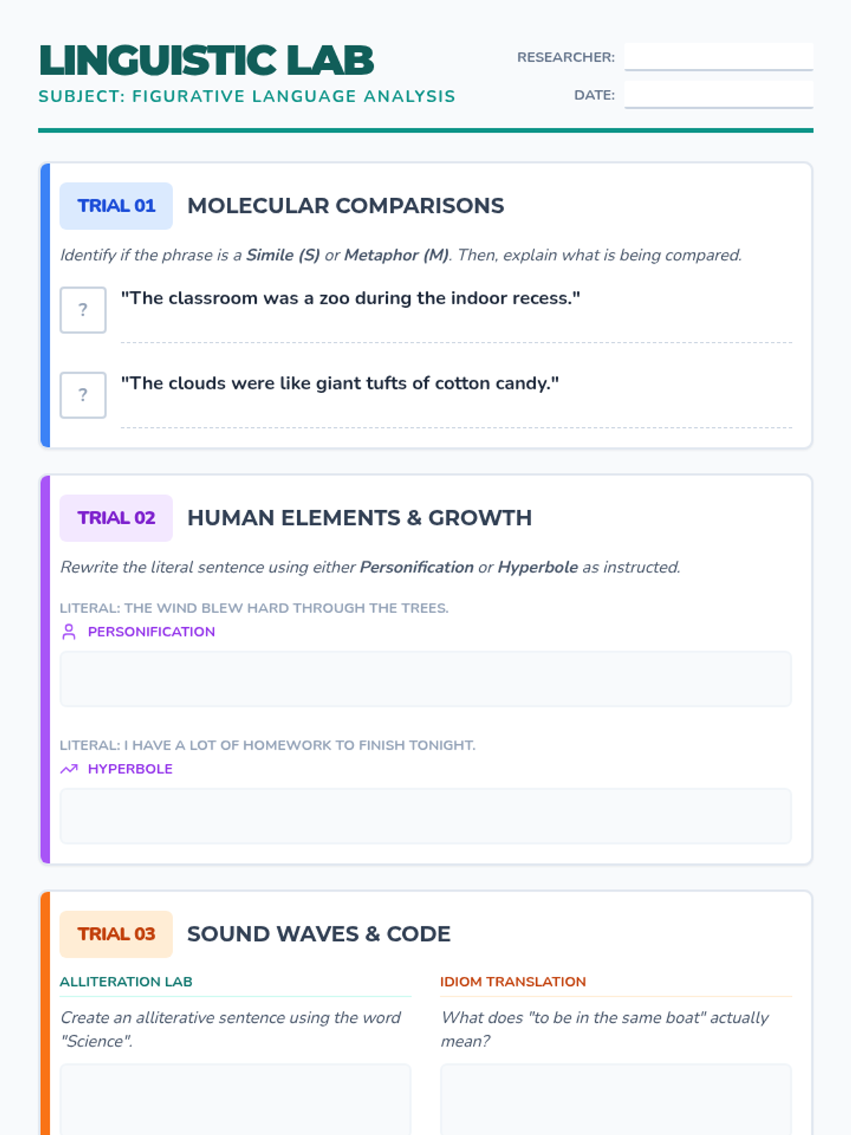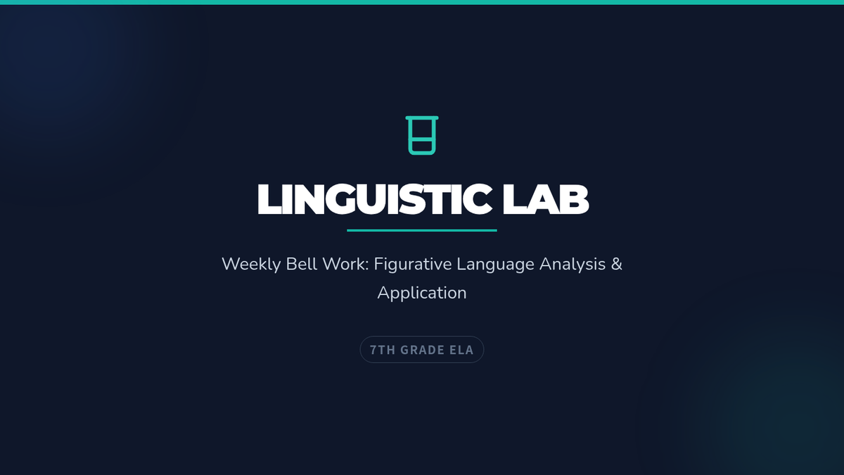 A week of daily bell ringers designed to reinforce core figurative language concepts (similes, metaphors, personification, hyperbole, alliteration, and idioms) through a scientific lab-themed analysis and application.