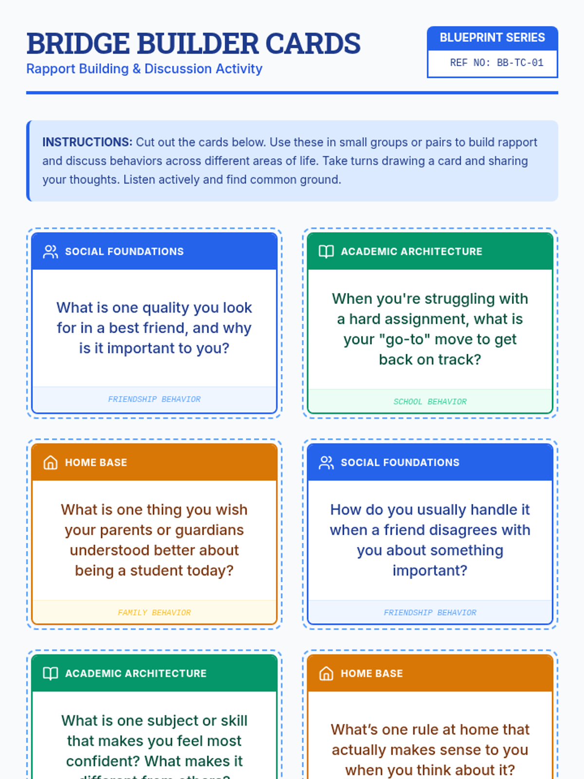 A lesson focused on building rapport and reflecting on social, academic, and familial behaviors through structured discussion and personal journaling.