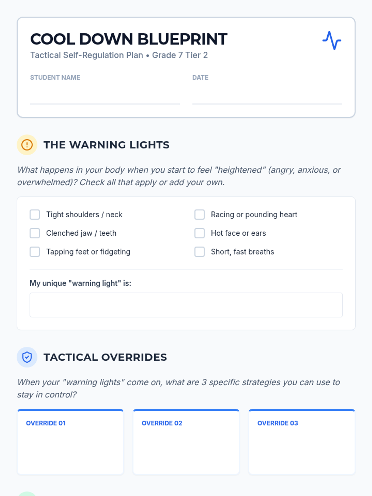 A targeted 30-minute SEL lesson for 7th-grade Tier 2 groups focusing on identifying personal triggers and building a customized self-regulation toolkit. Students will explore body signals and select specific strategies to use when they feel heightened.