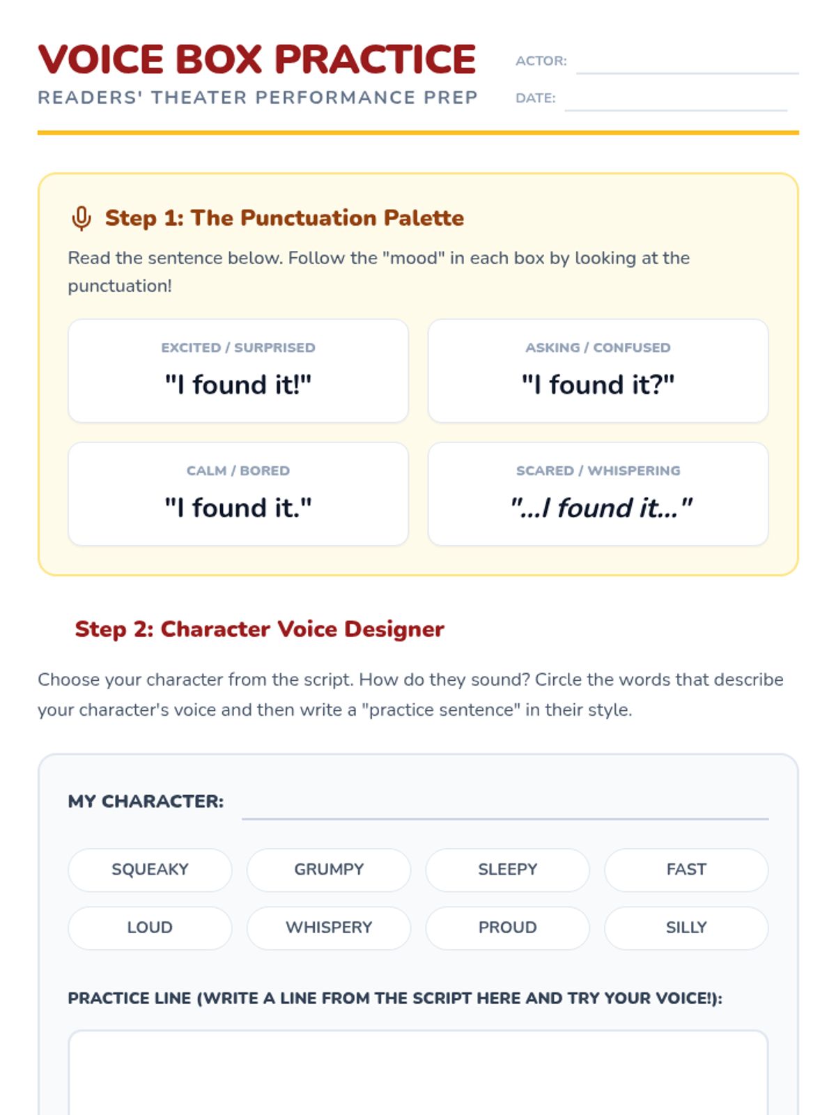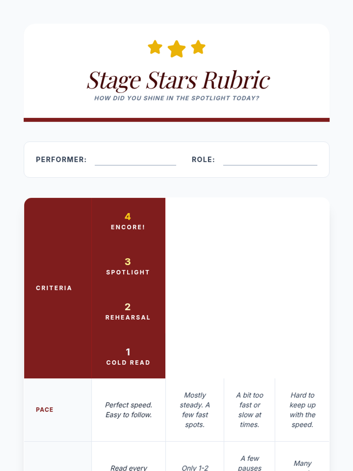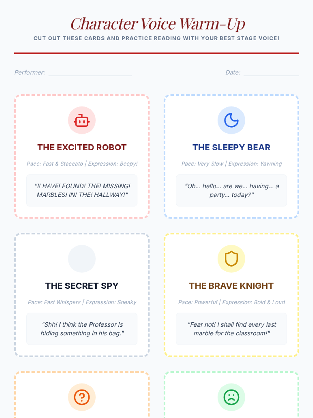 A high-energy workshop where 3rd graders transform into performers to master reading fluency, expression, and character-driven prosody. Students will move from cold readings to confident stage performances.