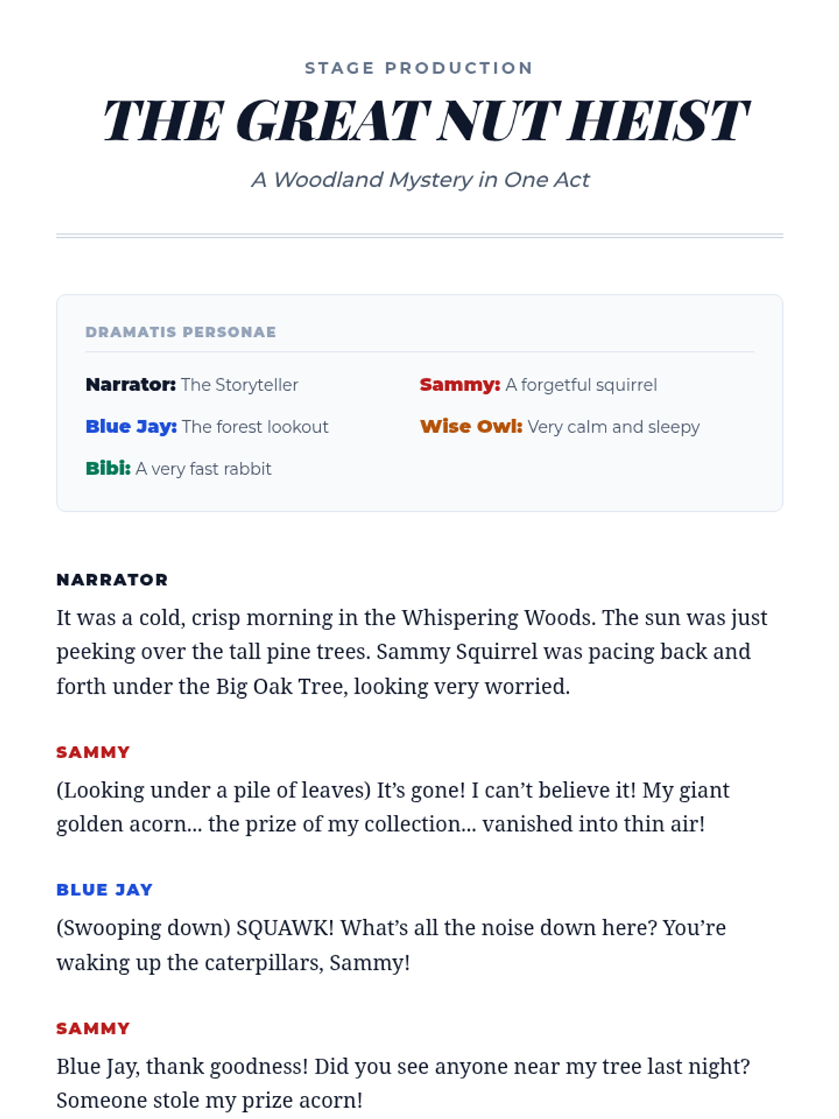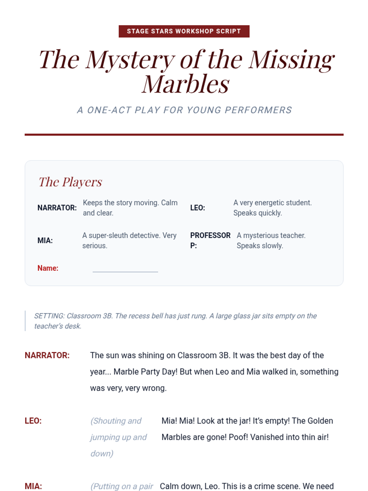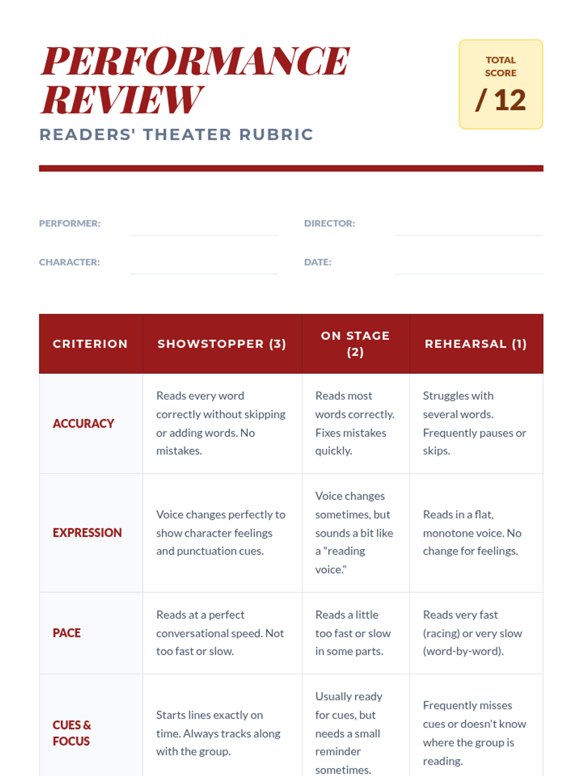 A high-energy workshop where 3rd graders transform into performers to master reading fluency, expression, and character-driven prosody. Students will move from cold readings to confident stage performances.