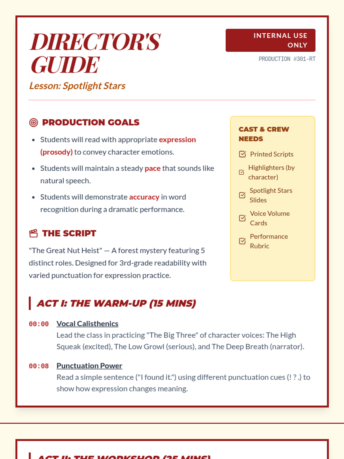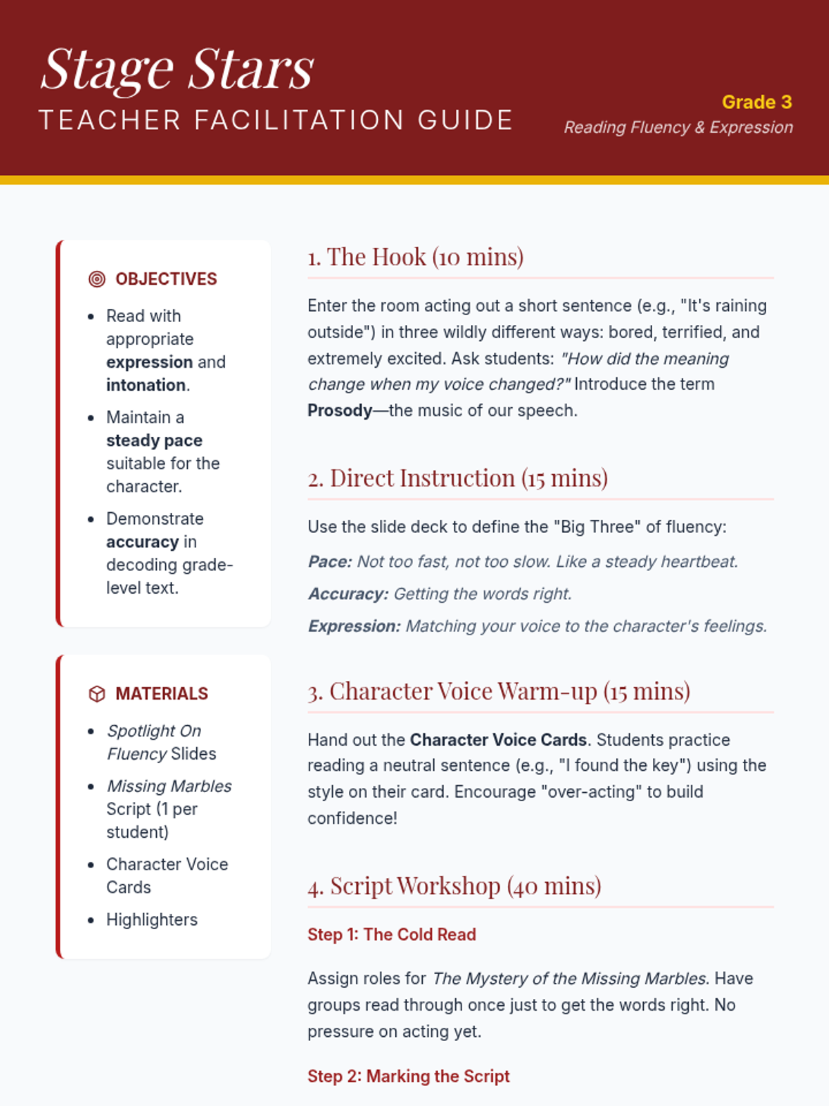 A comprehensive workshop designed to transform 3rd graders into confident performers through Readers' Theater, focusing on expression, pace, and character development.
