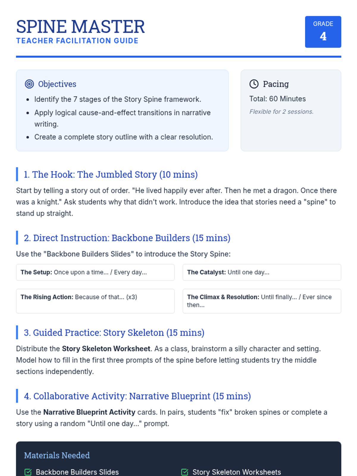 Students will master narrative structure using the 'Story Spine' framework. This lesson guides 4th graders through planning cohesive stories with a logical beginning, middle, and end.