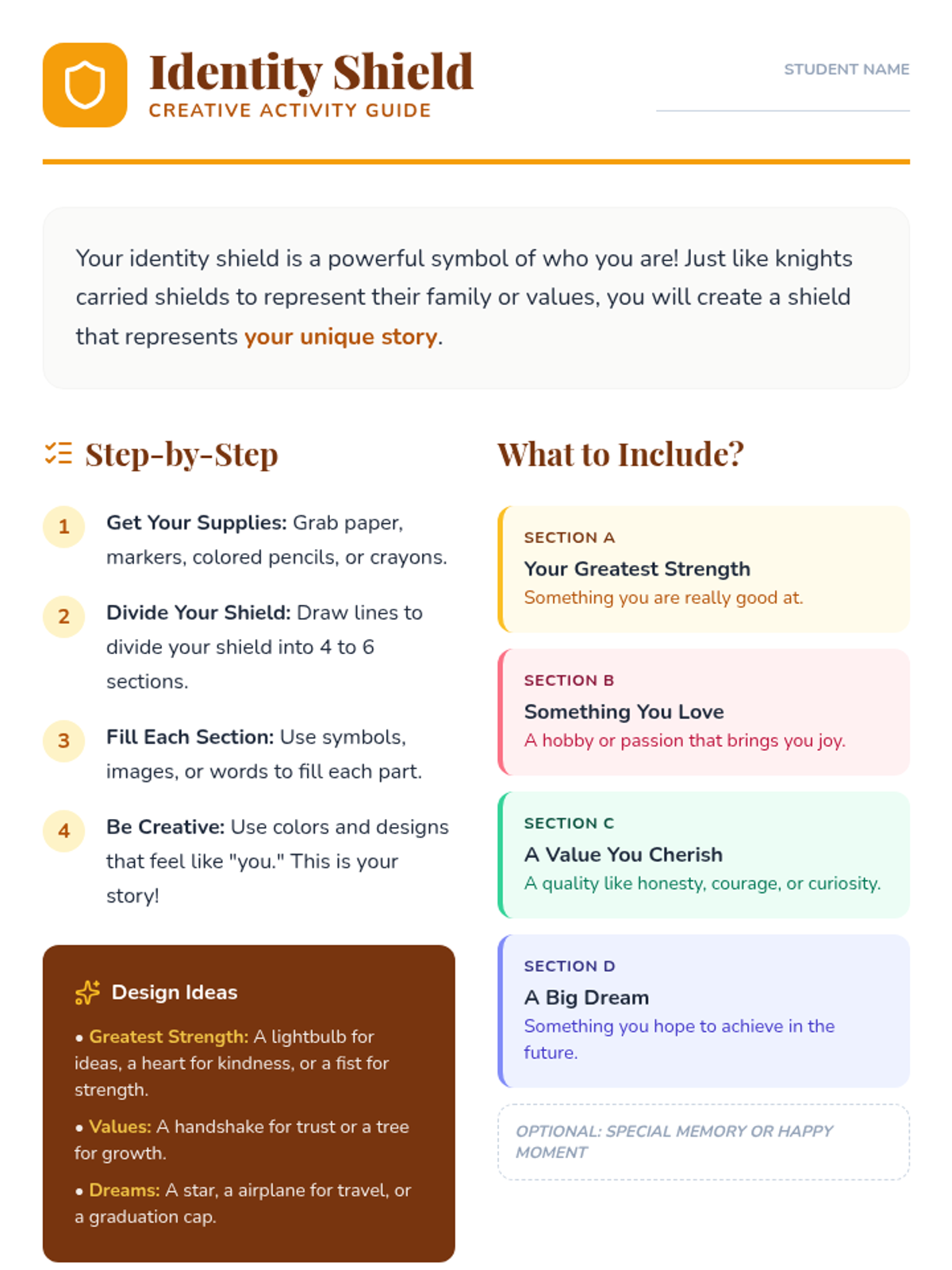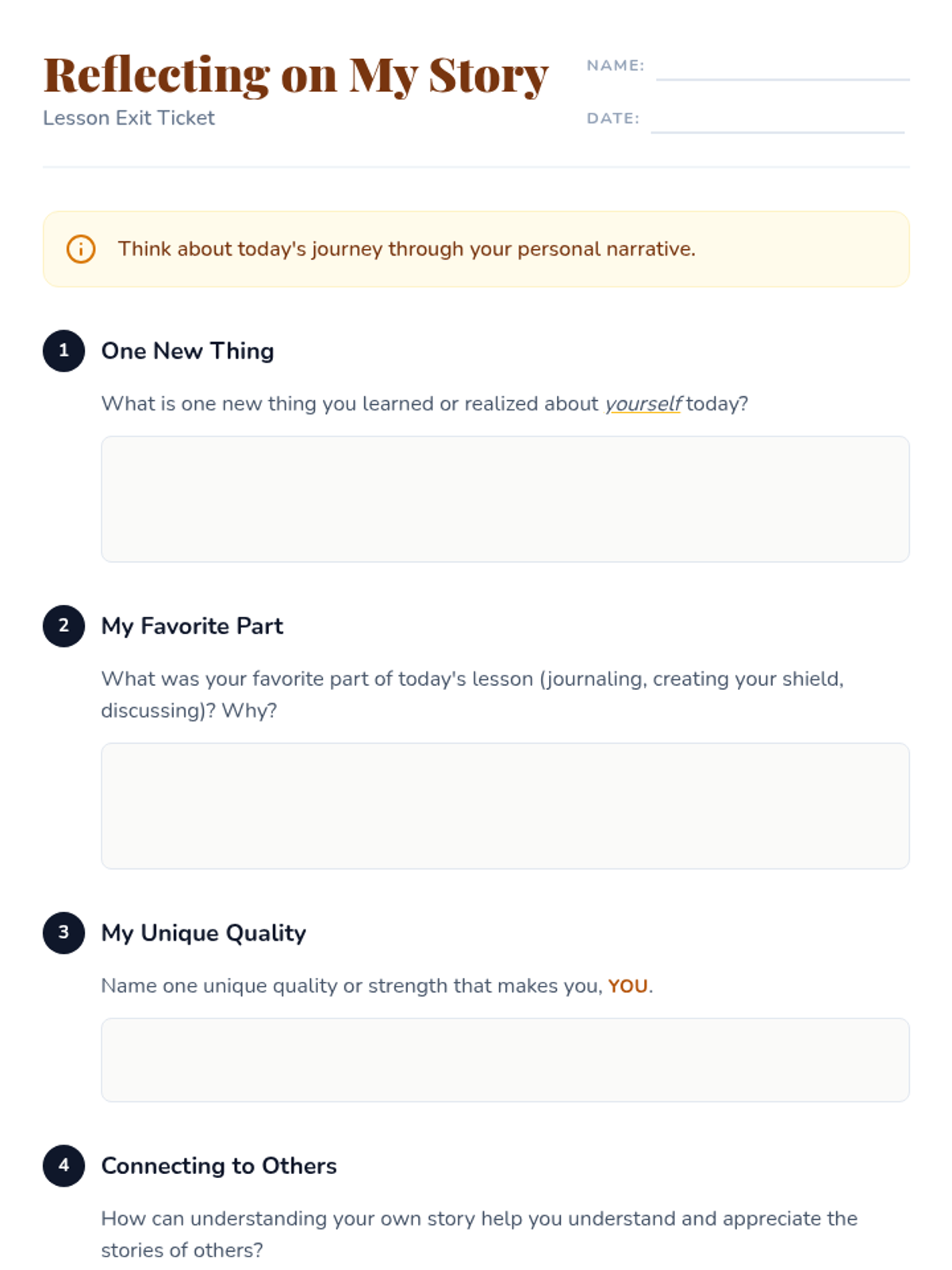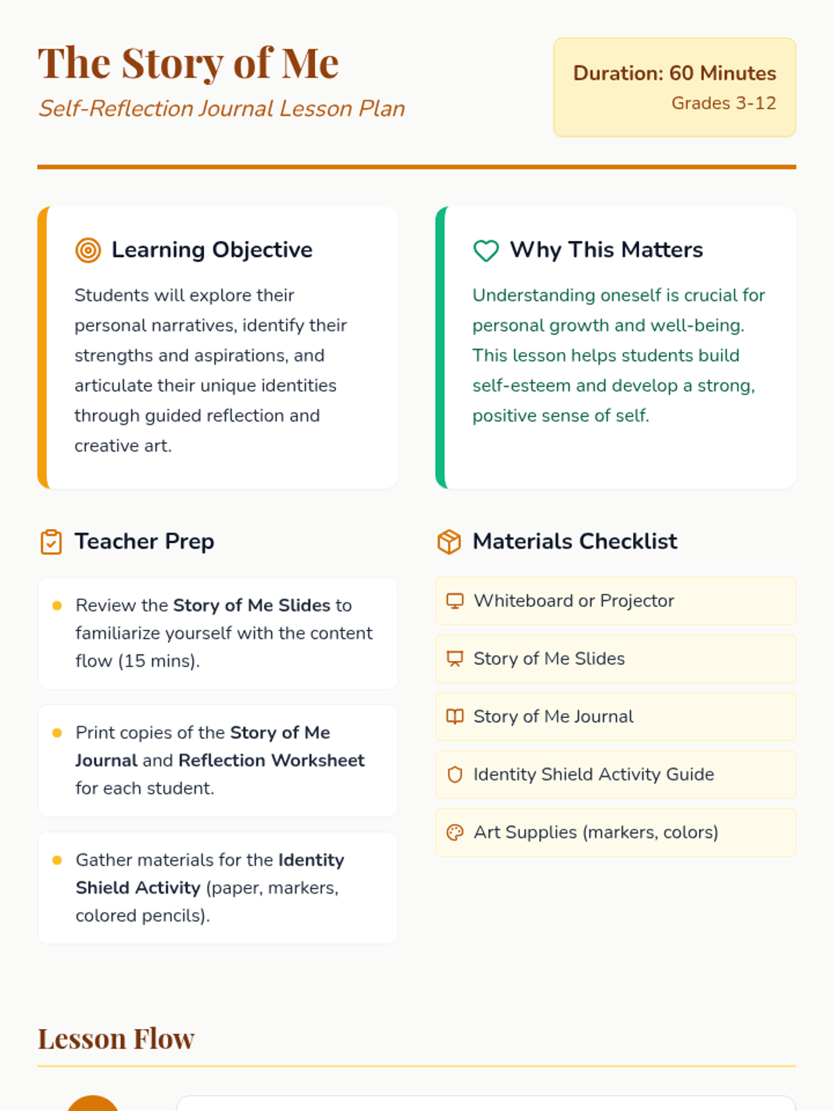 A 60-minute lesson where students explore their personal narratives, strengths, and aspirations through journaling and creative expression to foster self-awareness and self-esteem.