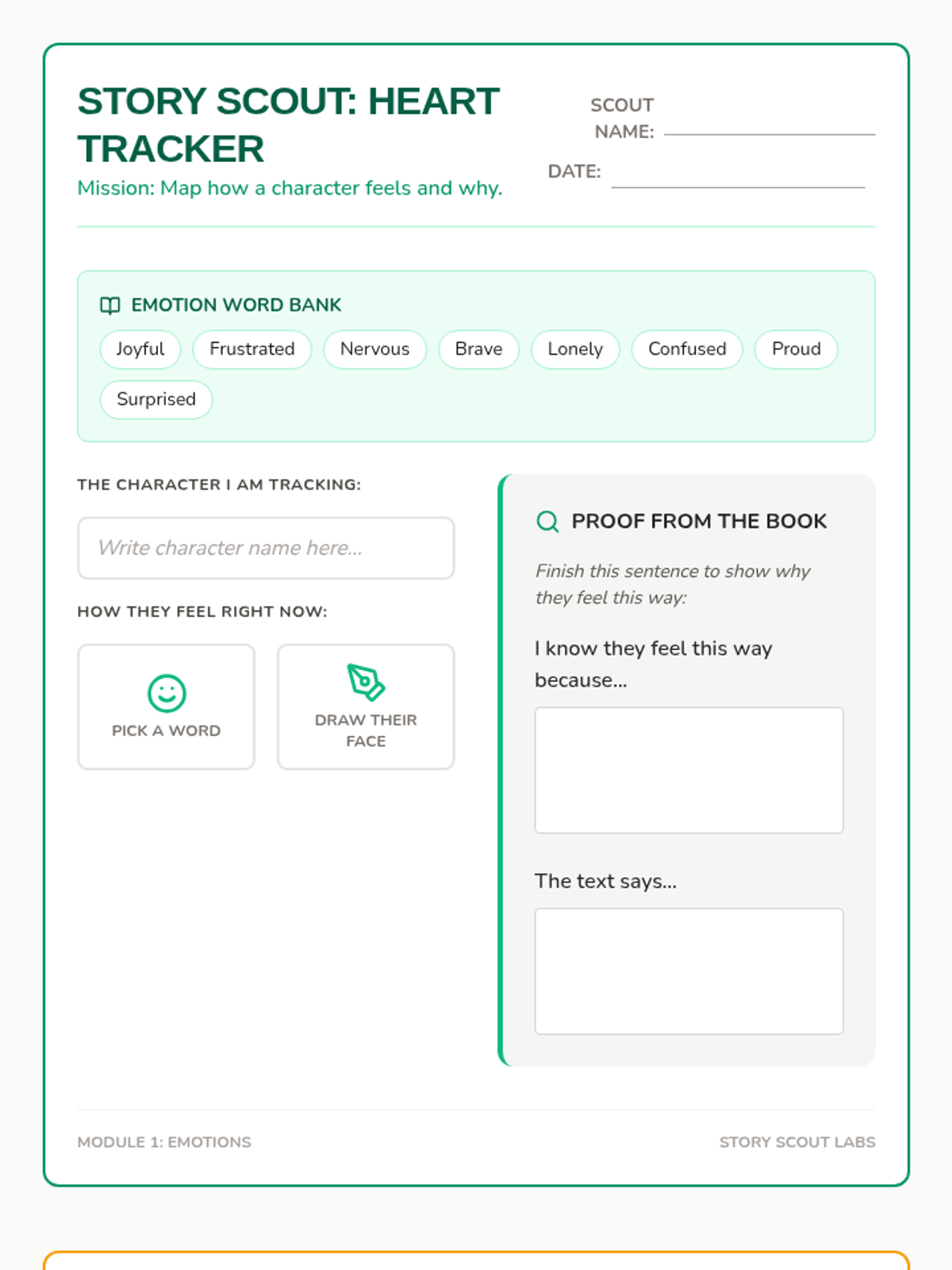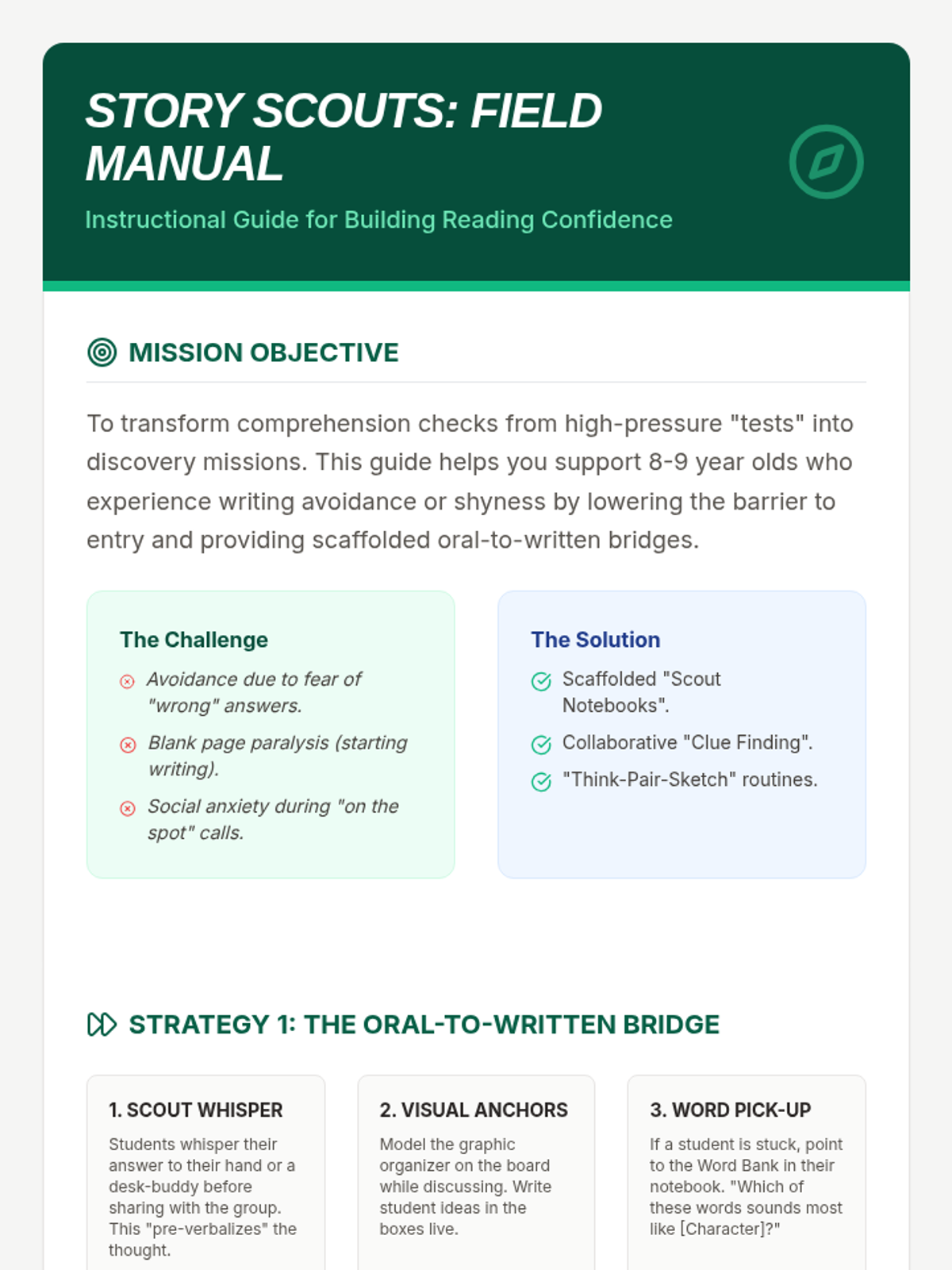A set of scaffolded graphic organizers and instructional tools designed to help 8-9 year olds overcome writing avoidance and build confidence in sharing their reading comprehension insights. The theme uses a 'Story Scout' adventure motif to make analysis feel like a discovery mission.